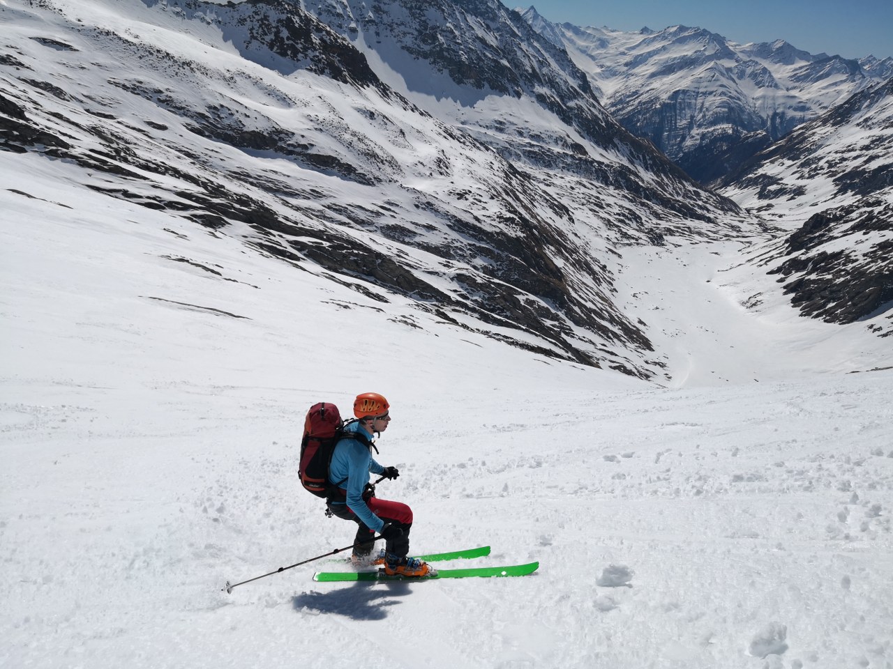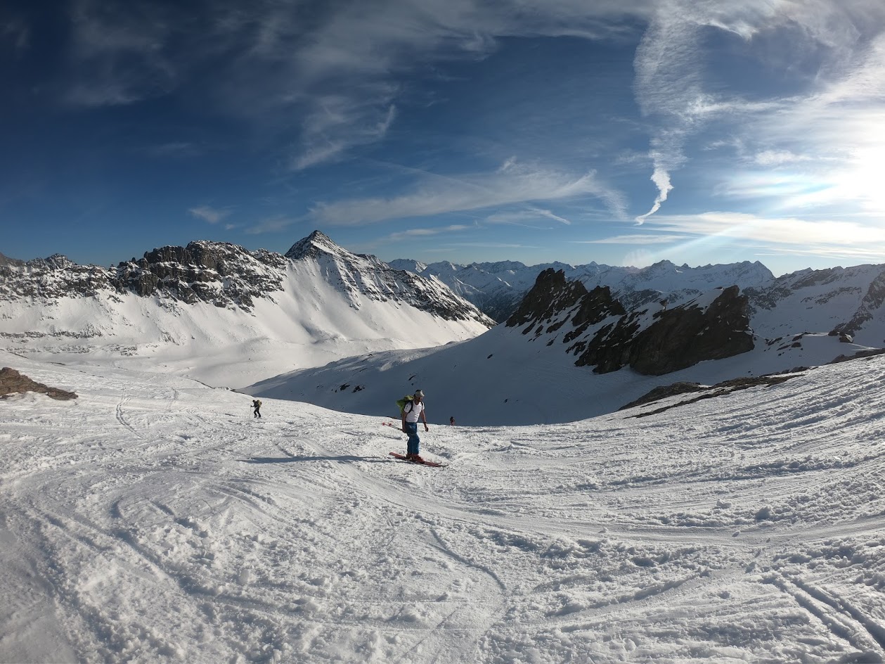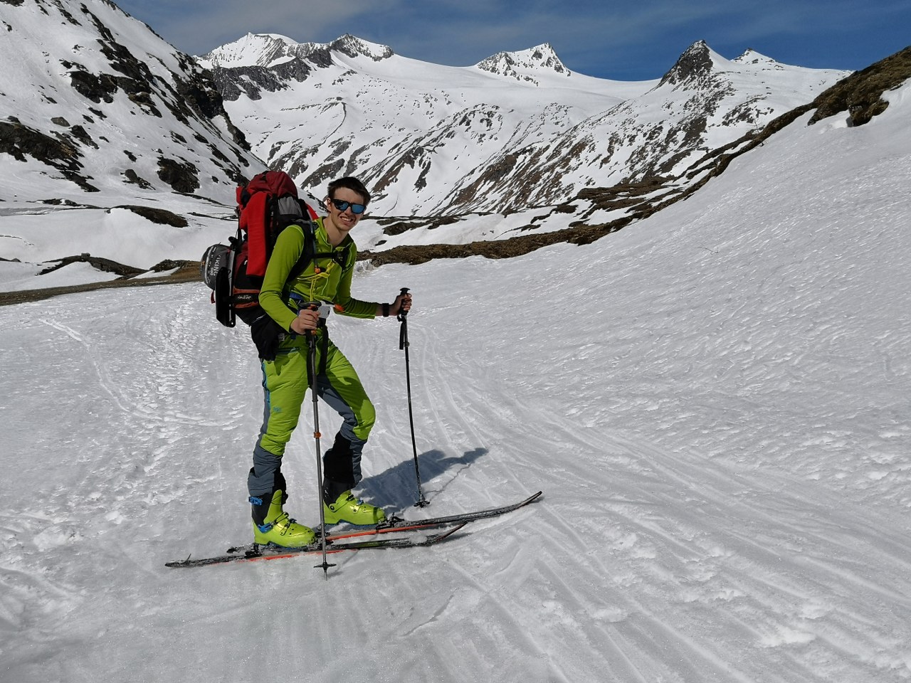V dolino smo odsmučali po zahodni strani ledenika Rainerkees – v dolino potoka Dorferbach. Sneg je bil za smučanje odličen – srenjec. Skozi dolino Dorferbacha se je bilo nato potrebno kakšen kilometer na rahlo poganjati po ravnini. Na običajno pot smo se vrnili pri koče Johannishütte. Od tu dalje do avta ni bilo več dobre smučarije. Smo se (pa z izjemo treh krajših mest) pripeljali na smučeh do avta.