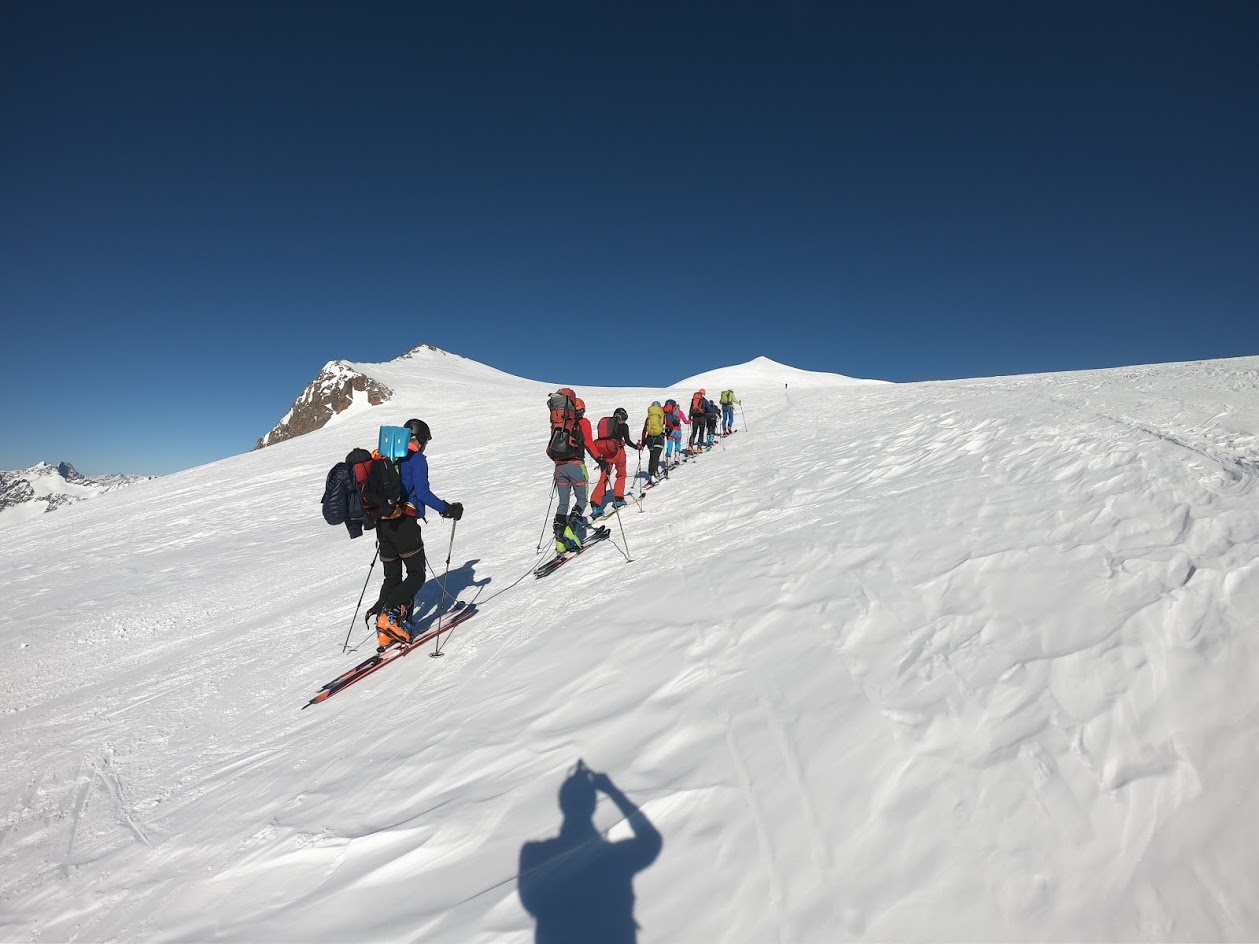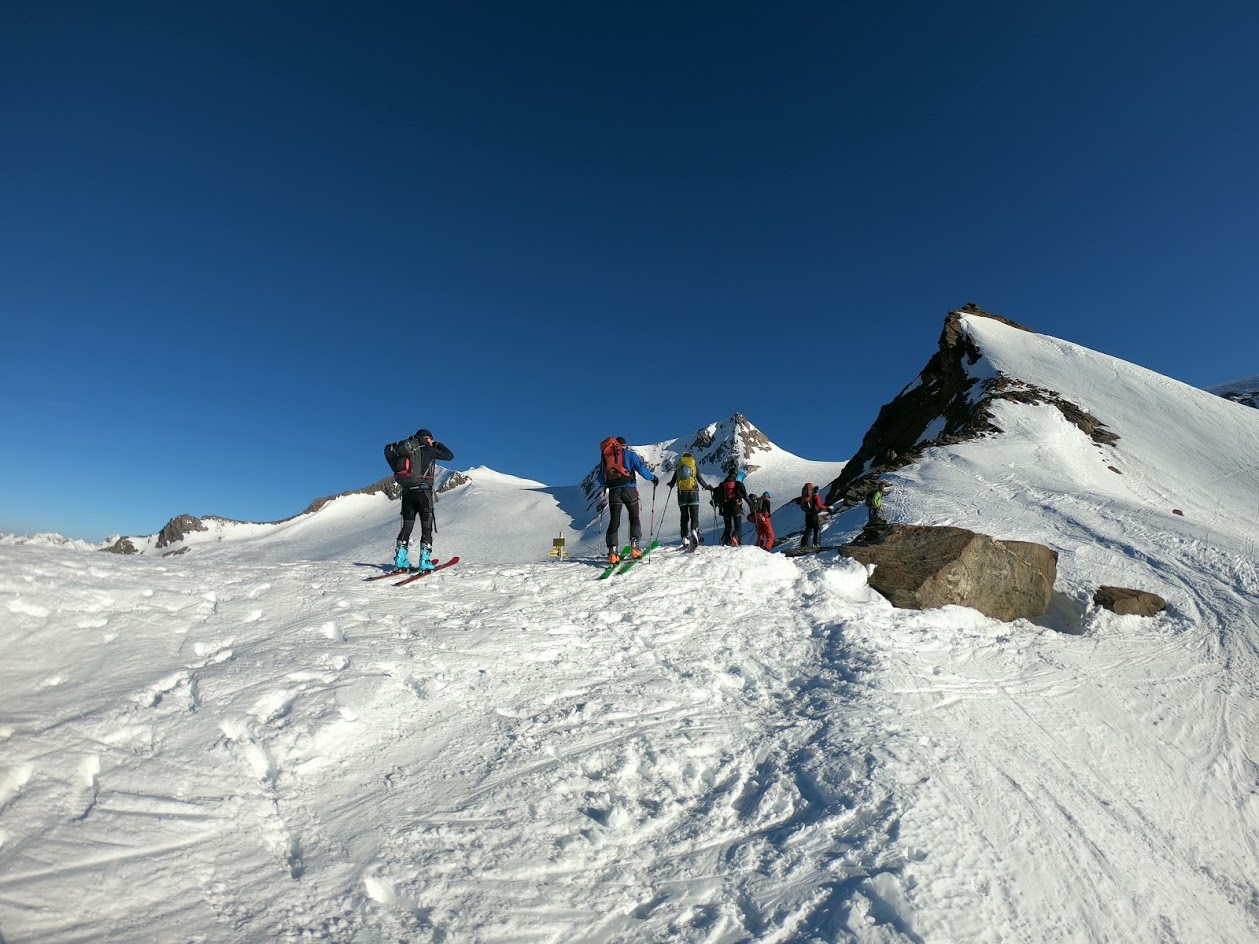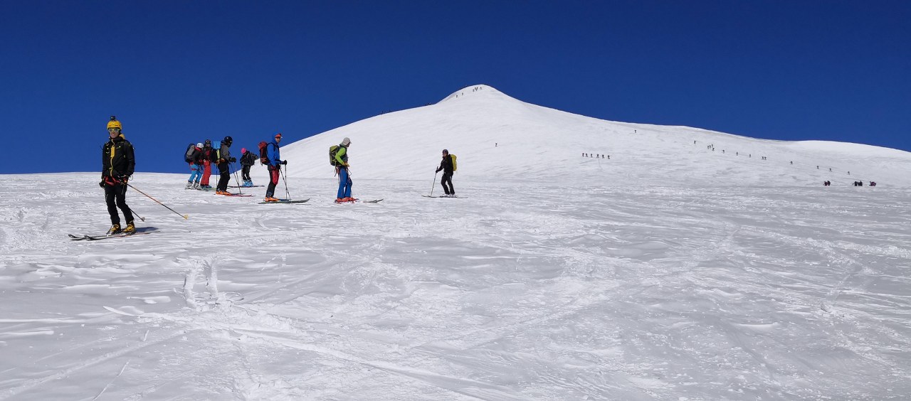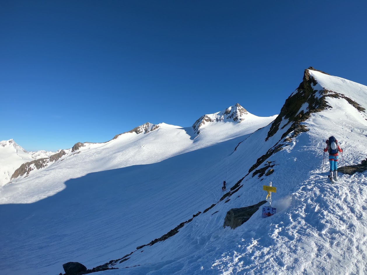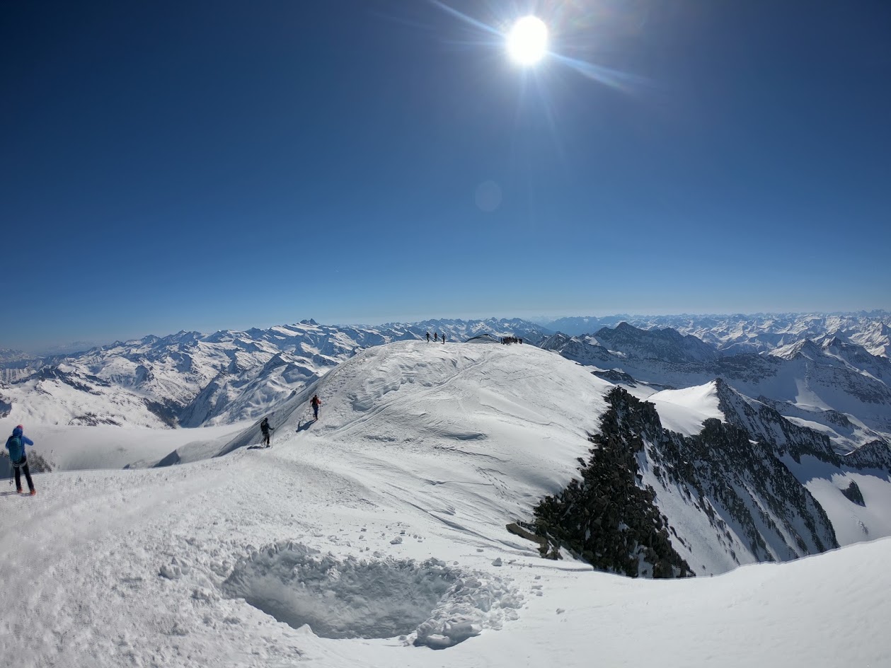 Naslednji dan smo nadaljevali z vzponom proti vrhu Grossvenedigerja. Sneg je bil pomrznjen – brez srenačev ni šlo. Prve pol ure pot poteka ob grebenu, nato pa zavije levo na ledenik Rainerkees. Poleti ima ta ledenik veliko število ledeniških razpok. Trenutno pa so vse globoko pod snegom. Zato je vzpon relativno varen. Ledenik Rainerkees približno na višini 3400 m preide v še bolj položen ledenik Oberer Keesboden. Po njem se brez vseh težav dostopi na vrh gore. Samo zadnjih nekaj 10 m vzpona poteka po ožjem grebenu, ki zahteva nekaj previdnosti. Vreme je bilo ves čas ture fantastično.