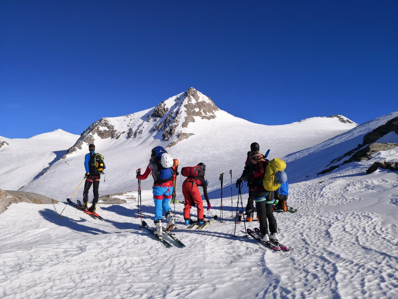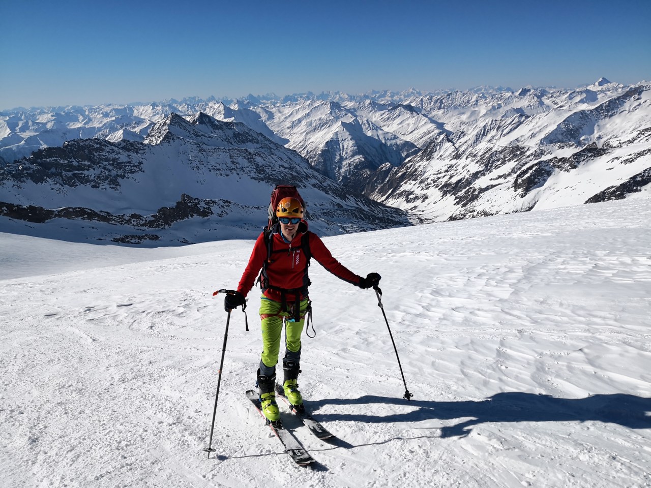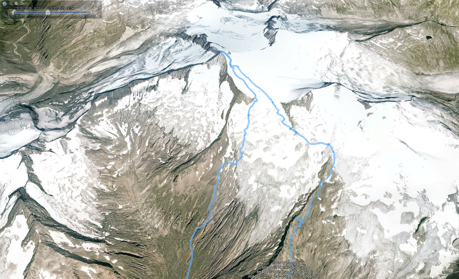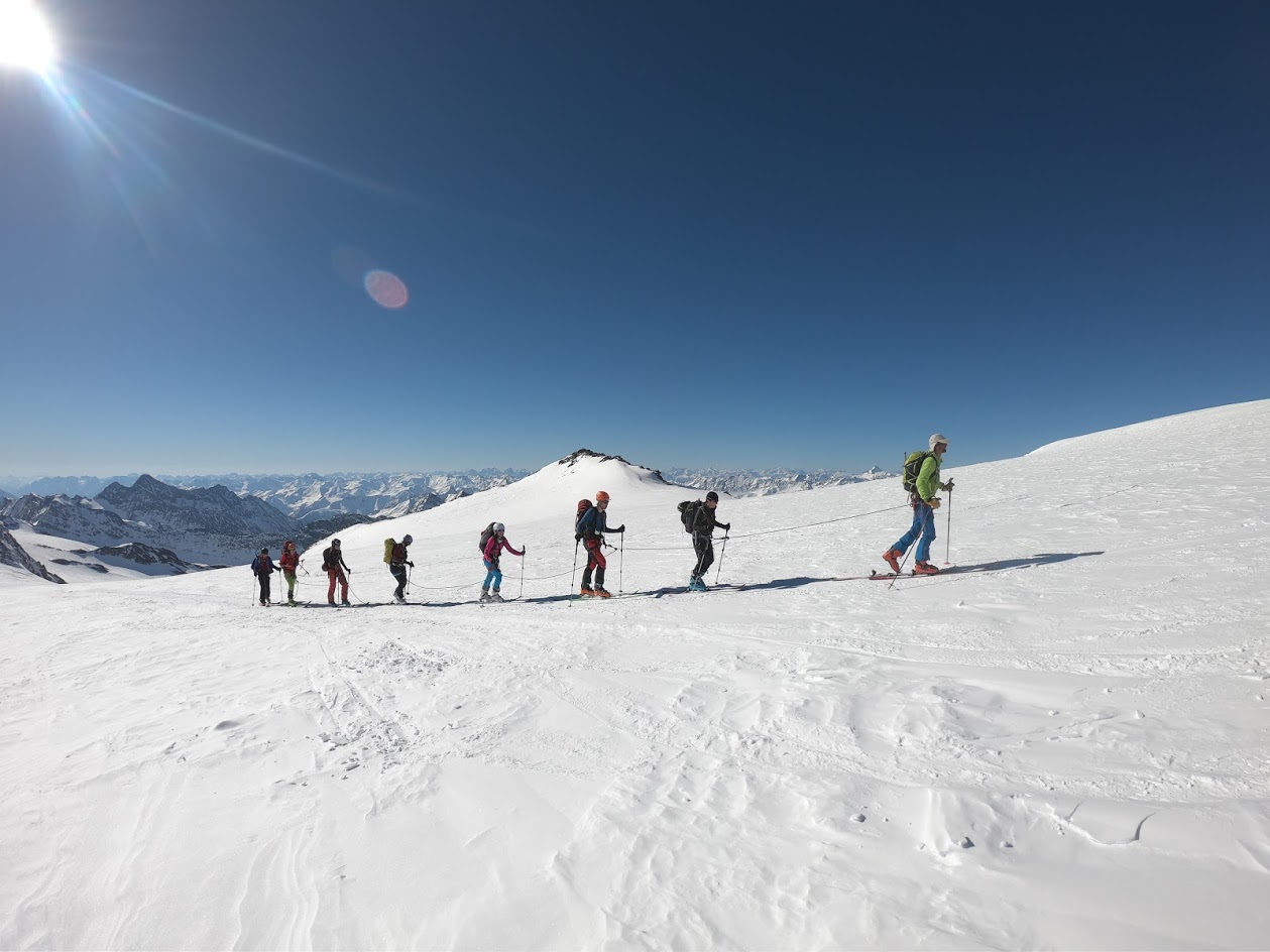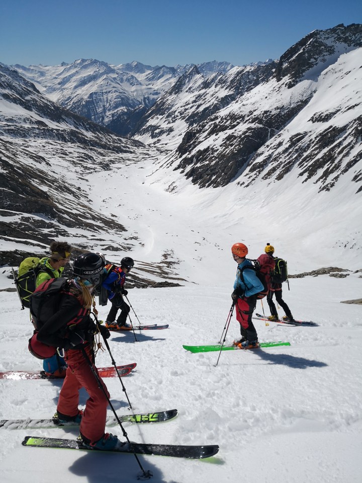 Naslednji dan smo nadaljevali z vzponom proti vrhu Grossvenedigerja. Sneg je bil pomrznjen – brez srenačev ni šlo. Prve pol ure pot poteka ob grebenu, nato pa zavije levo na ledenik Rainerkees. Poleti ima ta ledenik veliko število ledeniških razpok. Trenutno pa so vse globoko pod snegom. Zato je vzpon relativno varen. Ledenik Rainerkees približno na višini 3400 m preide v še bolj položen ledenik Oberer Keesboden. Po njem se brez vseh težav dostopi na vrh gore. Samo zadnjih nekaj 10 m vzpona poteka po ožjem grebenu, ki zahteva nekaj previdnosti. Vreme je bilo ves čas ture fantastično.