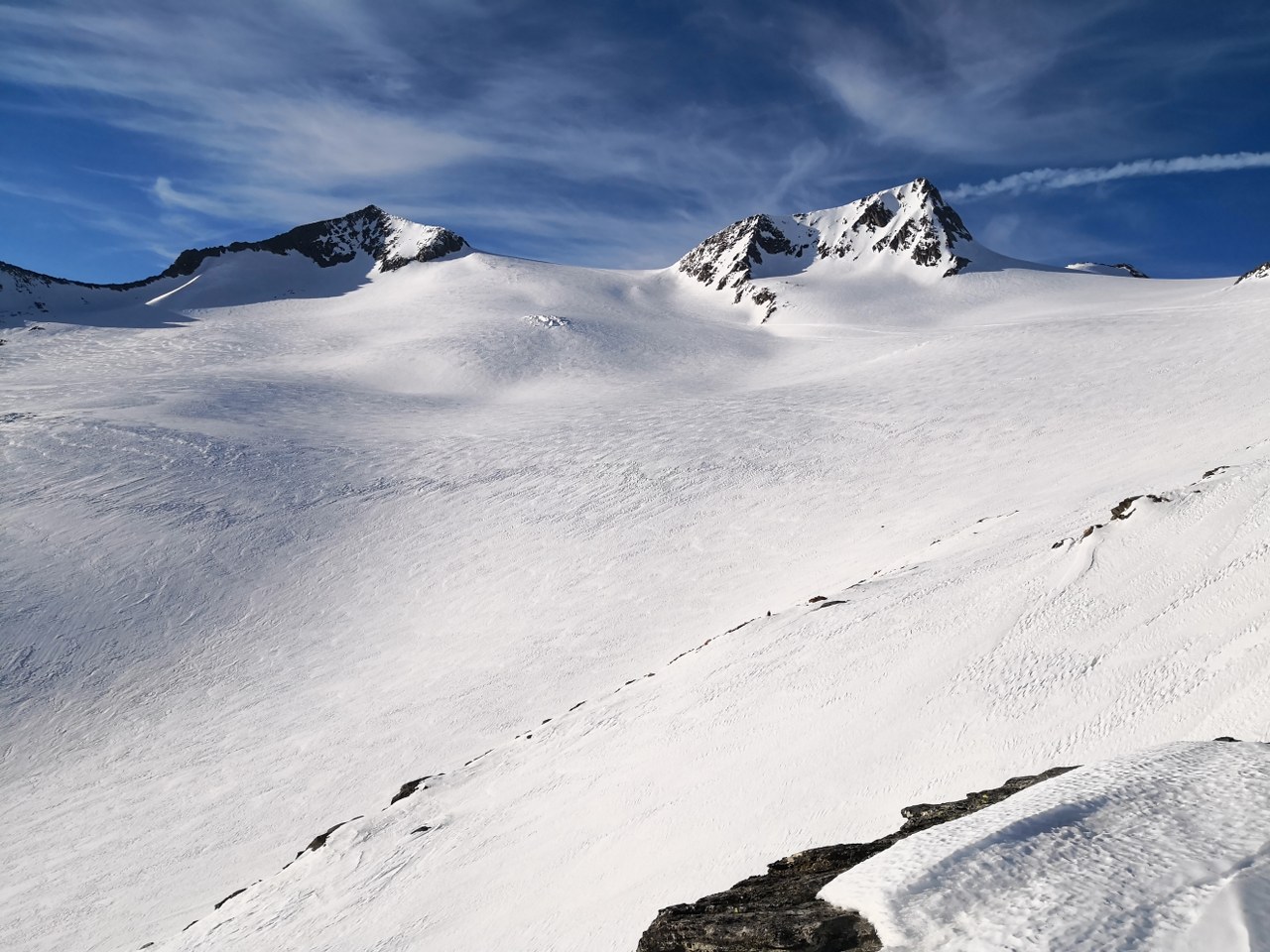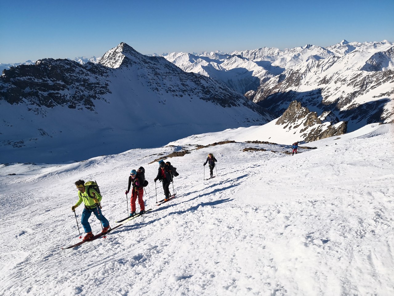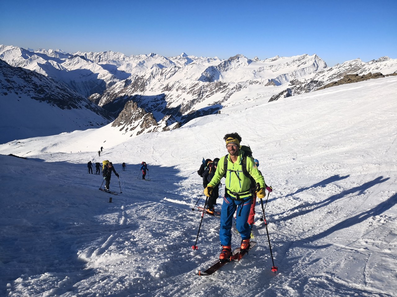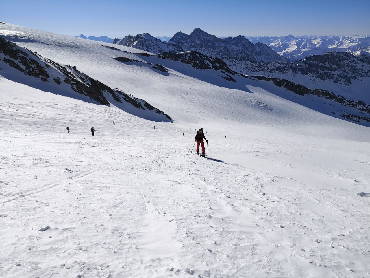 Naslednji dan smo nadaljevali z vzponom proti vrhu Grossvenedigerja. Sneg je bil pomrznjen – brez srenačev ni šlo. Prve pol ure pot poteka ob grebenu, nato pa zavije levo na ledenik Rainerkees. Poleti ima ta ledenik veliko število ledeniških razpok. Trenutno pa so vse globoko pod snegom. Zato je vzpon relativno varen. Ledenik Rainerkees približno na višini 3400 m preide v še bolj položen ledenik Oberer Keesboden. Po njem se brez vseh težav dostopi na vrh gore. Samo zadnjih nekaj 10 m vzpona poteka po ožjem grebenu, ki zahteva nekaj previdnosti. Vreme je bilo ves čas ture fantastično.