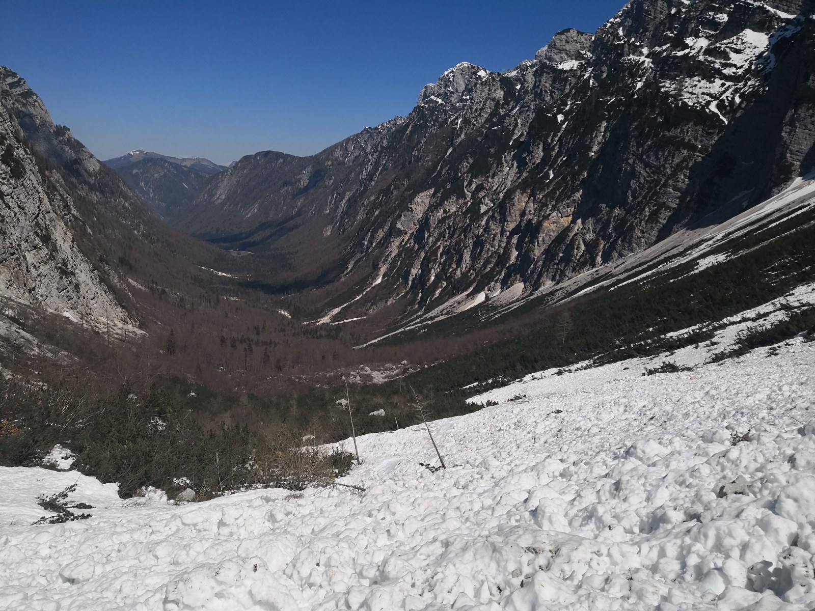 Cesta v Krmo je normalno prevozno do Garaž. Je pa na številnih mestih zelo naluknjana in nujno potrebna popravila. Sneg se začne na ravnici Vrtača, nad mestom, kjer se vidi značilen ledeniški U-profil Krme. Na tem mestu sem superge zamenjal za turne smuči. Snega je od tu dalje za turno smučanje povsod več kot dovolj.