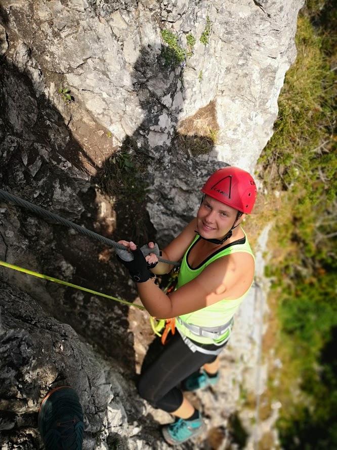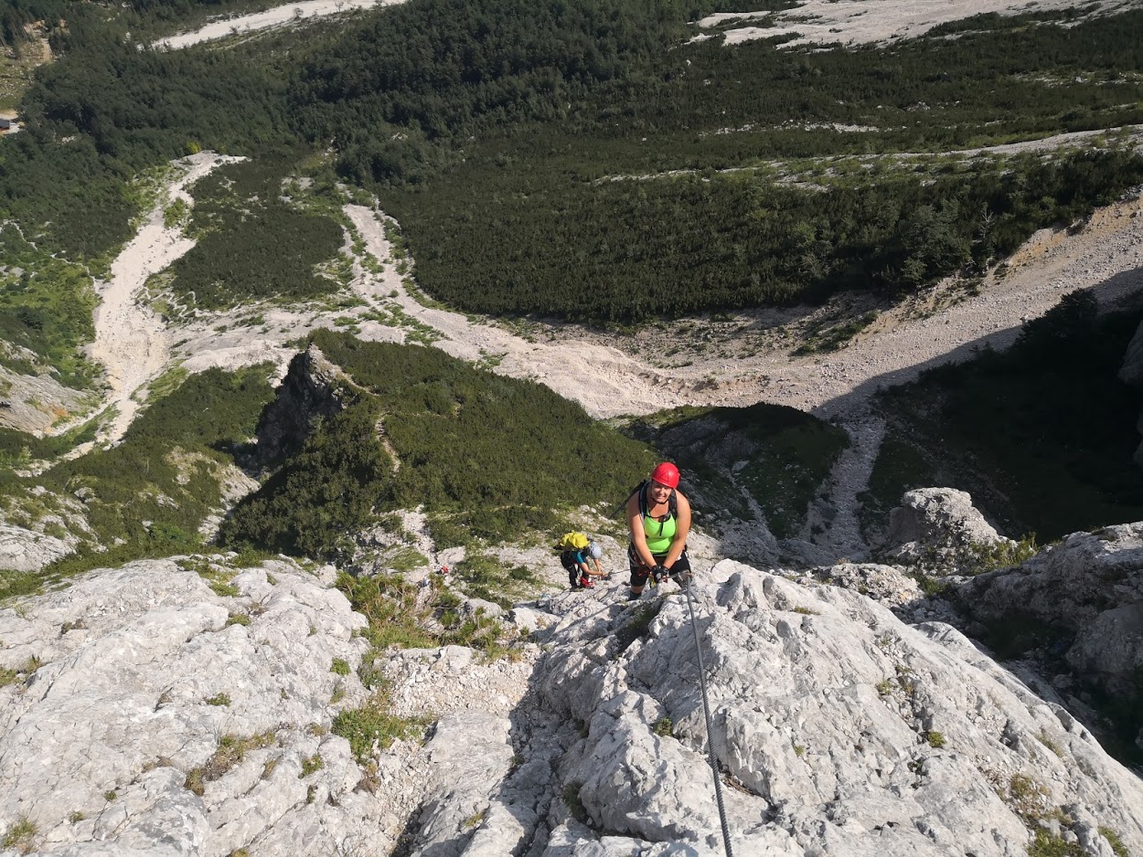 Sledi po mojem mnenju najtežji del ferate, kjer se pot vzpne čez manjšo skalno votlino, kjer ni nobenih skob. Potrebno se je čez potegniti s surovo močjo. Nato stena zopet postane manj strma. Ferata pa je do samega vrha ves čas okoli težavnosti C. Od konca ferate je do Češke koče 5 min hoje.