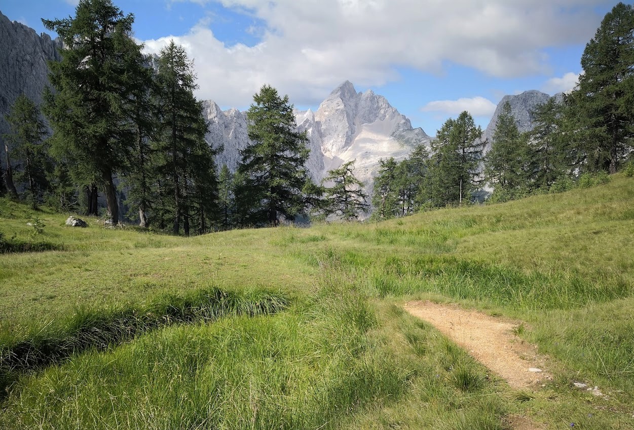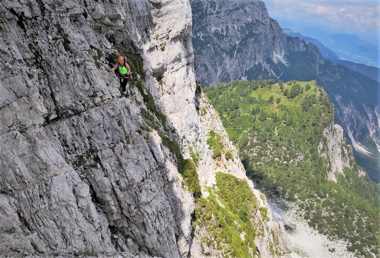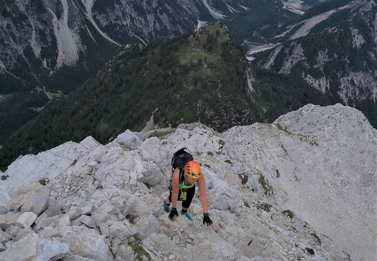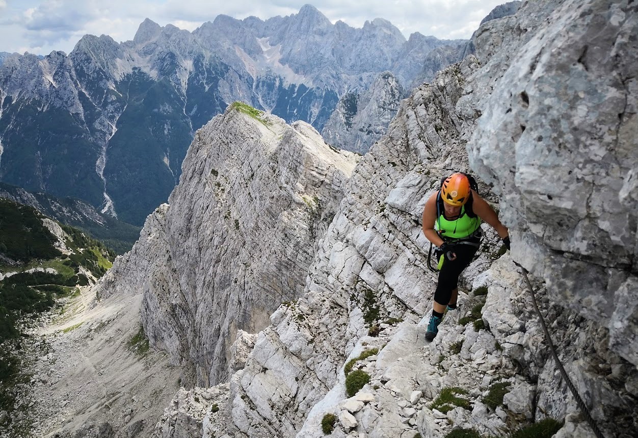 Nad Vršičem potekata dve Hanzovi poti. Poimenovani sta po alpinistu in graditelju poti Ivanu Vertelju – Hanzi. Prva poteka čez SZ steno Prisanka, midva pa se odpravila po tisti, ki gre na Malo Mojstrovko. Z Erjavčeve koče sva se čez Vratca najprej povzpela na Slemenovo špico. Na travniku s pogledom na Jalovec je vedno prijetno posedeti. Žal jezerc, kljub obilju padavin, ni več. Škoda, ker TNP kaj ne ukrene v tej smeri, da bi se jezerske kotanje spet napolnile z vodo.