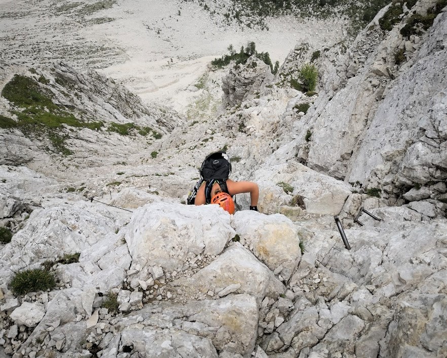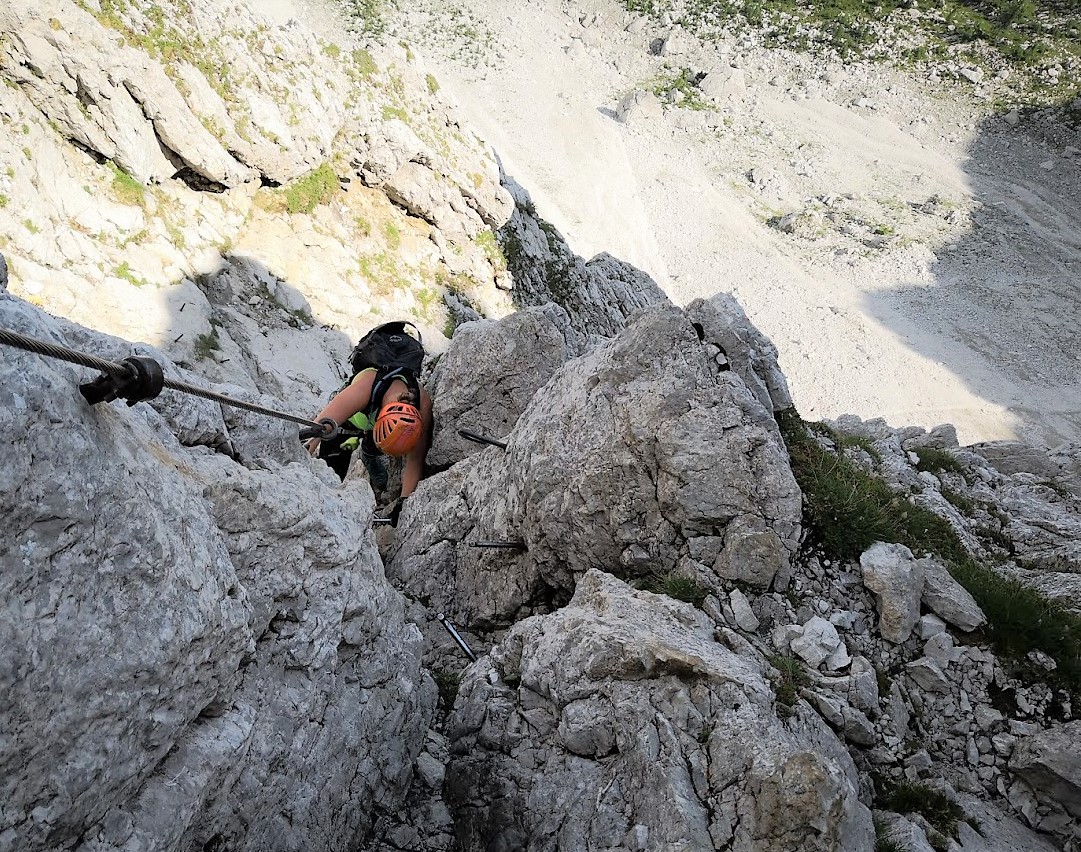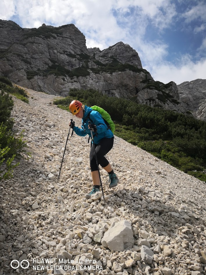 Nato sva se čez melišče pod severno steno Mojstrovke vzpela do vstopa v Hanzovo pot. Pot je v dobrem stanju. Le na eni izmed prečnic so od snežnega plazu nerodno skrivljene skobe in klini (previdno!). Glede na to da gre za zelo staro pot (zgrajena je bila leta 1928), jo po njeni težavnosti (B) ne moremo primerjati z modernimi feratami. Njen potek zgolj sledi najbolj enostavnim prehodom in skalnim policam. Zato pot ohranja nek kos romantike in običajnim planincem omogoča vpogled v vertikalen svet alpinistov. Meni se zdi najlepši vršni del poti, kjer ni jeklenic in klinov in je zato potrebno nekaj lažjega plezanja. Nazaj na izhodišče sva sestopila po običajni poti čez Grebenec. Na Vršič sva se podričala po melišču, ki je zgoraj že zdrsano, spodaj pa še odlično.