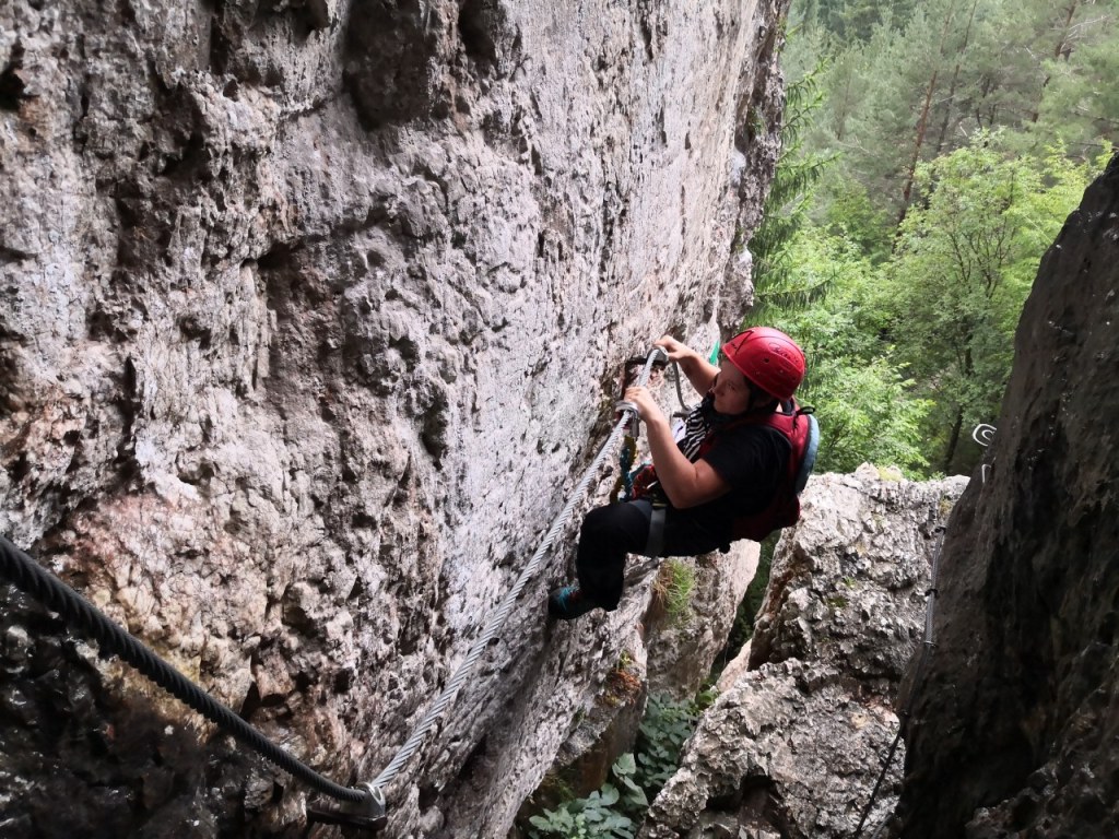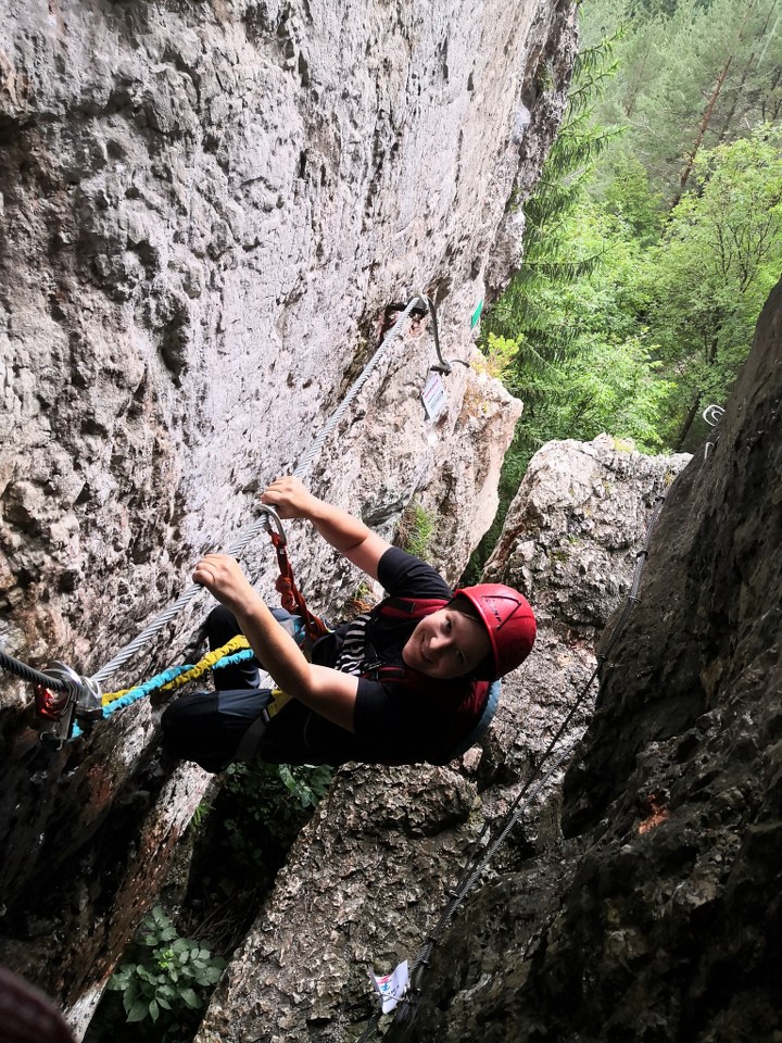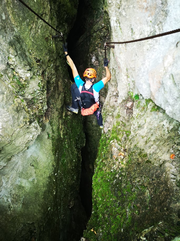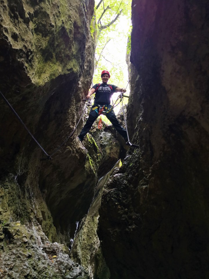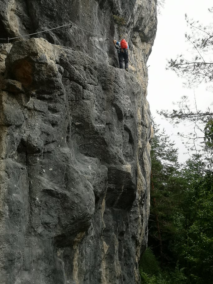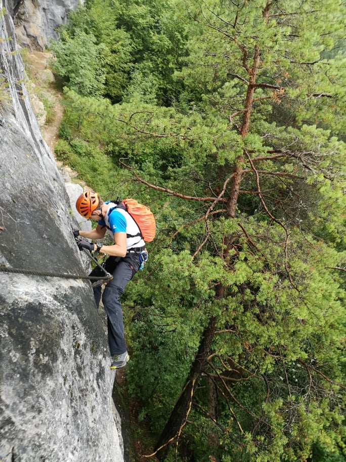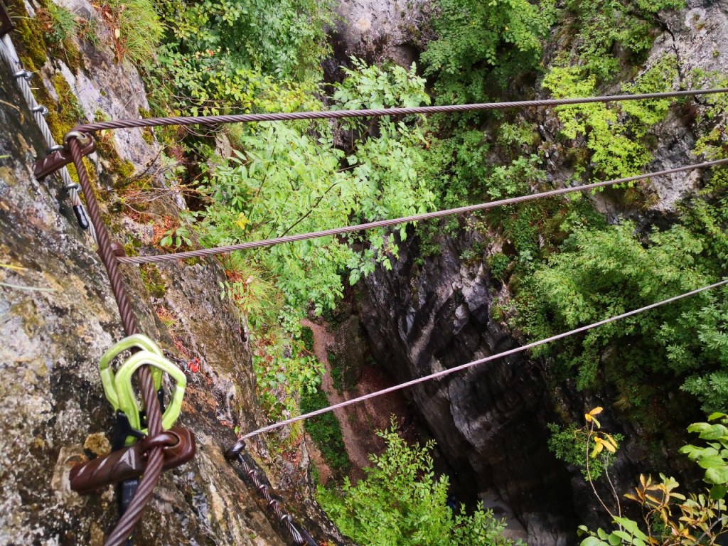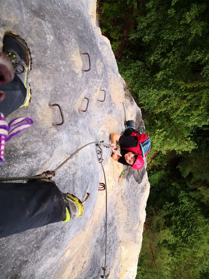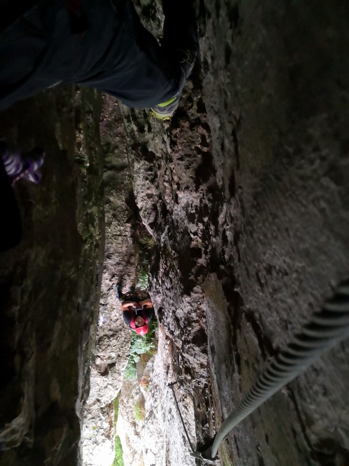 Večina ferat je lahkih (težavnost B/C). Nekaj pa je tudi težjih. Ker pa je bilo vreme deževno in zato skala mokra in predvsem zelo spolzka, je bila ves čas potrebna izdatna previdnost. V lažjih feratah je šlo. Skozi eno izmed jam pa poteka tudi zelo zahtevna ferata težavnosti D/E. V previsu mi je na mokri skali, spolzki kot led, nenadoma spodrsnilo. Na srečo sem se na tem mestu dodatno varoval s popkovino. V nasprotnem primeru bi obvisel na samovarovalnem kompletu.