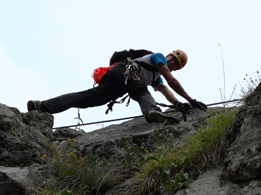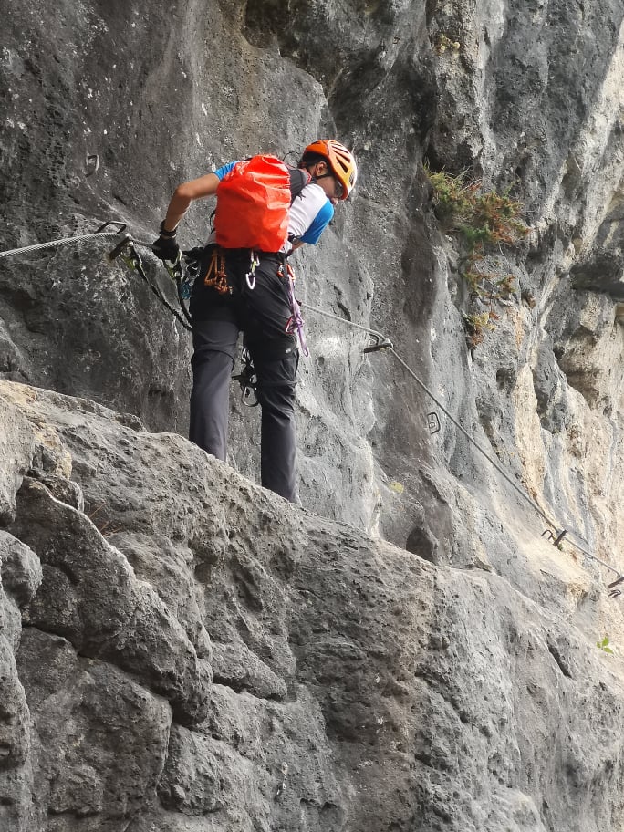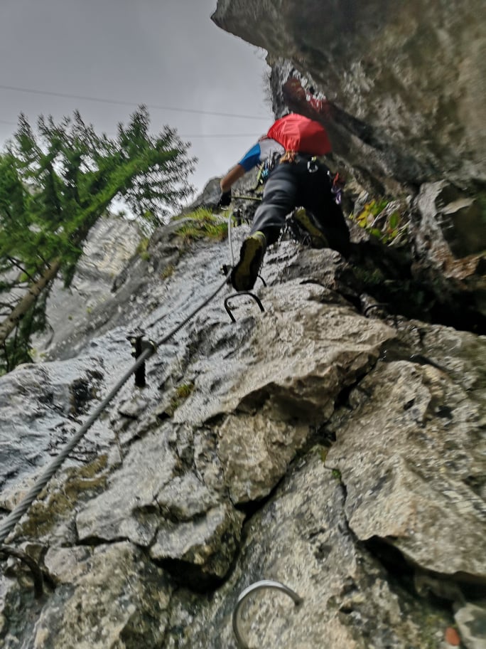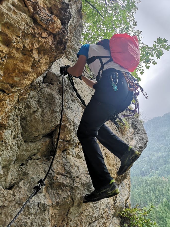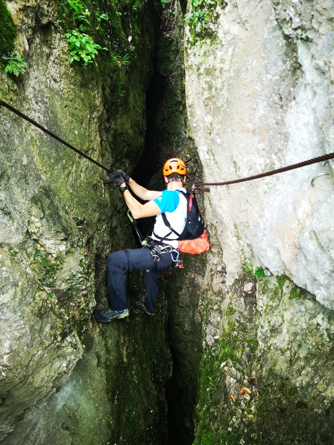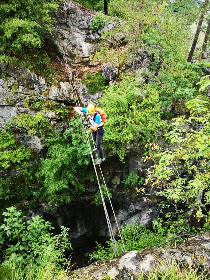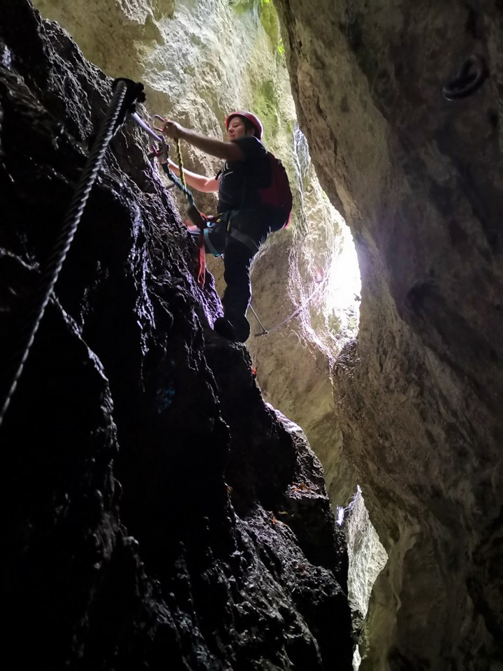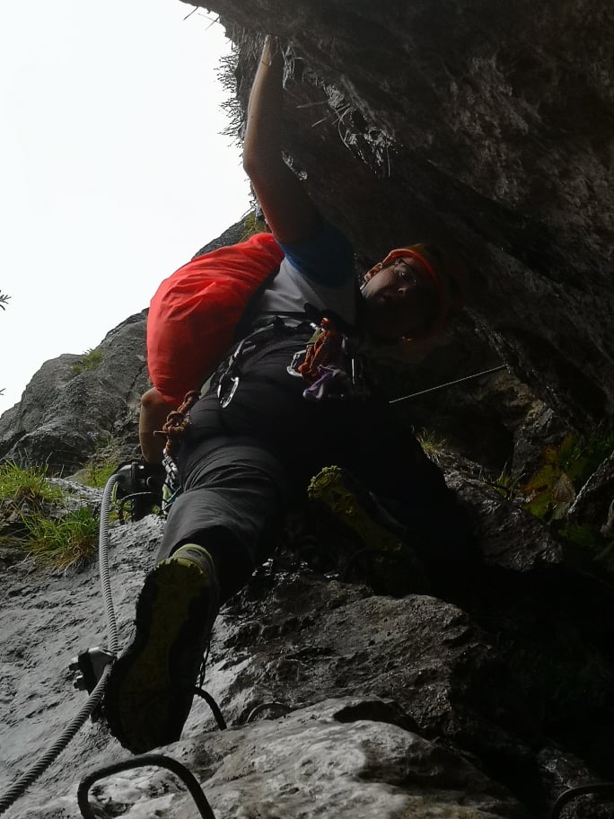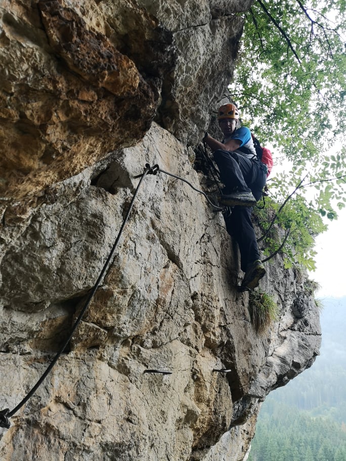 Večina ferat je lahkih (težavnost B/C). Nekaj pa je tudi težjih. Ker pa je bilo vreme deževno in zato skala mokra in predvsem zelo spolzka, je bila ves čas potrebna izdatna previdnost. V lažjih feratah je šlo. Skozi eno izmed jam pa poteka tudi zelo zahtevna ferata težavnosti D/E. V previsu mi je na mokri skali, spolzki kot led, nenadoma spodrsnilo. Na srečo sem se na tem mestu dodatno varoval s popkovino. V nasprotnem primeru bi obvisel na samovarovalnem kompletu.