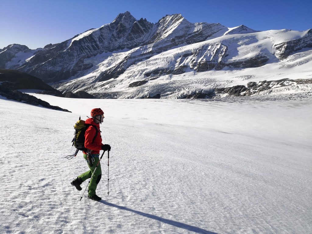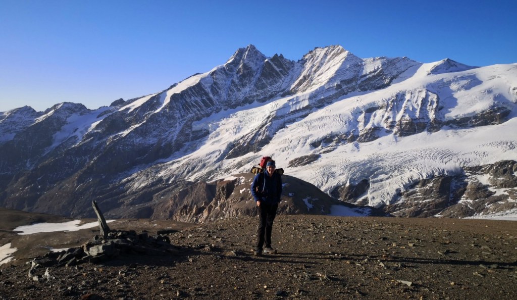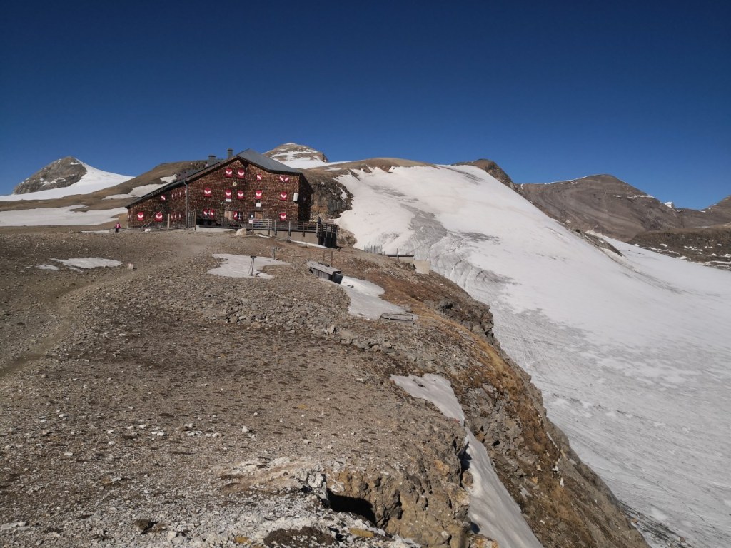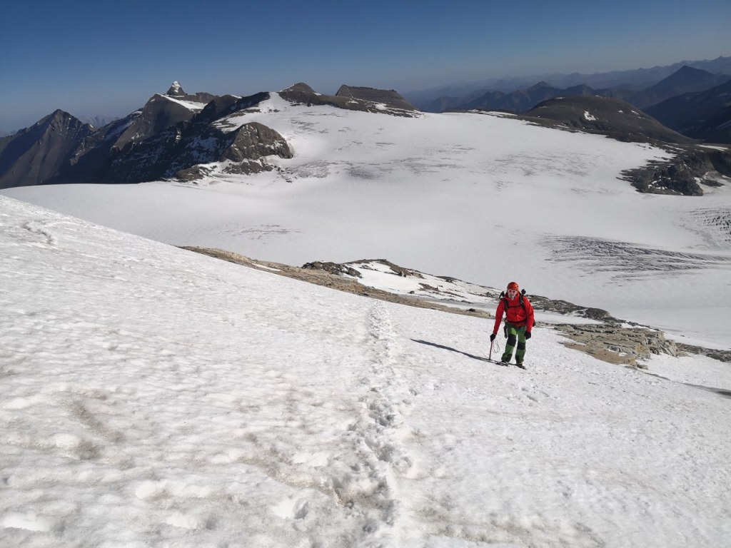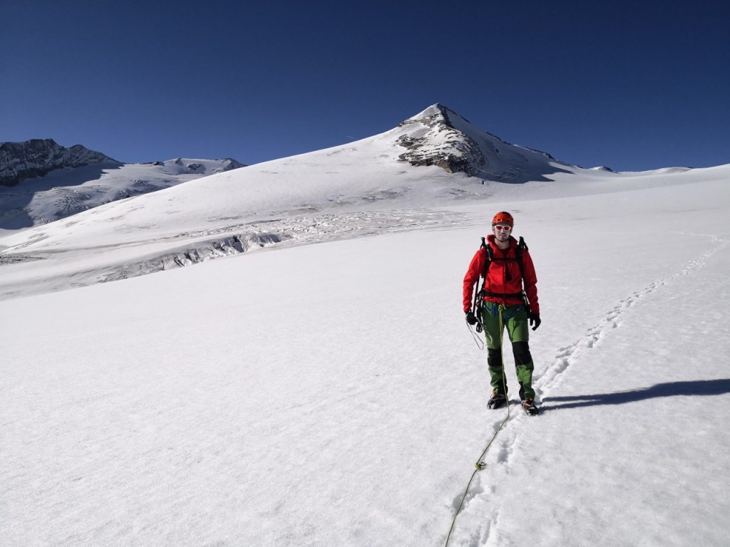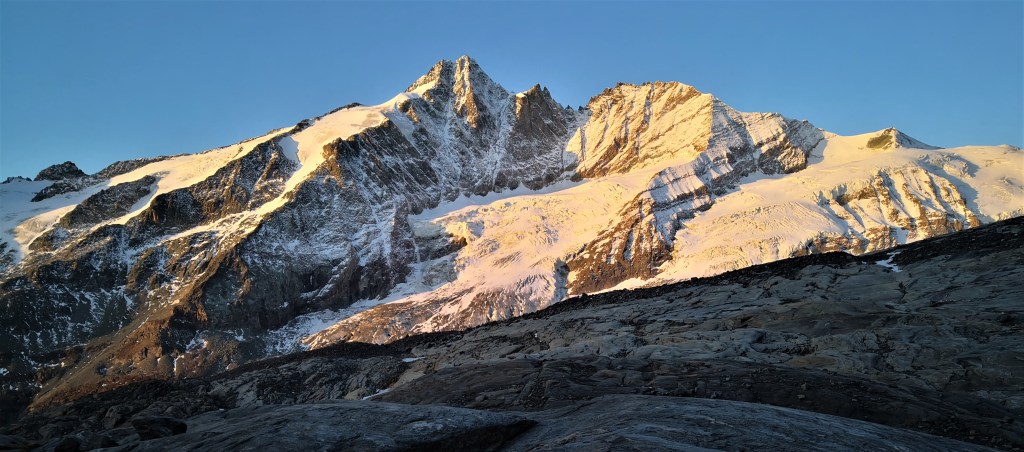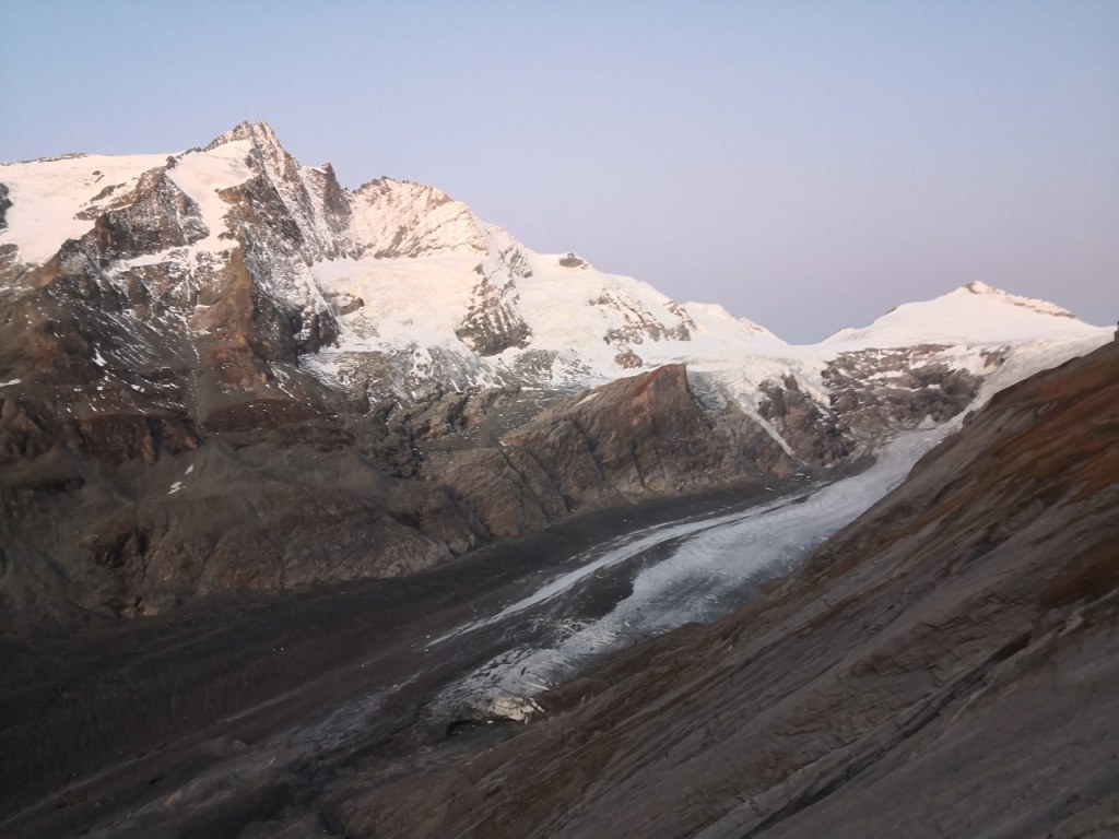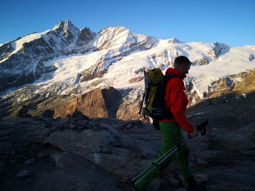 Ob prvem svitu sva se odpravila skozi tunele po turistični poti Gamsgrubenweg. Ves čas sva uživala ob čudovitih razglednih na jutranjo zarjo na Grossglocknerju. Od konca turistične poti, steza vodi čez zglajeno dno nekdanjega ledenika. Pot nato krene levo proti koči. Midva pa sva nadaljevala naravnost naravnost navzgor čez ledenik Suddlicher Bokkarkees, na skalnat greben nad kočo Oberwalderhutte (2972 m). Spodaj je ledenik položen in neproblematičen. Višje, kjer je bolj strmo, pa sva morala paziti na številne ledeniške razpoke. Z grebena sva se spustila navzdol na ledenik Pasterzenboden in ga prečila vse do vznožja Johannisberga.