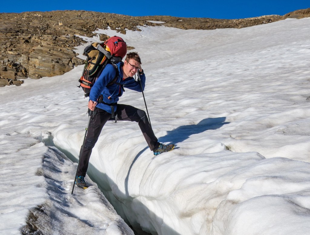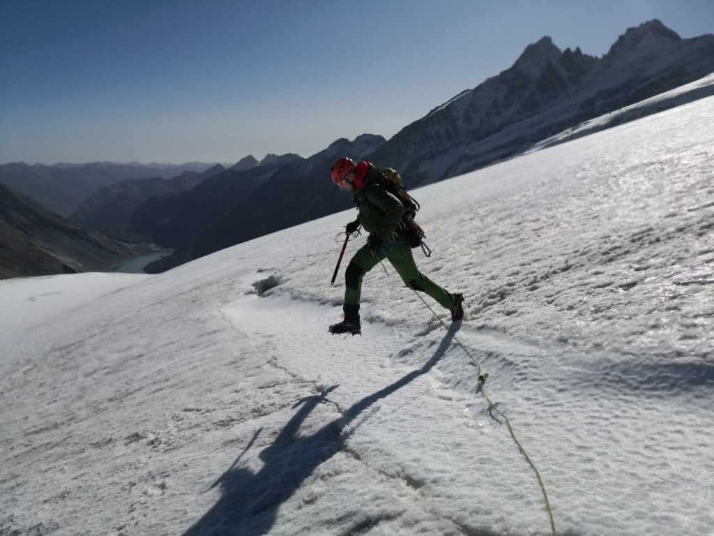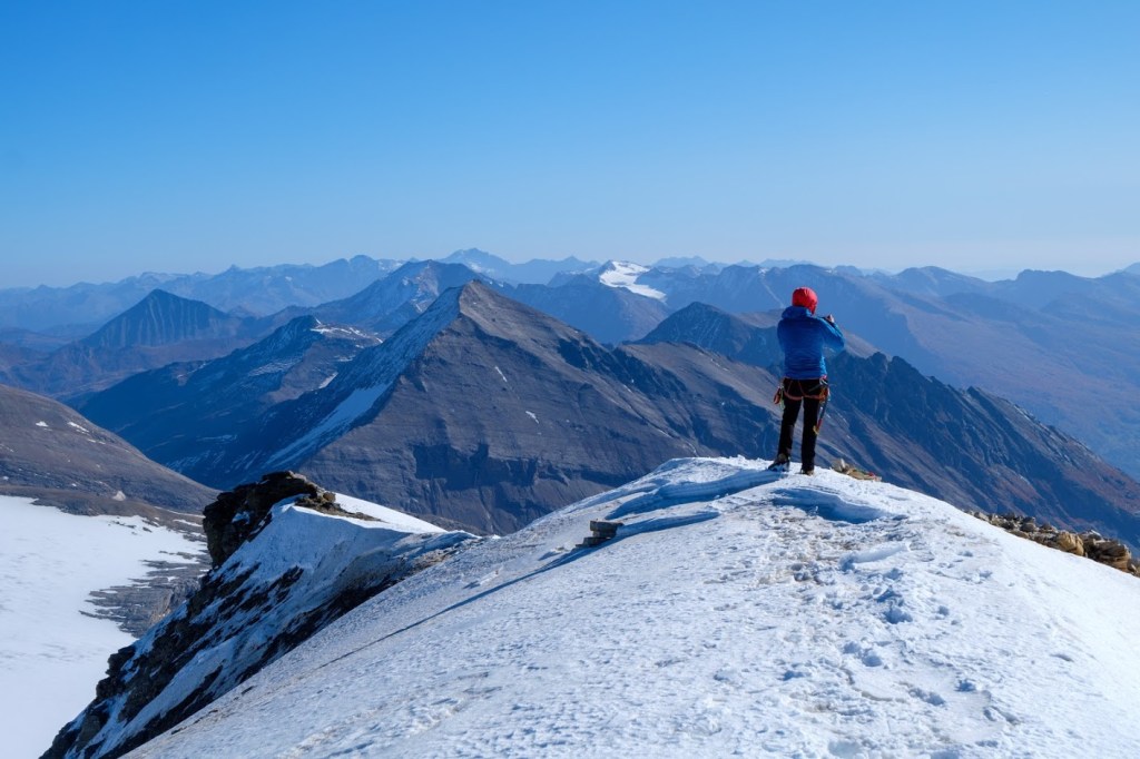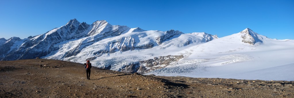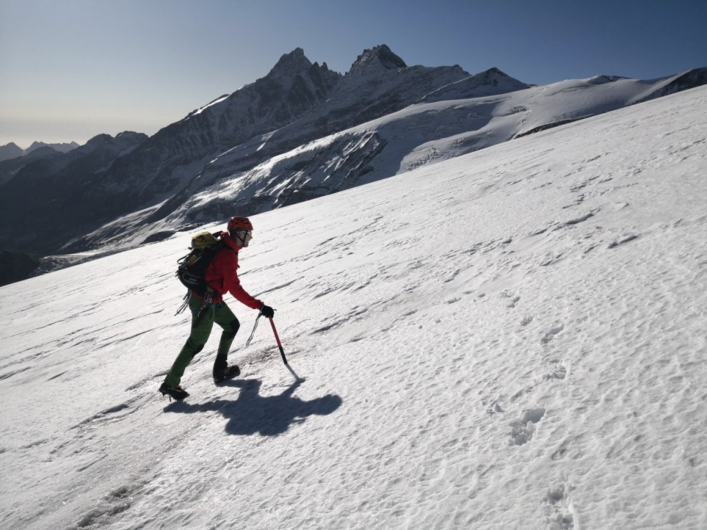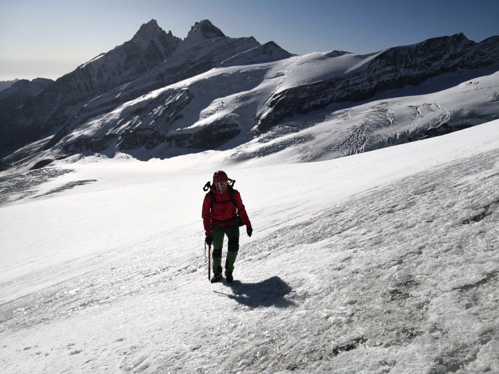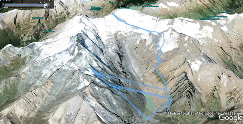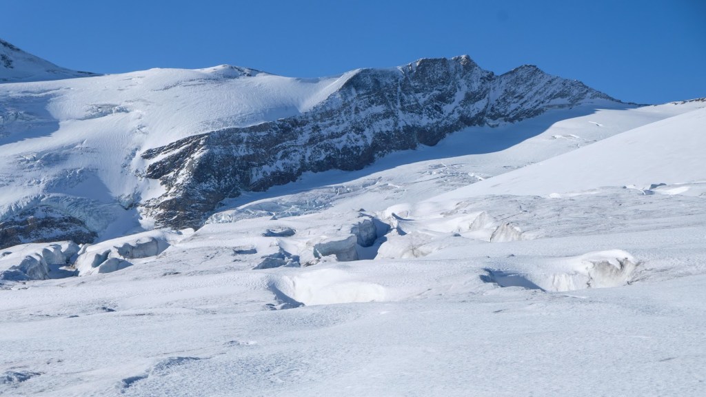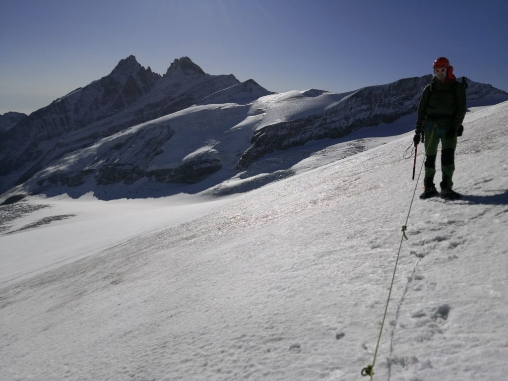 Ob prvem svitu sva se odpravila skozi tunele po turistični poti Gamsgrubenweg. Ves čas sva uživala ob čudovitih razglednih na jutranjo zarjo na Grossglocknerju. Od konca turistične poti, steza vodi čez zglajeno dno nekdanjega ledenika. Pot nato krene levo proti koči. Midva pa sva nadaljevala naravnost naravnost navzgor čez ledenik Suddlicher Bokkarkees, na skalnat greben nad kočo Oberwalderhutte (2972 m). Spodaj je ledenik položen in neproblematičen. Višje, kjer je bolj strmo, pa sva morala paziti na številne ledeniške razpoke. Z grebena sva se spustila navzdol na ledenik Pasterzenboden in ga prečila vse do vznožja Johannisberga.