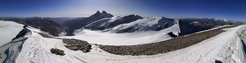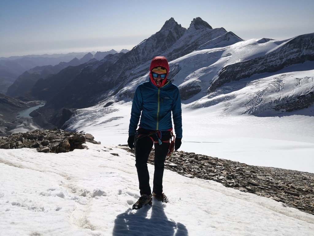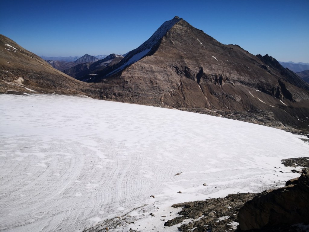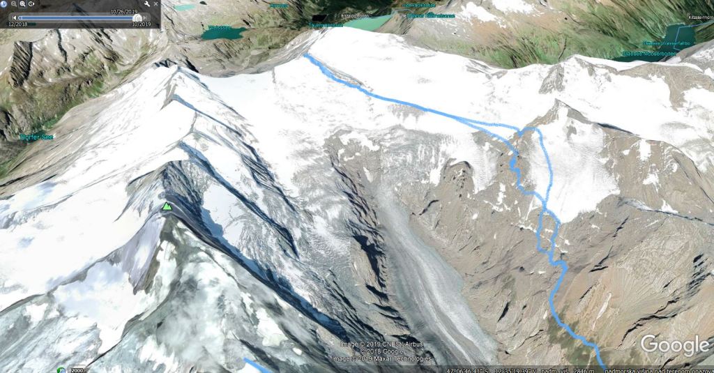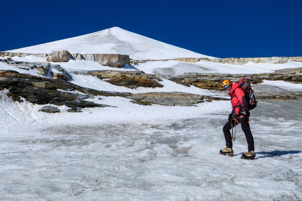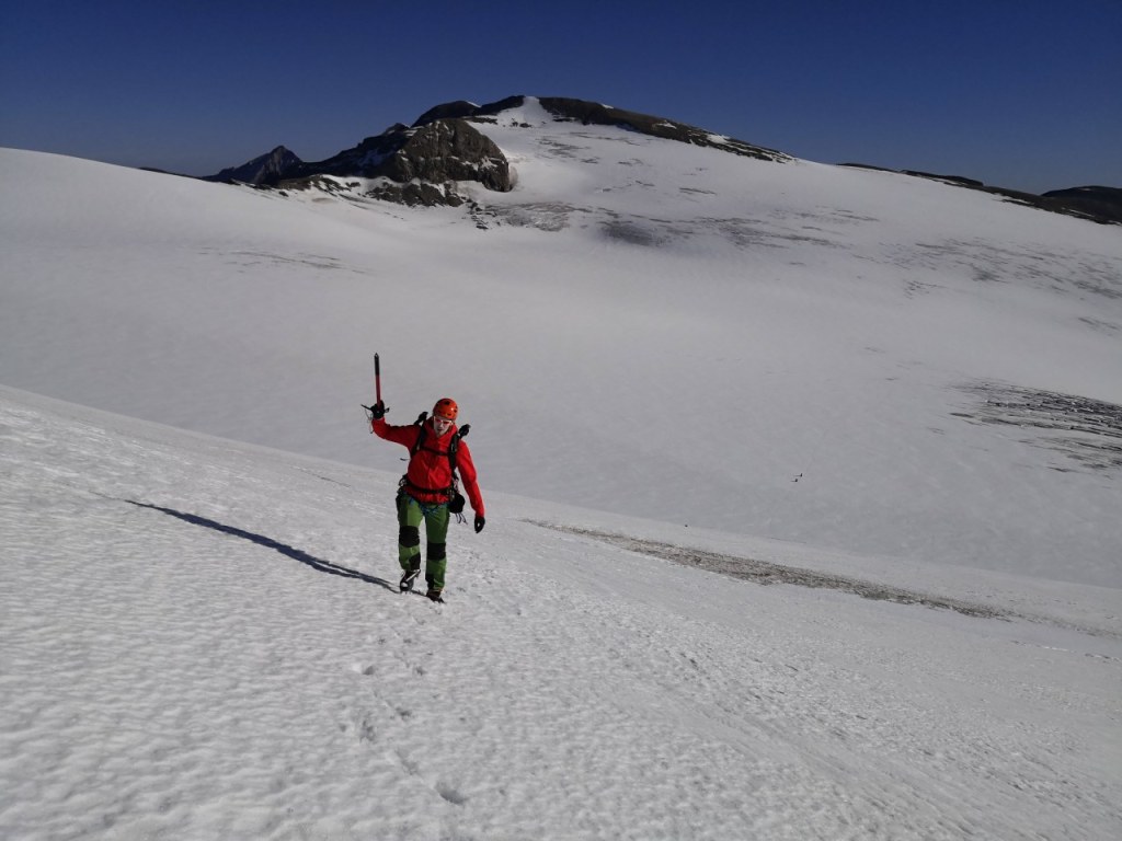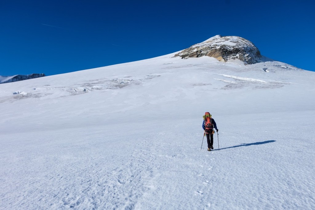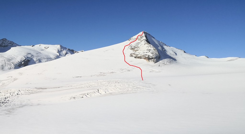 Najlažje je nadaljevati bolj ali manj naravnost navzgor, levo od izrazitega grebena, ampak ne preveč, ker so tam ledeniške razpoke. Približno na višini 3350 m sva zavila desno na greben, po katerem sva se povzpela na vrha gore (3452 m). Sestopila sva po isti smeri, s to izjemo, da sva šla nazaj grede po markirani poti mimo koče. Dan je bil popoln. Le malo nama je bilo žal, da nisva vzela smuči, saj bi se brez težav pripeljala do višine 2800 m. Vmes bi morala samo dvakrat za nekaj 10 metrov sneti smuči. Sneg je bil večinoma srenjec.