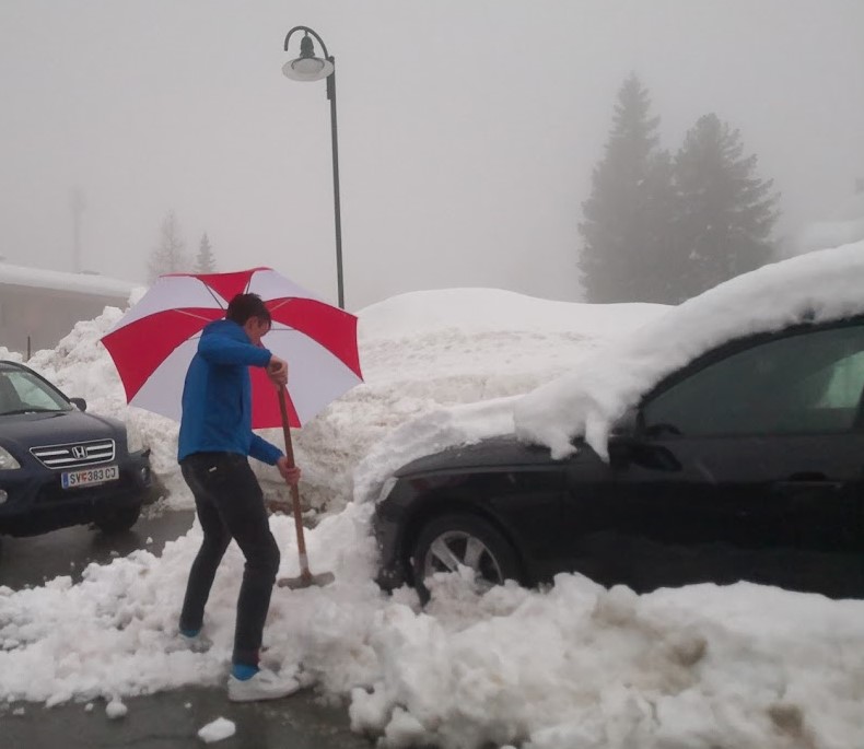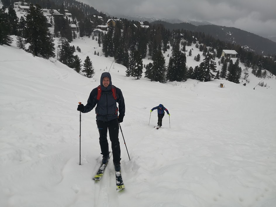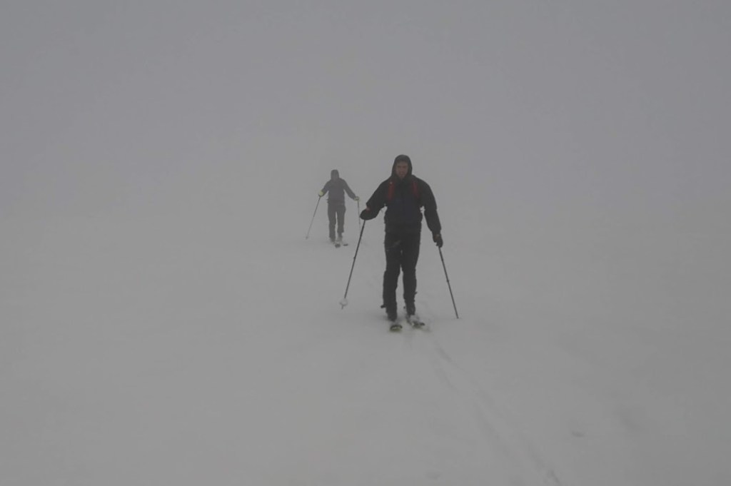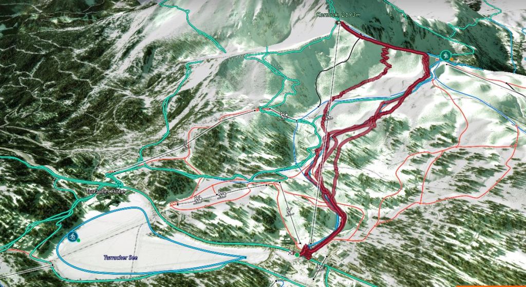 Najprej: vem da se v tako slabem vremenu, kot je bil danes, ne hodi v hribe. Pa smo trije vseeno šli. Zaradi napovedi zelo intenzivnih padavin in snežne meje celo nad 2000 m, smo se odločili, da gremo turno smučat v hribe nad prelazom Turracher Höhe (Nockberge) v upanju, da bo tako visoko snežilo in da ne bomo hodili po dežju. Žal se to ni uresničilo. Napoved je držala. Padavine so iz ure v uro postajale vse močnejše. Šele na višini 2100 m je dež prešel v sodro. Snežilo pa ni niti na vrhu Kornocka (2193 m), kamor smo se povzpeli. Snega je sicer povsod nad prelazom več kot dovolj. Zato ni bilo nobene skrbi, da bi poškodovali smuči. Vendar je bil sneg tako razmočen, da nam nikamor ni šlo. Opravila smo dva vzpona in spusta. Dalo bi se smučati marsikje, vendar smo se zaradi goste megle raje držali smučarskih prog.