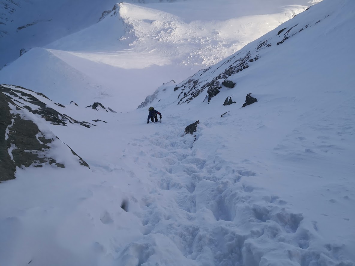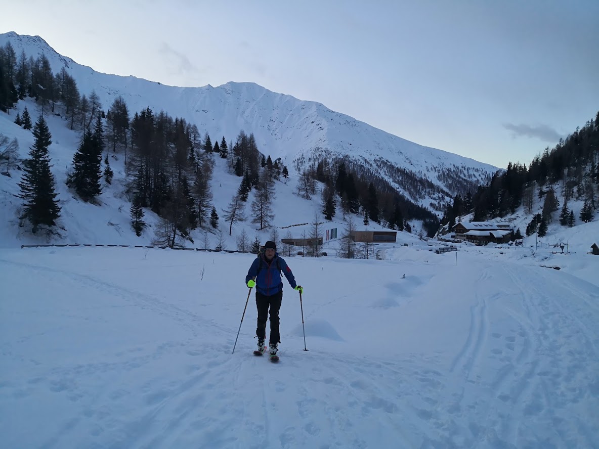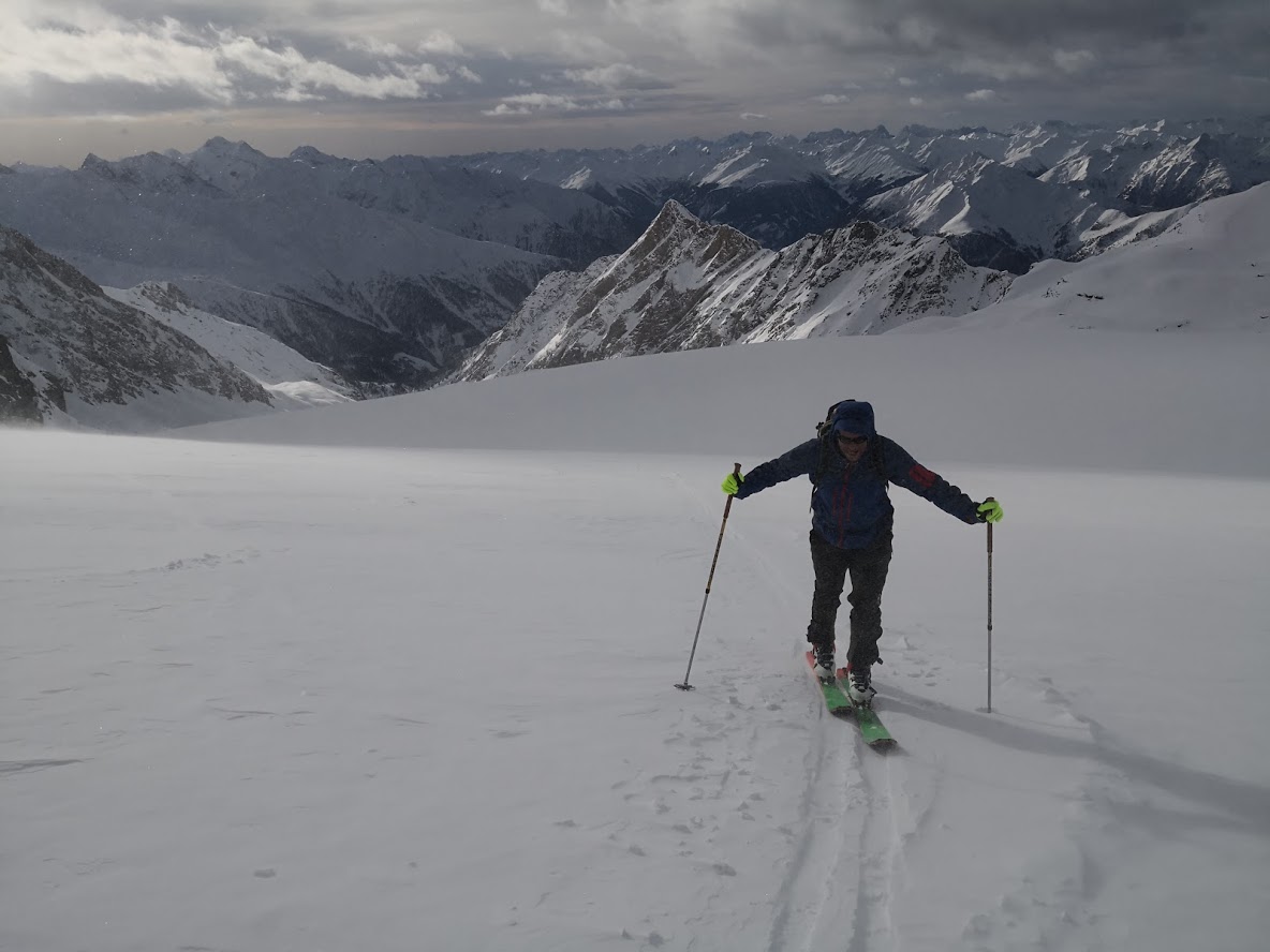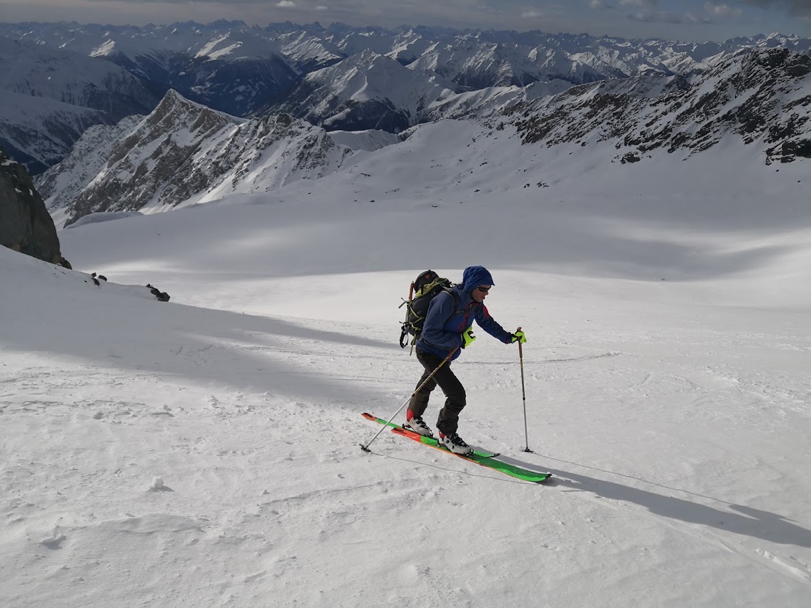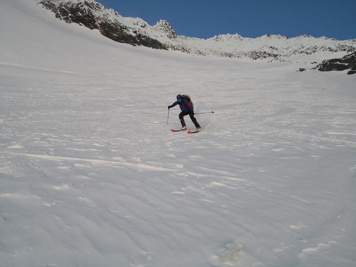 S turo sva začela iz parkirišča pri hotelu Locknerhaus ob precej pozni, 8. uri zjutraj. Snega je v tem predelu Alp precej več kot bolj na vzhodu. Snežna meja je na okoli 500 m. Smučljiva pa so vsa pobočja nad 1000 m. Tako je bilo že na izhodišču več kot en meter snega. Špura je bil precej dobra. Pa tudi če je ne bi bilo, bi šlo, saj je sneg predelan in se zelo malo predira. Do koče Locknerhutte cesto prekinja nekaj snežnih plazov. Nato ni več posebnosti. Z odločnim tempom sva hitro napredovala in v dveh urah in pol dosegla ledenik Kondnitzkees. Prečenje ledenika je čudovito doživetje: ena ura hoje brez enega samega ovinka. Nadaljevala sva čez zatrep ledenika do grebena, kjer sva se priključila markirani poti. Tu sva pustila smuči, se opremila v cepine in dereze; ter nadaljevala še 150 višincev do koče Erzherzog-Johann-Hütte (3454 m). Šlo je za kratek in razmeroma enostaven odsek poti. Vendar sva tu oba zelo čutila efekt višine. Poleg tega je postalo izredno hladno. Pri koči je bilo 10 stopinj pod lediščem. Zaradi vetra pa je bil občutek mraza okoli – 23 °C. Čez Kleineglocknerkees sva vstopila v žleb, ki pripelje na sedlo pod Kleineglocknerjem. Snežne razmere so bile super. Žleb je smučljiv. Greben je spihan – vse jeklene palice gledajo ven iz snega. Varovala sva se le na odseku iz škrbine do vrha Grossglocknerja (II). Na vrhu gore sva se zadržala manj kot minuto časa, saj sva ga dosegla šele ob drugi uri popoldne. Najin cilj je bil, da do začetka noči sestopiva vsaj do mesta, kjer sva pustila smuči. To nama je za las tudi uspelo. V čudoviti večni zarji sva presmučala ledenik, kjer so bile smučarske razmere super. Pod ledenikom pa malce manj (skorja, napihan sneg). Ampak smučarski užitki so bili drugotnega pomena na tej turi. Smuči so bile zgolj orodje, da čim hitreje zaključiva s turo. In to nama je uspelo v 9 urah in pol.