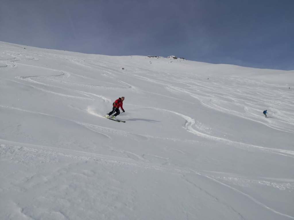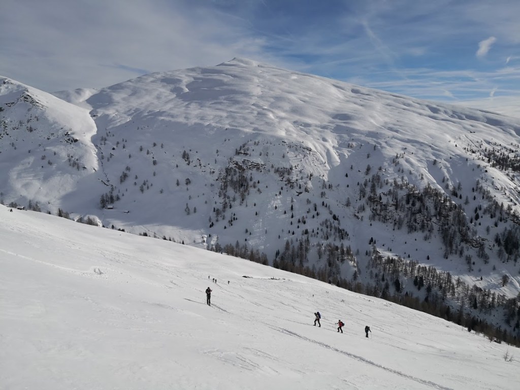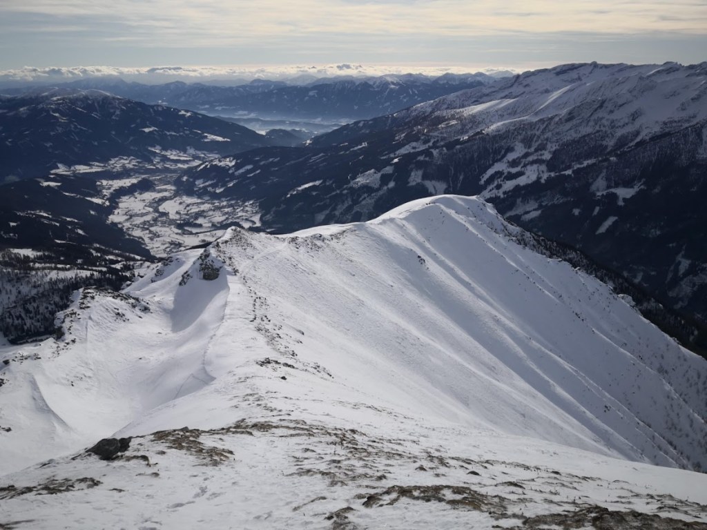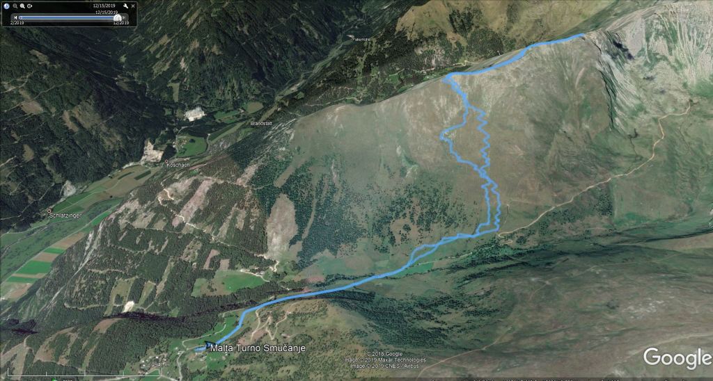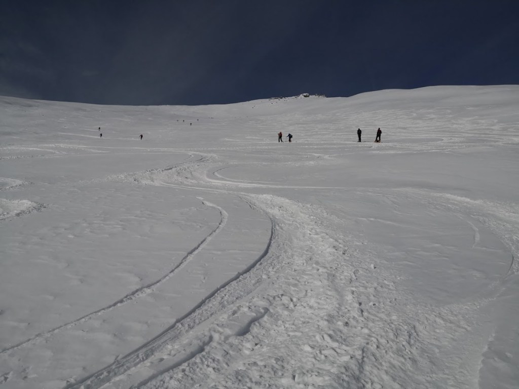 Ob našem prihodu je bilo v Maltabergu že toliko smučarjev, da smo kar stežka dobila prosto parkirno mesto. Na srečo je gora tako velika, da gneče kasneje niti ni bilo občutiti. Gaz je bila dobra. Zato sem se hitro uspel povzpeti čez dolgo vzhodno pobočje gore na greben. Zanimivo, skorajda vsi smučarji, so na tem mestu končali s turo. Nihče ni rinil naprej po grebenu proti pravemu vrhu gore. Jaz pa sem, ker mi zadnjič zaradi slabega vremena ni uspelo doseči vrha. Na izrazit predvrh Fascahuenerecka se da prilezti s srenači. Greben do glavnega vrha gore je spihan. Prečim ga peš. Večinoma se prebijam čez opasti. Spet drugje je trdo in ledeno. Vendar mi je zadoščal cepin (brez derez). Najbrž sem bil edini v celem dnevu na glavnem vrhu. Vreme je bilo ves čas nenavadno toplo in skorajda brez vetra. Po isti poti se vrnem do predvrha, kjer sem pustil smuči. Spust po grebenu do flanke je bil trd. Smuka po flanki pa je bila dobra: 15 cm pršiča na trdi podlagi. Ker je pobočje tako veliko je bilo dovolj prostora, da je (vsaj v zgornjem delu) vsak našel prostor za svoj podpis.