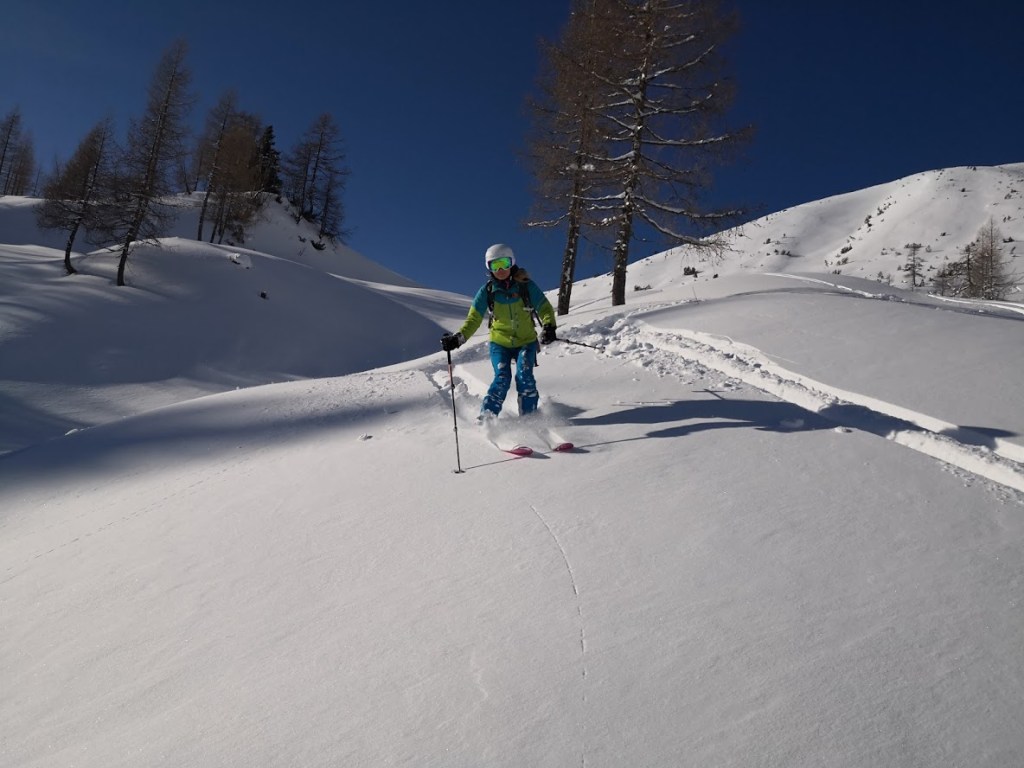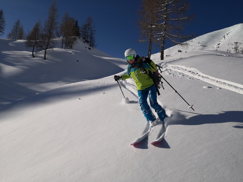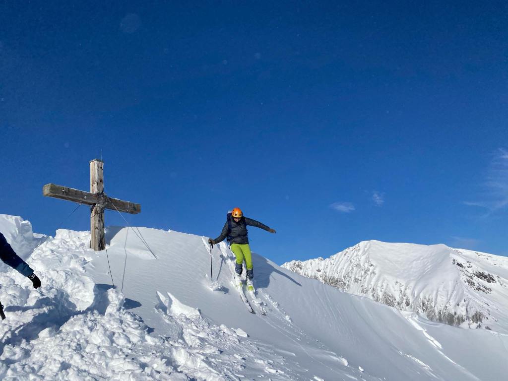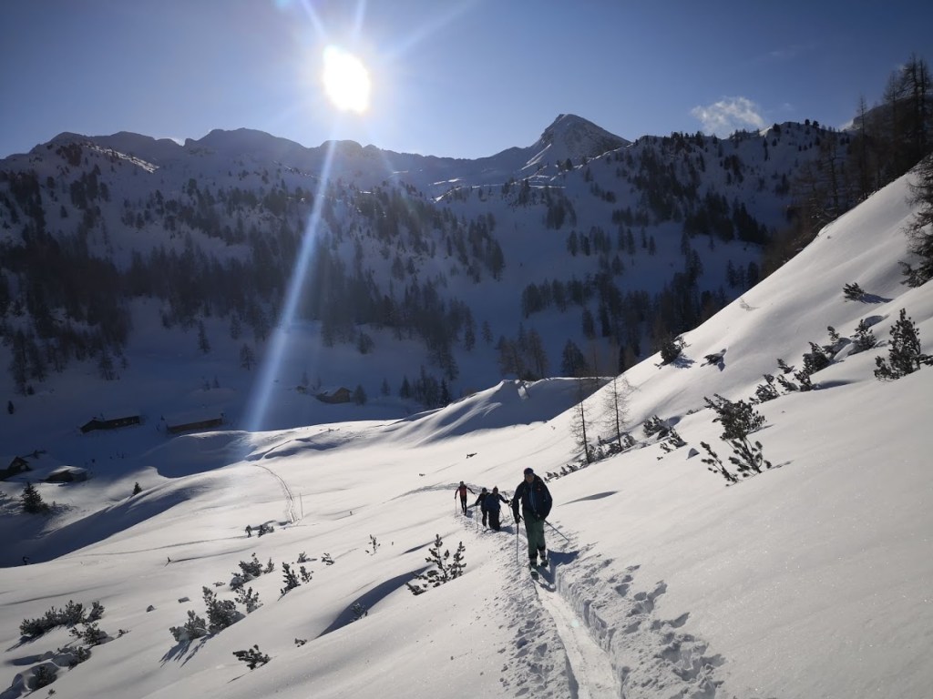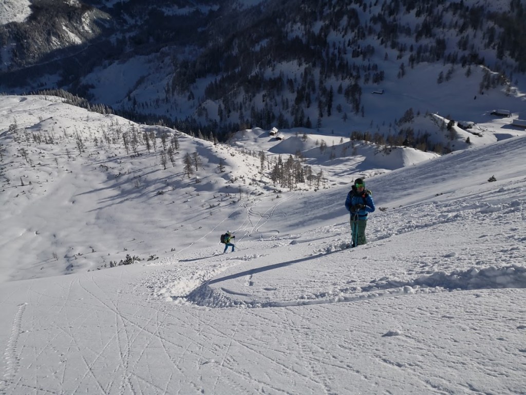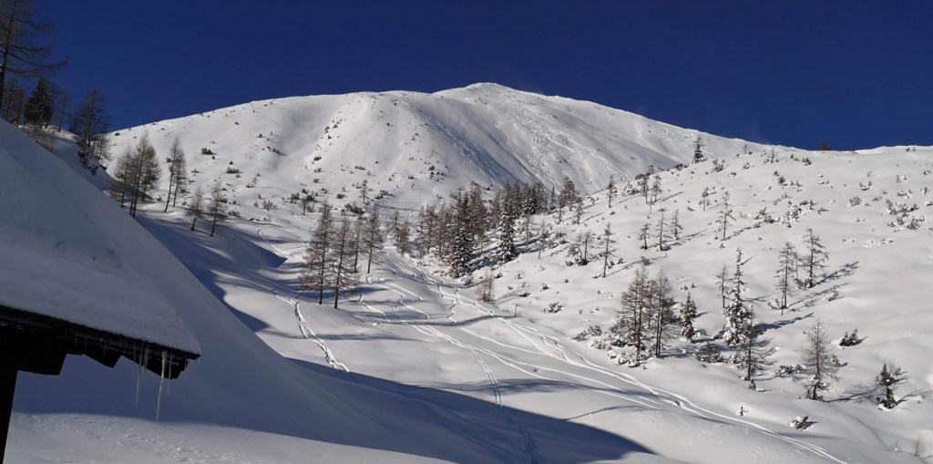 Ob našem zadnjem obisku 5 tednov nazaj je bilo na gori več kot en meter novega snega, kar nam je kljub znatnim naporom, preprečilo vzpon na vrh gore. Danes pa je bilo v Gnadenalmu samo 10 cm novega snega. Špura pa je že bila. Tako, da smo napredovali zelo hitro. Vrh gore smo dosegli samo v eni uri in pol. Poleg tega nas je pričakalo sončno vreme in popolno brezveterje. Smuka v dolino pa je bila najboljša letos doslej (pa jih imam že 18 za sabo). Pršiča je bilo povsod do vratu. Ko je že kazalo, da bo tura v vseh elementih popolna, se je nenadoma, tik pod kolegico, sprožil snežni plaz. Imela je precejšnjo srečo, da jo ni zajel. Zato smo zatem smučali bolj previdno. Pod kočo Südwiener Hütte je še vedno več kot en meter snega. Vendar je brez podlage in je ob obratih škrtalo. Na planini Gnadenalm so medtem potegnili proge za tek na smučeh.