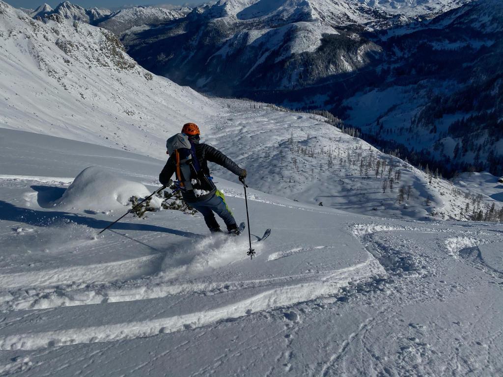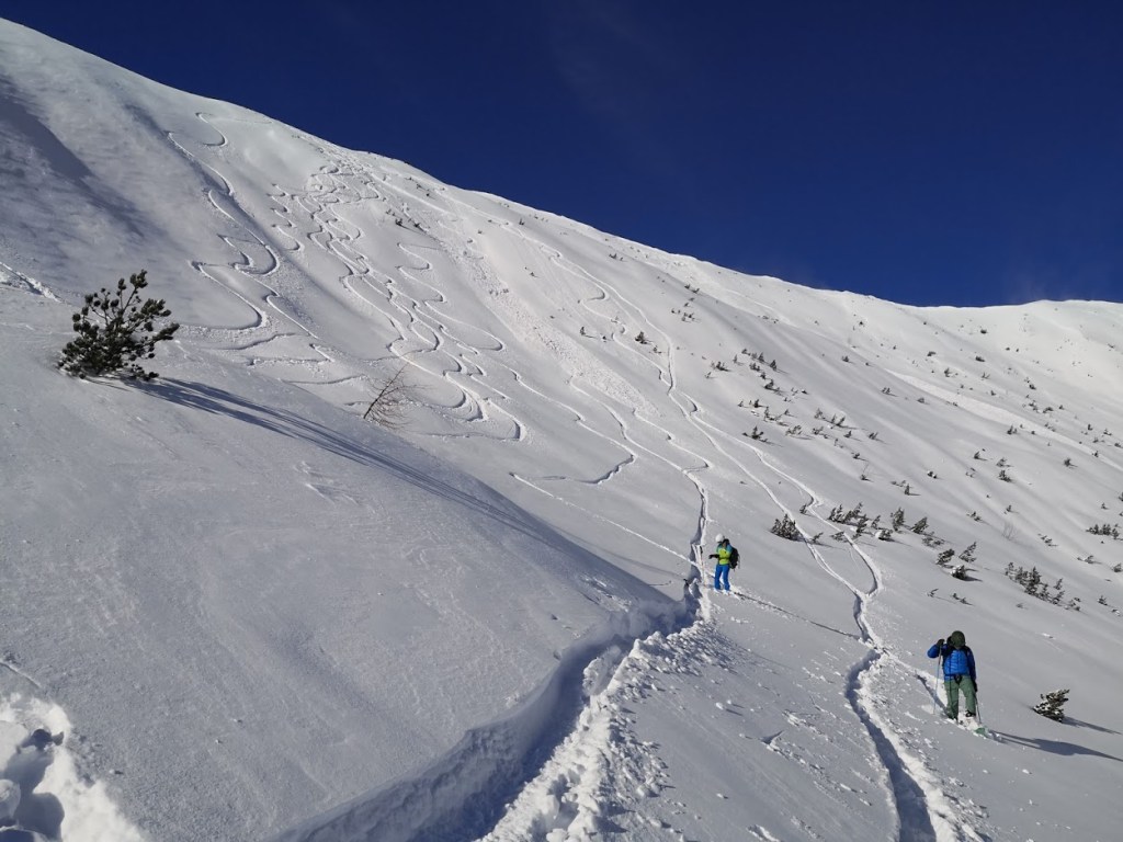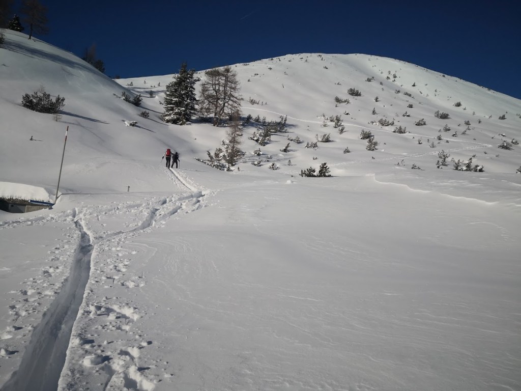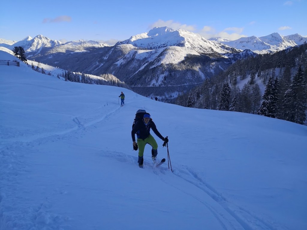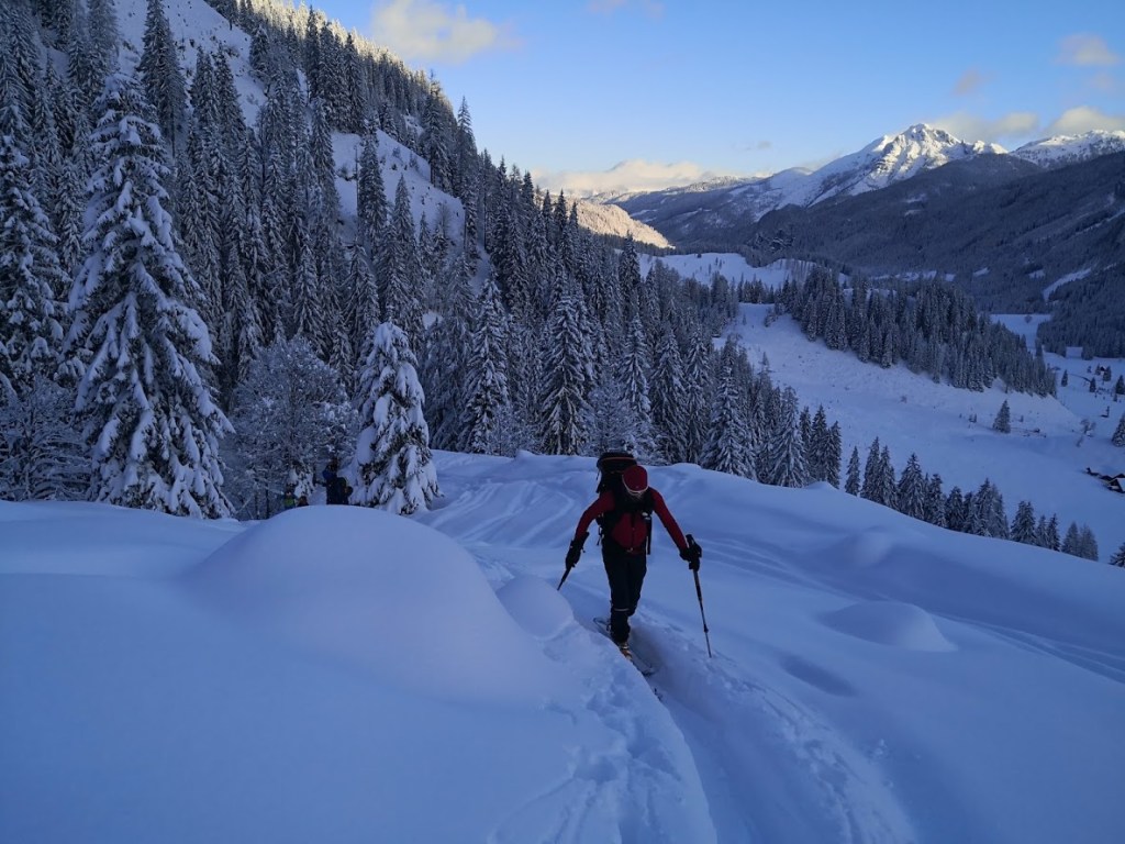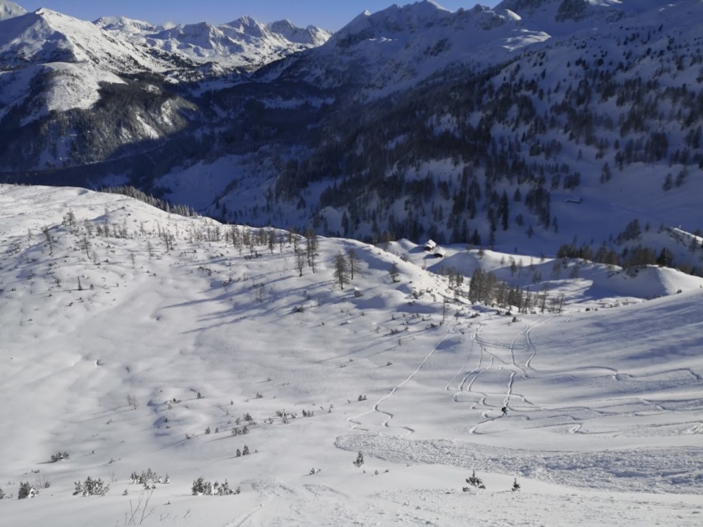 Ob našem zadnjem obisku 5 tednov nazaj je bilo na gori več kot en meter novega snega, kar nam je kljub znatnim naporom, preprečilo vzpon na vrh gore. Danes pa je bilo v Gnadenalmu samo 10 cm novega snega. Špura pa je že bila. Tako, da smo napredovali zelo hitro. Vrh gore smo dosegli samo v eni uri in pol. Poleg tega nas je pričakalo sončno vreme in popolno brezveterje. Smuka v dolino pa je bila najboljša letos doslej (pa jih imam že 18 za sabo). Pršiča je bilo povsod do vratu. Ko je že kazalo, da bo tura v vseh elementih popolna, se je nenadoma, tik pod kolegico, sprožil snežni plaz. Imela je precejšnjo srečo, da jo ni zajel. Zato smo zatem smučali bolj previdno. Pod kočo Südwiener Hütte je še vedno več kot en meter snega. Vendar je brez podlage in je ob obratih škrtalo. Na planini Gnadenalm so medtem potegnili proge za tek na smučeh.