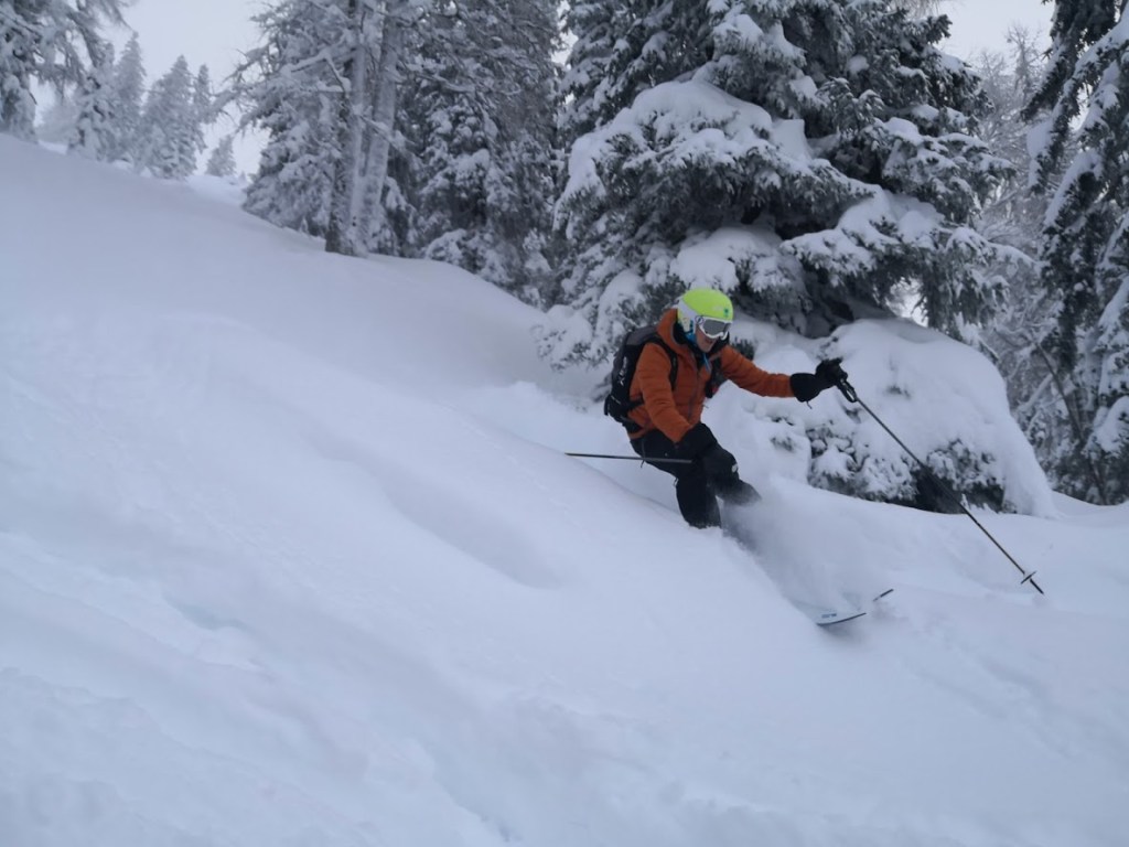 Najprej me je zmrazila zasoljena karta smučarske vozovnice (55 €). Vendar je bilo to hitro pozabljeno, ko sem se zapodil v pobočja z nedotaknjenim pršičem. Novega snega je bilo pol metra in večinoma še ne bil zvožen. V celem dnevu se nismo niti enkrat peljali po urejeni smučarski progi. Vozili smo se izključno po celem snegu v gozdu. V slabih petih urah smo presmučali 5700 višinskih metrov in 23 km. Tako veliko tako dobrega snega nisem še nikjer smučal. Med spusti smo preželi lepo število bližnjih srečanj: skokov, salt. Na srečo se nihče ni polomil. Užitek pa je bil nepopisen. Zaradi varnosti pred snežnimi plazovi smo bili opremljeni z vso potrebno lavinsko opremo.
