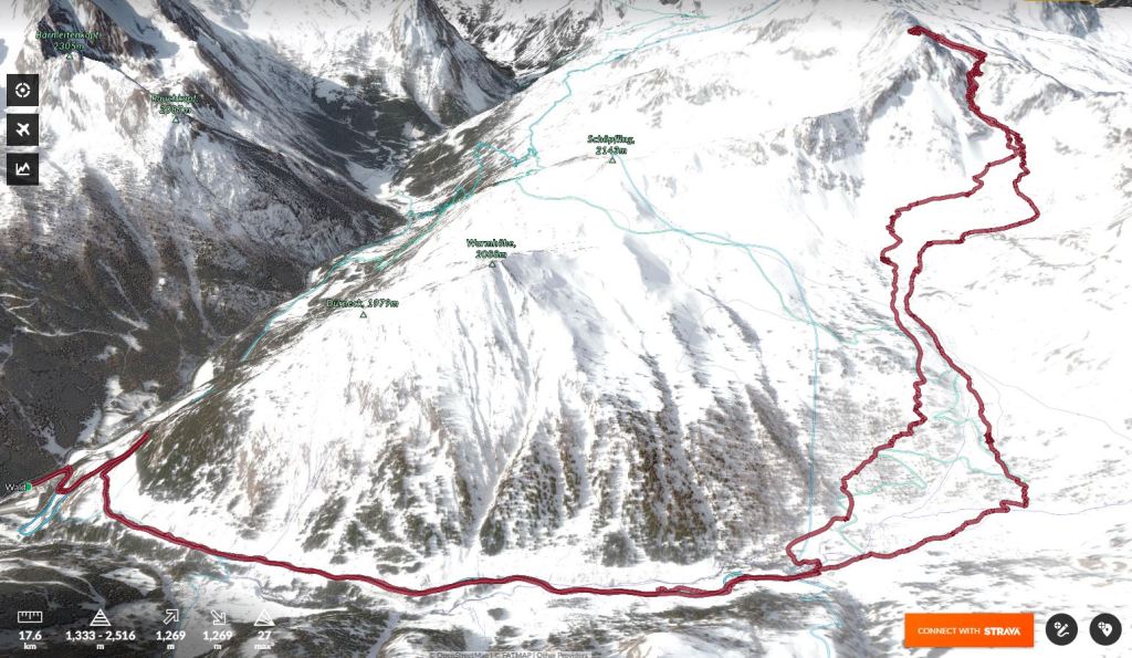 Do planine Muhreralm po isti poti, kot včeraj. Nato po dolini do lovske koče na gozdni meji. Tu razgledi postanejo lepši in človek končno dobi občutek, da je v hribih. Utrjeni špuri smo sledili skozi krnico Urbankar do sedla. Vreme se je vmes pokvarilo in začelo je snežiti. Na sedlu se teren uravna v položno planoto. Tu smo zavili v levo na vrh gore, ki pa je vršnih nekaj 10 m popolnoma kopen. Na zemljevidih je ta vrh označen, kot “pravi”, čeprav sem dobil občutek, da je vrh 200 m zahodno rahlo višji. Smuka v dolino je bila ves čas zelo dobra. Žal pa je bila zaradi sneženja in difuzne svetlobe vidljivost bolj slaba.