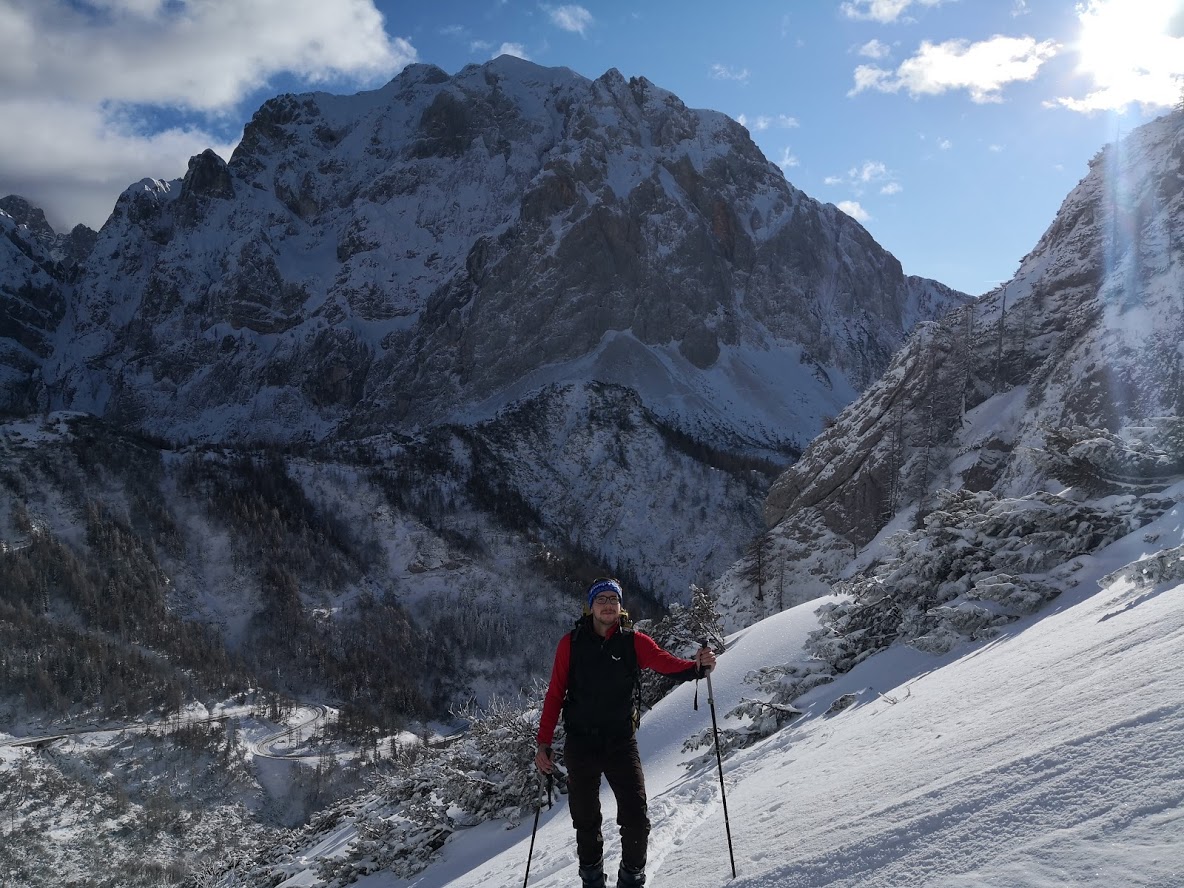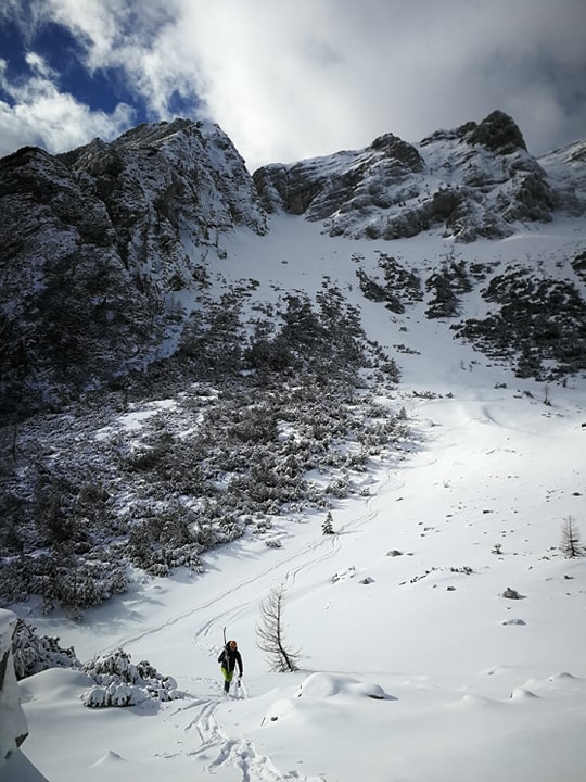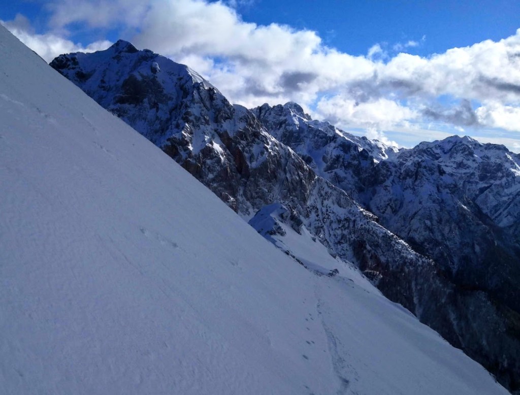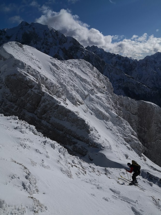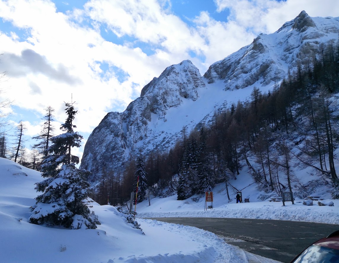 Bojan Ambrožič posted: ” Cesta na Vršič je bila zjutraj deloma zasnežena, a brez težav prevozna do vrha. Presenečena sva bila, da sva bila prva turna smučarja. Spodaj na Vršiču je še zelo malo snega. Višje pa je snega dovolj. Sneg je bil za hojo zelo nenavaden – nekakšne kroglic”