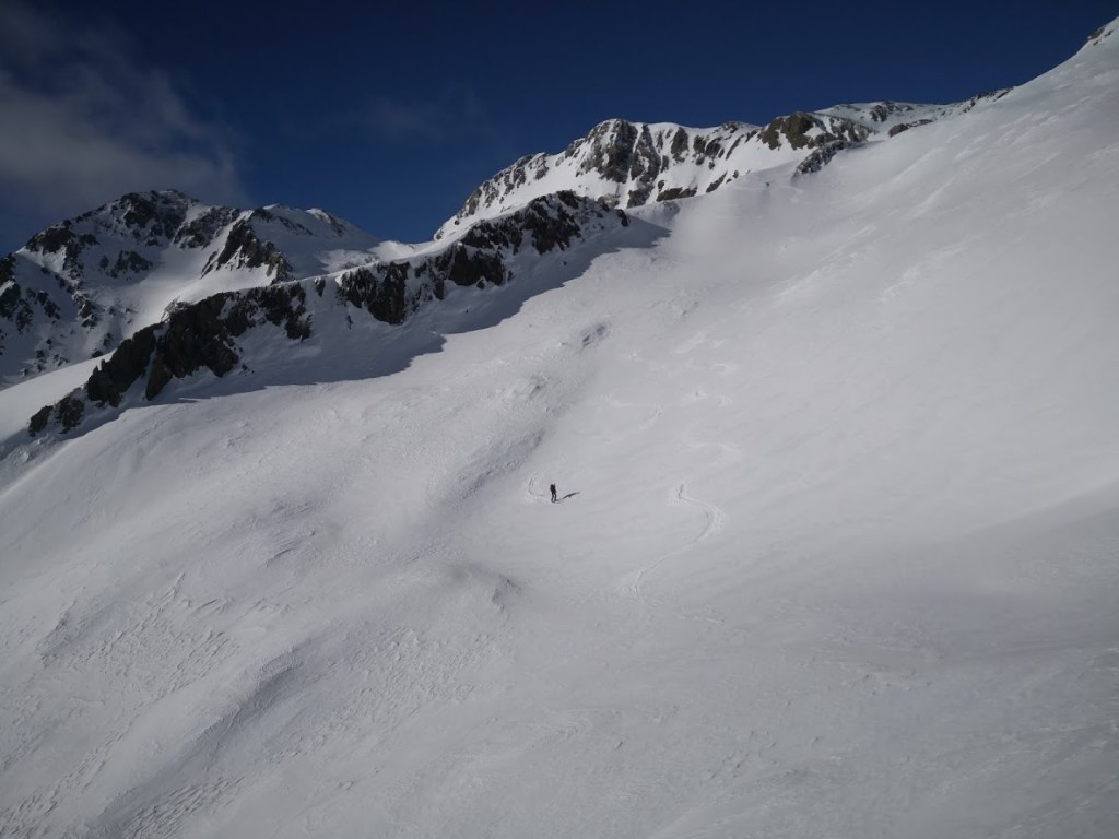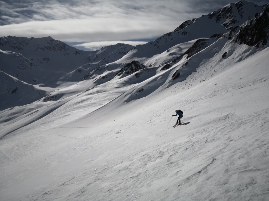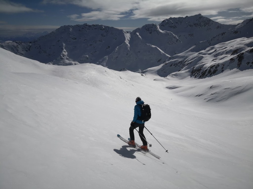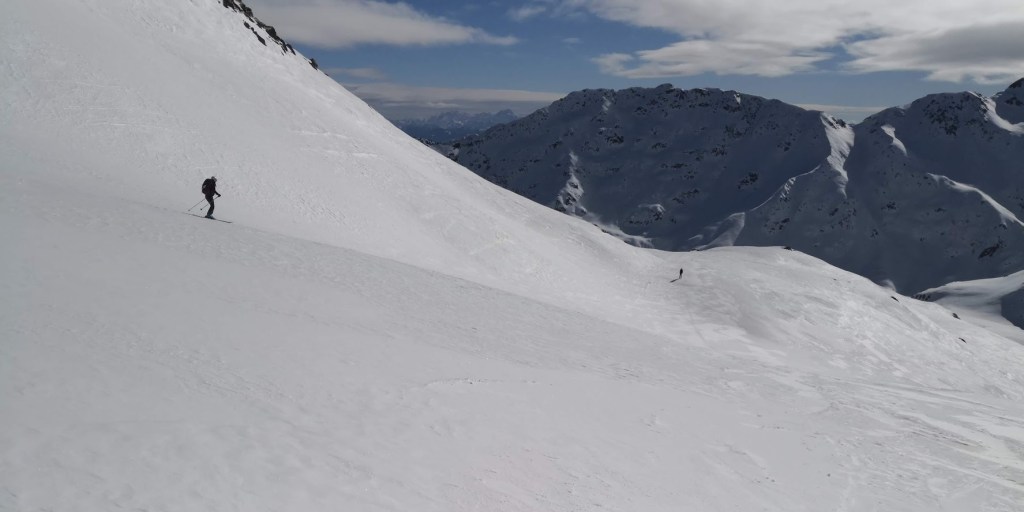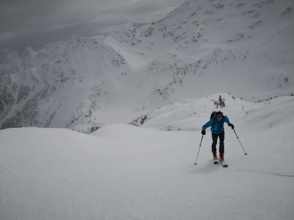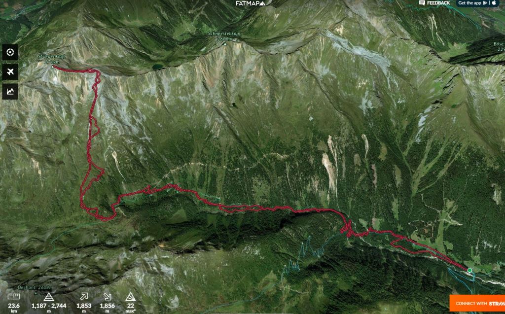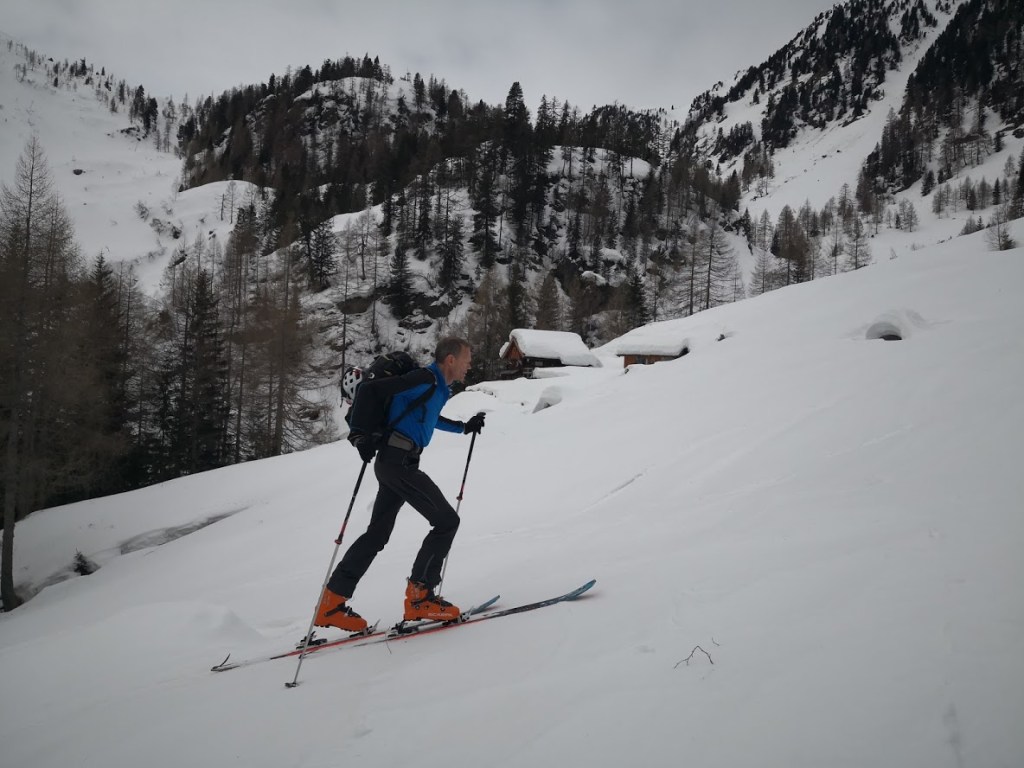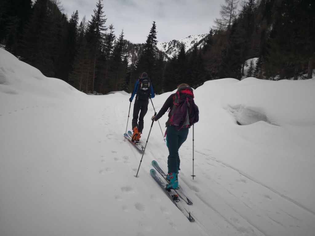 Izhodišče za turo je gostilna Alpenheim v dolini potoka Teuchlbach. Do sem je z Gorenjske res blizu. Poleg tega pa je cesta dobro prevozna. Nizka višina izhodišča (1179 m) pa na drugi strani pomeni dolgo turo in možnost, da snega spodaj ni dovolj. Na srečo smo lahko na smuči stopili že na parkirišču. Nato je sledil kar 8 km dolg vzpon po gorski cesti do lovske koče Bärenkopfhütte (2002 m). Prve 3 km je snega na cesti malo, nato pa nenadoma (v enem samem ovinku) ob prehodu v mrzlo soteska potoka debelina snežne odeje naraste za faktor deset. Nad lovsko kočo smo nadaljevali desno po dolini navzgor do sedla pod Koto 2639 m (glejte GPS sled). Vreme je bilo večji del ture slabo: ves čas je po malem snežilo, ob tem pa nas je še mučila difuzna svetloba. Nad sedlom se je vreme končno močno izboljšalo. Zadnjih 50 višinskih metrov do vrha Striedenkopfa smo se zaradi izpostavljenega grebena vzpeli peš. Ponoči je padlo nekaj centimetrov pršiča, čez večinoma trdo podlago. Zato je bila smuka vse do lovske koče zelo dobra. Pod kočo pa se pelje večinoma samo še po cesti. Pod višino 1450 m snega na cesti ponekod zmanjka. Pripeljali smo se do avta (s tremi kratkimi prestopi). Še ena tura za samotno uživanje v lepotah gorske narave. Na poti cel dan nismo srečali nobene druge skupine.