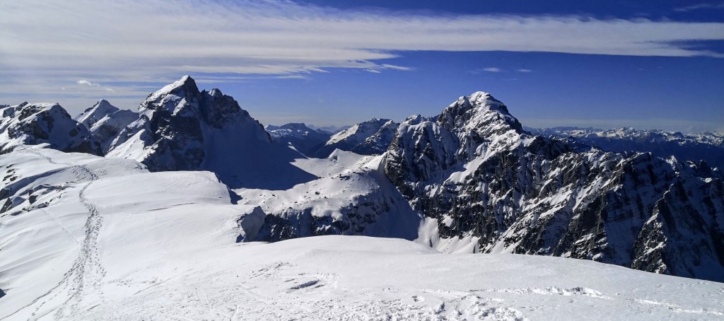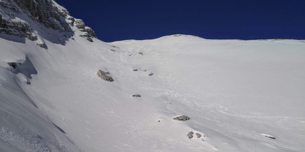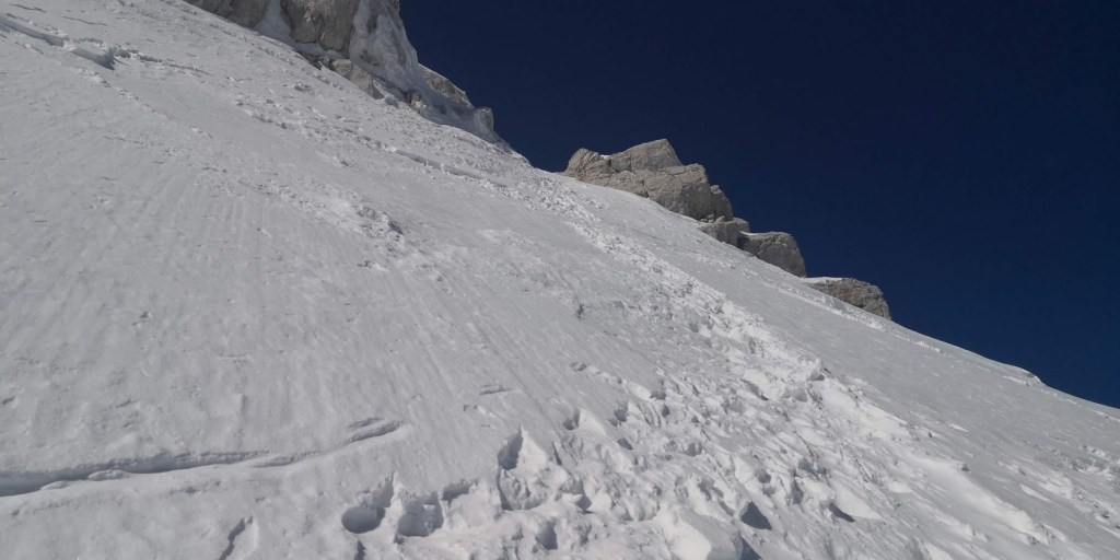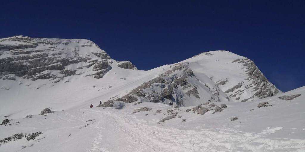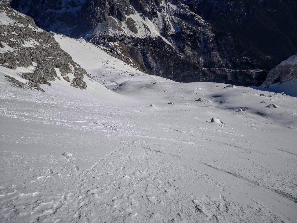 MOJSTROVKA. Ker je bil napovedano vetrovno vreme so odpadli Avstrijski hribi. Zato sem se sam odpravil na Vršič. Čez Grebenec sem se najprej povzpel na Malo Mojstrovko (avtocesta). Z vrha sem odsmučal dva zavoja do sedla in nato peš nadaljeval na Veliko Mojstrovko. Z Velike sem se po grebenu vzpel še na Zadnjo Mojstrovko. S tod je res lep razgled na Jalovec in Mangart. Smuka z Velike Mojstrovke je bila odlična. Sneg je bil nekakšna mešanica pršiča in krogljic – babjega pšena. Edini minus ture je, da nad Vratci za nekaj 10 m zmanjka snega. Pod Vratci pa so bile do Vršiča spet krogljice. Pripelje se do par 10 (dolžinskih) metrov od ceste. Skratka, za to bogo zimo, super tura.