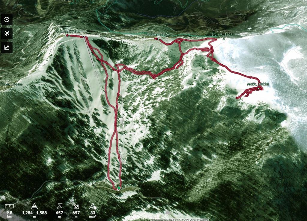 Začela sva na smučišču Soriška planina. Nato sva se po mulatjeri (mimo kasarne) vzpela na Možic (1602 m). Ponekod je pihal močan veter. Zato so bila vetru izpostavljena pobočja spihana in skorajda brez snega. Na zavetrnih straneh pa je situacija obratna – mešanica pršiča in napihanega snega. Tak sneg je bil tudi na severnem pobočju Možica. Seveda sem ga izkoristil za nekaj uživaških smučarskih zavojev. Nato nazaj gor na vrh. Nadaljevala sva proti Slatniku (1609 m), ker sva videla, da je tam dober sneg. Do tja sva posmučala po mulatjeri. Na vršnem pobočju Slatnika sva naredila nekaj dobrih zavojev. Smuka spodaj skozi gozd do smučišče pa je bila slaba in polna min. Nazadnje sva se vzpela še na Lajnar (1549 m). Zgoraj je bilo spet dobro za vozit po mešanici sveže napihanega snega in babjega pšena.