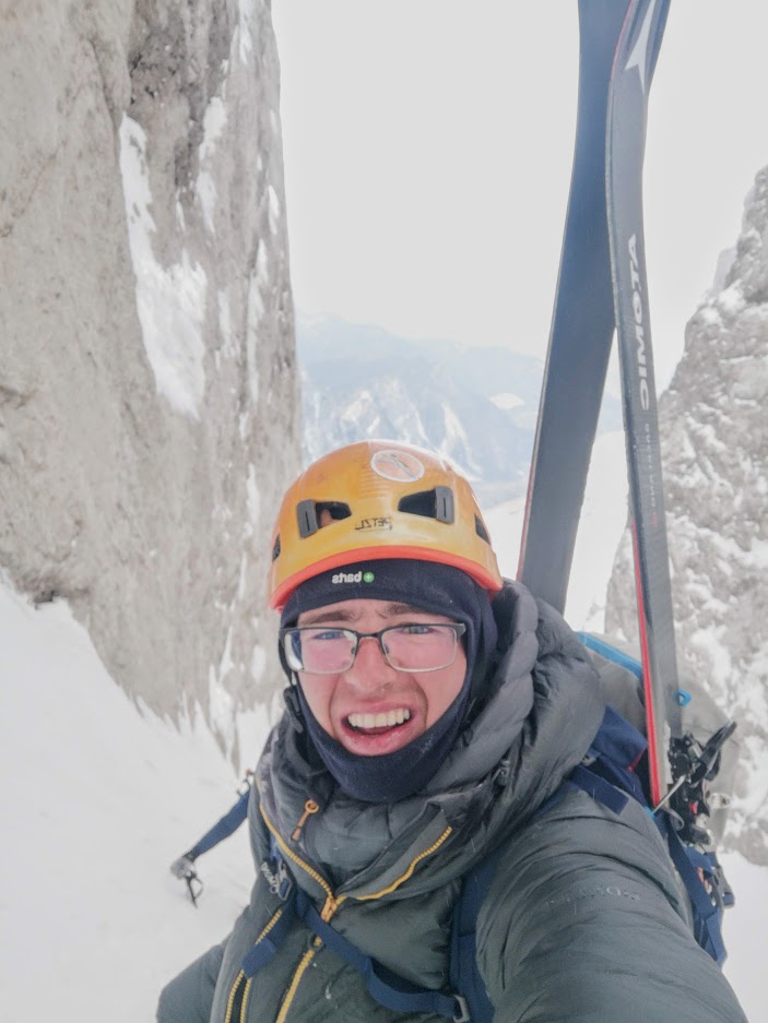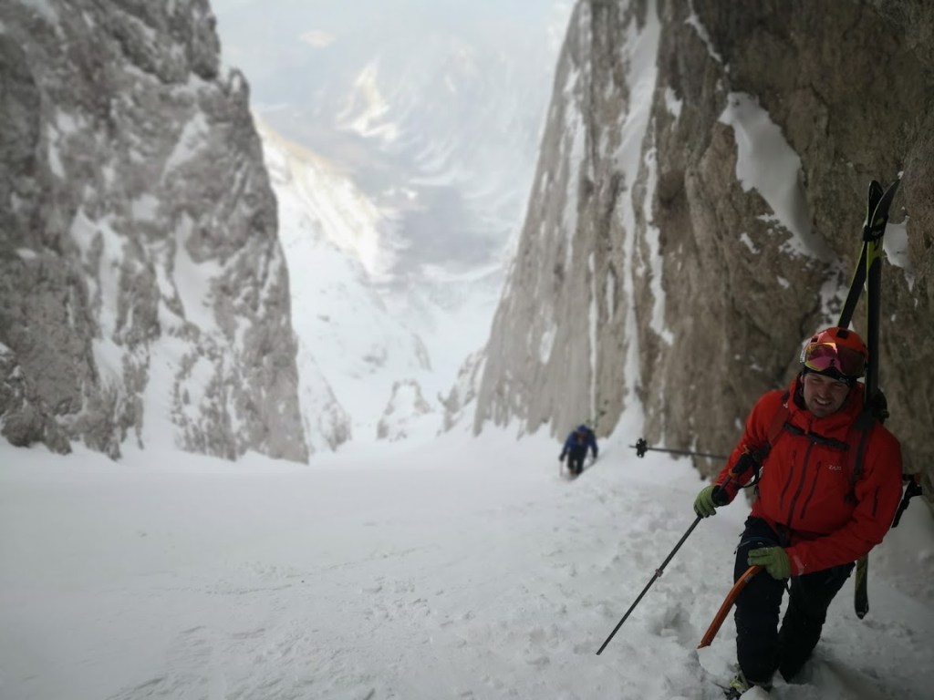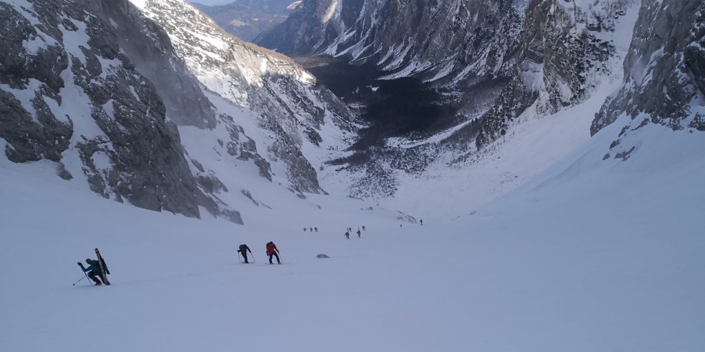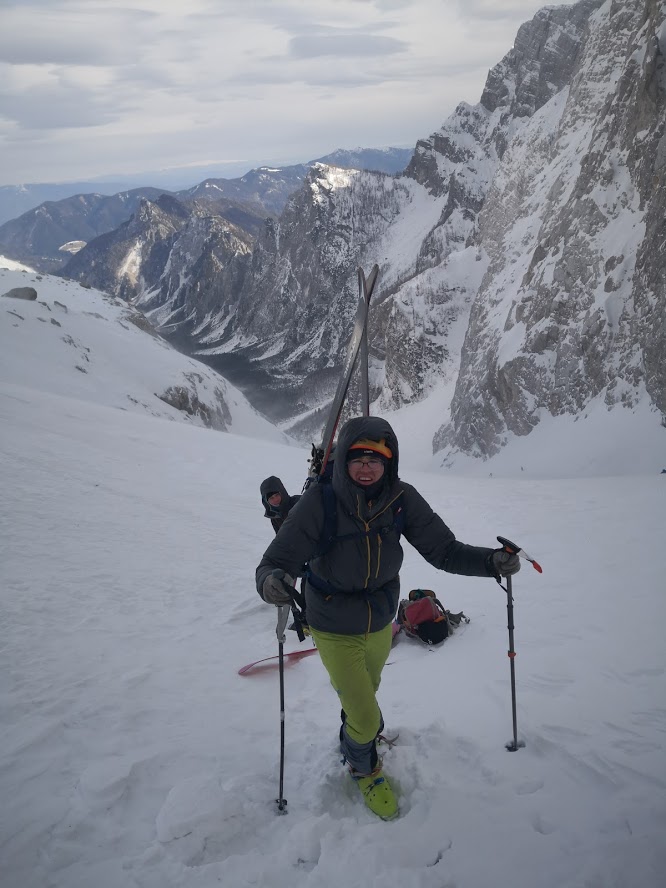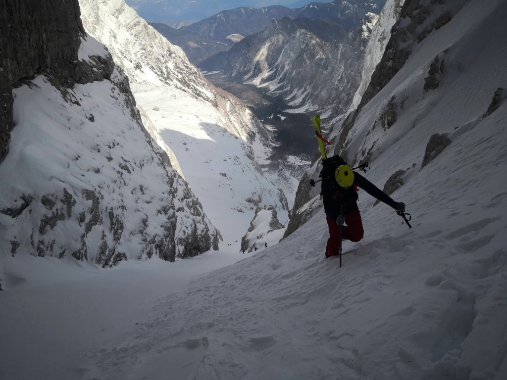 Najprej nerodno drsanje po zaledeneli cesti s Planice v Tamar in nato naprej proti zatrepu doline. Snega je več, kot en slab mesec nazaj. Žal pa smo imeli zelo slabo vreme. Pihat je zelo močan veter, ki je s seboj nosil oblake sneg. Vmes sem se že začel spraševat, v čem je sploh smisel našega početja. Ampak s trmo vse da. Kolegi me dostikrat zafrkavajo, ker nosim zelo velik nahrbtnik in ker mi je premajhen še kaj na njem. Tokrat mi je skorajda sva oprema prišla prav – primaloft puhovka in še čez njo oblečena puhovka iz gosjega puha sta mi omogočila, da sem se počutil toplo, tudi če je bil občutek mraza krepko pod minus 20 °C. Nekdo pred nami nam je zgazil ozebnik. Zato je skozenj šlo ekspresno hitro. Poleg tega v ozebniku ni bilo vetra. Ker sta kolega zaostala in me je še vedno zeblo sem izkoristil “prosti čas”, da se vmes en del ozebnika presmučal. Razmere so bile super. Potem pa spet peš nazaj gor. Na srečo na vrhu ozebnika ni močno pihalo. Vseeno smo vsi komaj čakali, da se zapodimo skozi koluar.