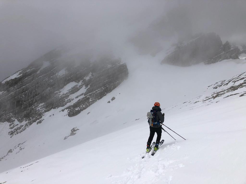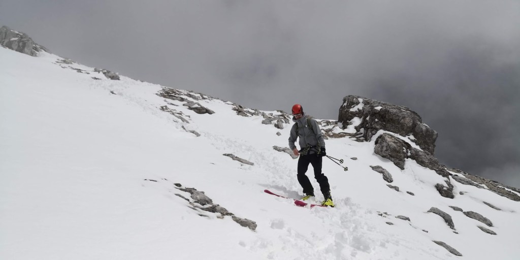 Do začetka snega sem s prelaza hodil samo 15 min. Poleg tega je ponoči zapadlo 10 cm novega snega. Vse to mi je obetalo dobro smuko. Nad Vratci je bilo 10 min kopno, tako kot celo letošnjo zimo. Nato sem zavil levo v grapo med obema Mojstrovkama. Grebenu Mojstrovke sem se namenoma izognil, saj so bile zaradi novega snega tam zelo smotane razmere za hojo: to je nov sneg čez gladke, apnenčaste skale, kar je dobesedno recept za pobijanje. Po grapi pa mi je šlo kar hitro navkreber. Žal je bilo na vrhu Mojstrovke megleno.