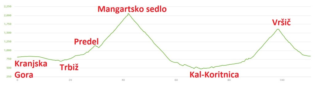 Slaba vremenska napoved mi je odnesla hribe. Zato sem si na hitro zamislil kolesarski izziv. Začel sem na smučišču v Kranjski Gori. Nato pa sem po kolesarski stezi nadaljeval do Trbiža in nato mimo Rabeljskega jezera na prelaz Predel. S Predela sem se spustil slaba 2 km. Nato pa sem zavil na Mangartsko cesto. Le ta je bila super za kolesarjenje, ker ni bilo skorajda nobenega prometa – zaradi prezasedenega parkirišča, so spuščali avtomobile le v primeru, da se je kdo vrnil. V praksi je to pomenilo en avto na 15 minut. Avtomobilom zadnje 2 km ni dovoljena vožnja. S kolesom pa ni težav (vmes 2 m makadama). Z Mangartskega sedla (2050 m) je sledil 30 km dolg spust do Kal-Kortinice (450 m) pri Bovcu. Nato pa sem zavil v Trento. Cesta je tu zelo lepa, saj ves čas pelje ob reki Soči. Kilometri so mi hitro minevali. Nato pa me je čakalo še 15 km in 1100 višincev vzpona na Vršič. Bil sem že zelo izmučen in sem le še s težavo vrtel pedala, pa čeprav z najlažjim prenosom. Za vzpon na Vršič sem potreboval kar 2 uri. Na vrhu sem izmučen samo legel v travo. Niti stati nisem več mogel na nogah. Z vrha prelaza sem imel samo še spust do cilja. Vendar mi tudi to ni bilo lahko, saj sem dobil krče v prste na rokah, zaradi česar sem le še s težavo stiskal zavore. Bolelo me je celo telo. Moja vožnja pa je bila bolj podobna vožnji pijanca. Ampak sem preživel. Na koncu se je nabralo 110 km in 2680 višinskih metrov vzponov.