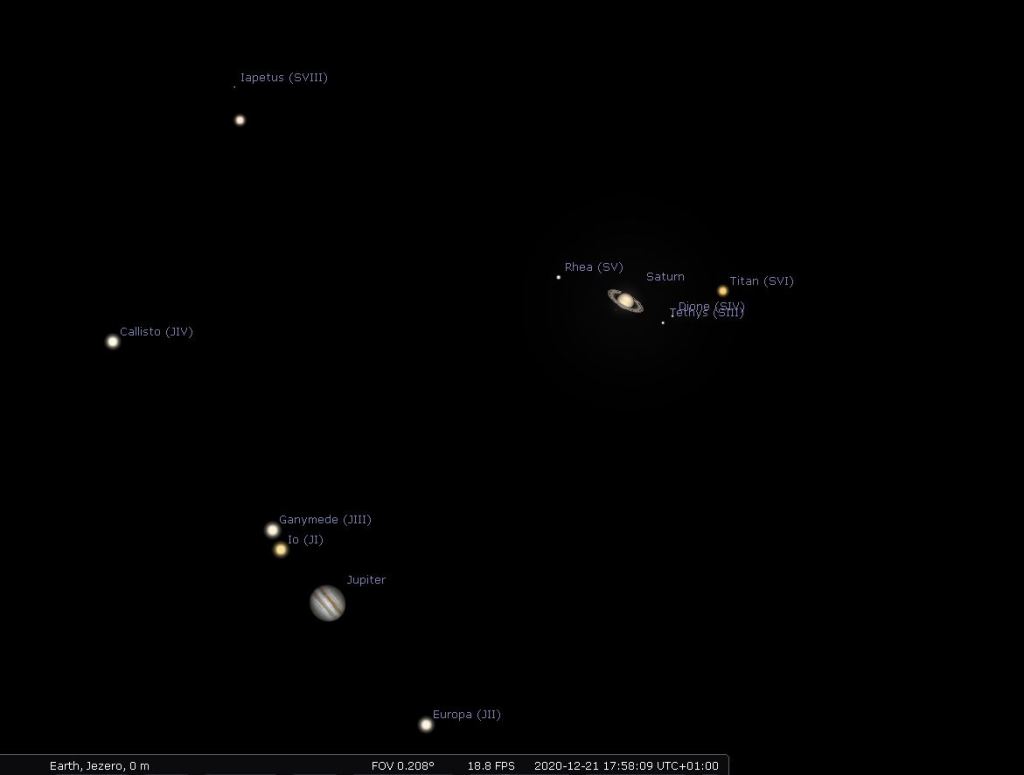 Konjukcija je astronomski pojav, ko je dve ali več nebesnih teles možno videti zelo blizu skupaj na nebu. Konjukcije same po sebi niso redek pojav. Bolj ali manj tesne konjunkcije Lune z enim izmed planetov lahko opazimo vsaj enkrat mesečno. Zelo redko pa se zgodi, da sta dva planeta videti tako zelo skupaj, da se skorajda prekrijeta. Jupiter in Saturn bosta 21. decembra 2020 navidezno najbližje v zadnjih 397 letih! Med seboj bosta oddaljen samo 0,1 ločne stopinje. Oba planeta sta bila zadnje pol leta vidna s prostim očesom, kot najsvetlejši “zvezdi” na večernem nebu. Ob tej veliki konjukciji pa bosta tako zelo blizu, da bosta s prostim očesom vidna kot ena svetla zvezda. Še bolj zanimivo je to, da bosta planeta v povprečnem amaterskem astronomskem teleskopu oba videti hkrati. Težava tokratne konjukcije je, da bosta planeta nizko nad jugozahodnim obzorjem. Nizka višina pa pomeni, da bo planeta skozi teleskop zahtevneje opazovati zaradi nemirne Zemljine atmosfere (t. i. slabega siinga). Če se ob vsem tem sprašujete ali je možno, da se dva planeta povsem prekrijeta? Da, seveda. Temu pojavu pravimo okultacija. Nazadnje se je okultacija Jupitra in Saturna zgodila leta 6856 pred našim štetjem, naslednjič pa se bo šele leta 7541.