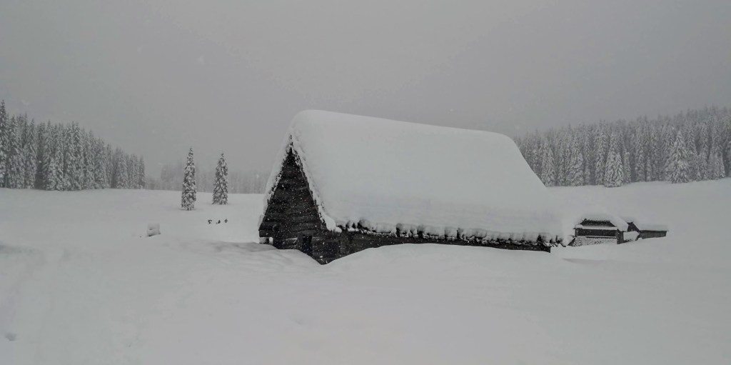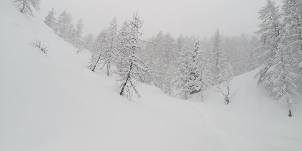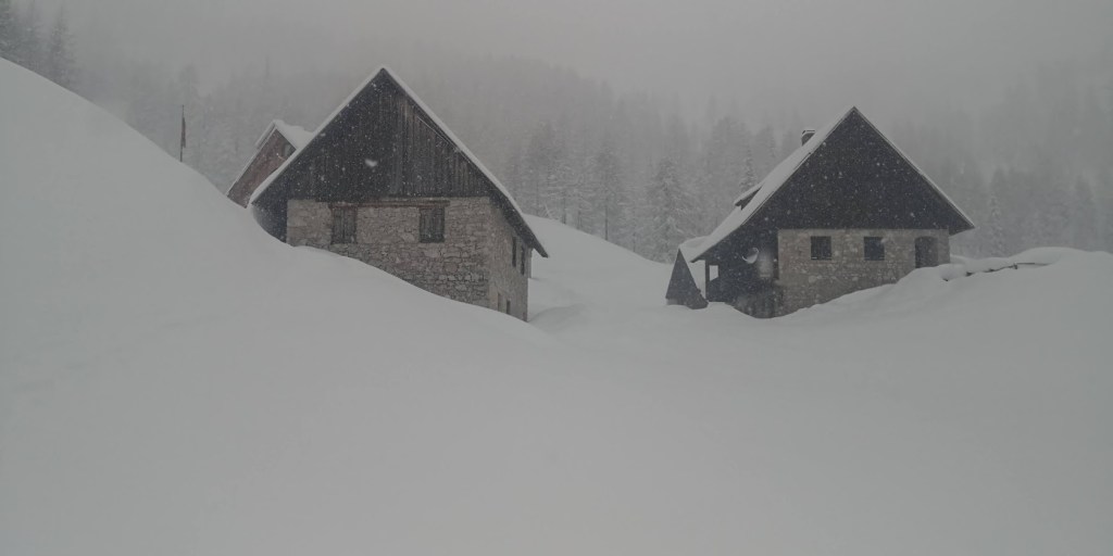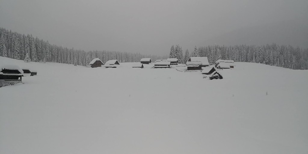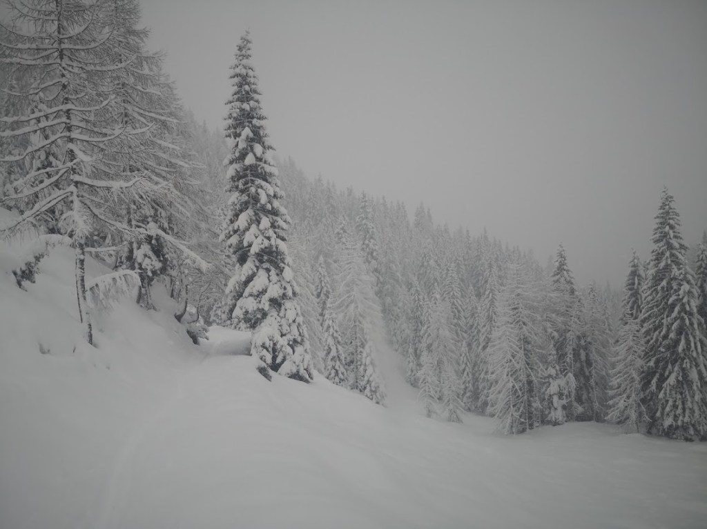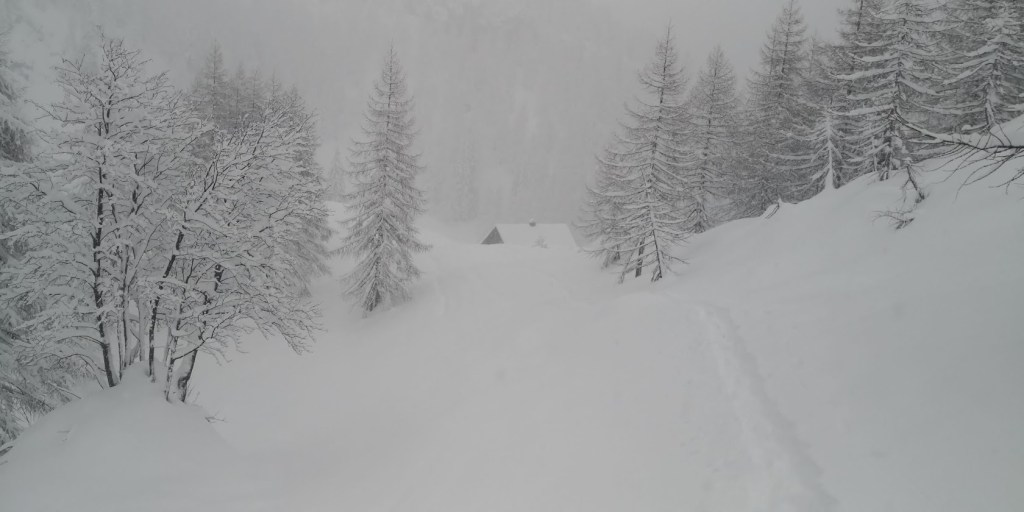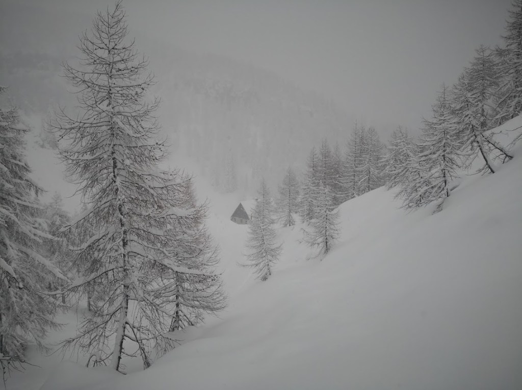 Prvi podvig dneva se je bilo po popolnoma nespluženi cesti pripeljati na Pokljuko. Parkiral sem pri odcepu za Šport hotel in zaril gaz proti planini Javornik. Ker je bil sneg zelo suh, sploh ni bilo težko gazit. Do planine Lipance ni bilo posebnosti. Le višina snega je z nadmorsko višino hitro naraščala. Ves čas pa je močno snežilo. Nad Lipanco sem se usmeril proti Mrežcam. Kmalu se je pojavil orkanski veter, zaradi česar je postalo mrzlo. Hkrati pa se je zaradi zaves snega vidljivost zelo poslabšala. In najslabše: zaradi obilice snega je že med hojo navkreber sneg plazil. Zato sem samo 150 višincev nad kočo obrnil (beri hitro pobegnil z gore). Nad kočo je bilo preveč snega za kaj drugega kot smučanje naravnost. Pod kočo pa kaj dosti smučanja tako ali tako ni. Na avtu pa sem nazaj grede imel toliko novega snega, da sta me mimoidoča vprašala, če imam avto tu od včeraj.