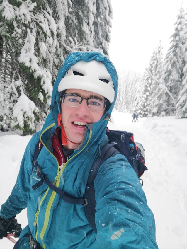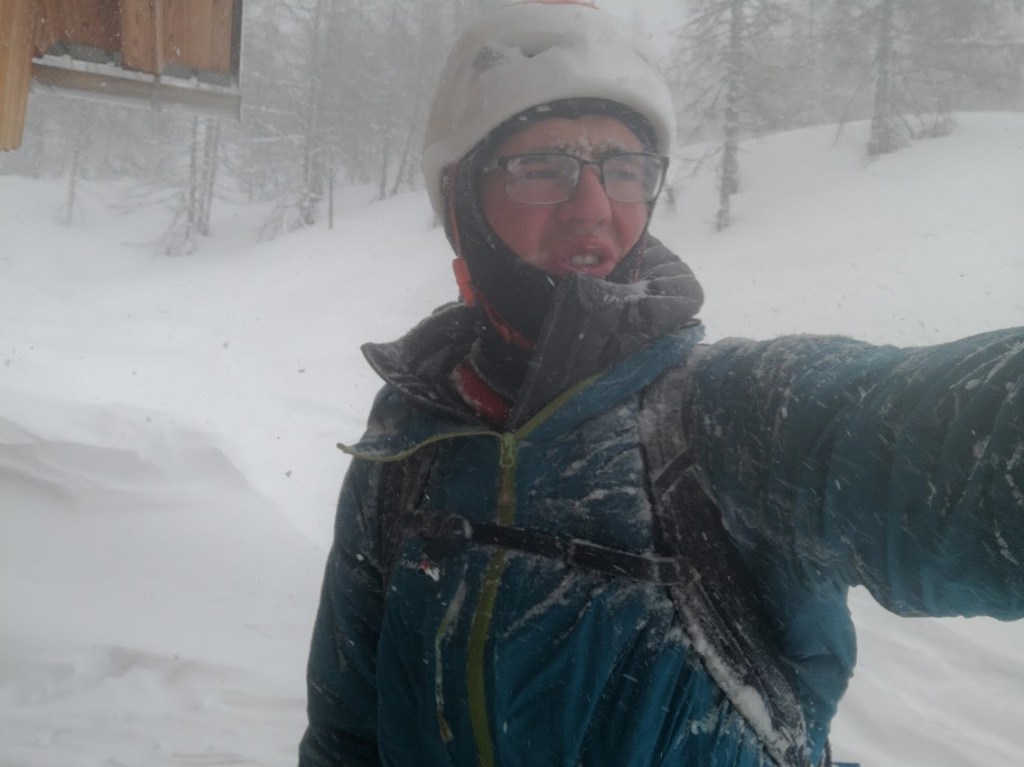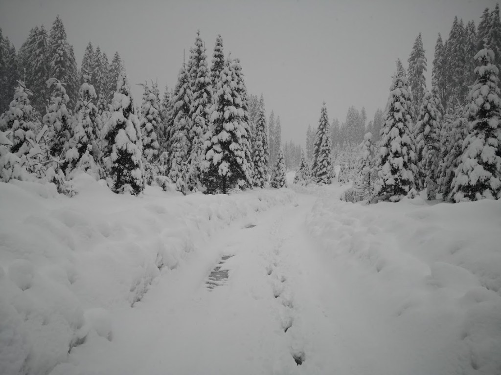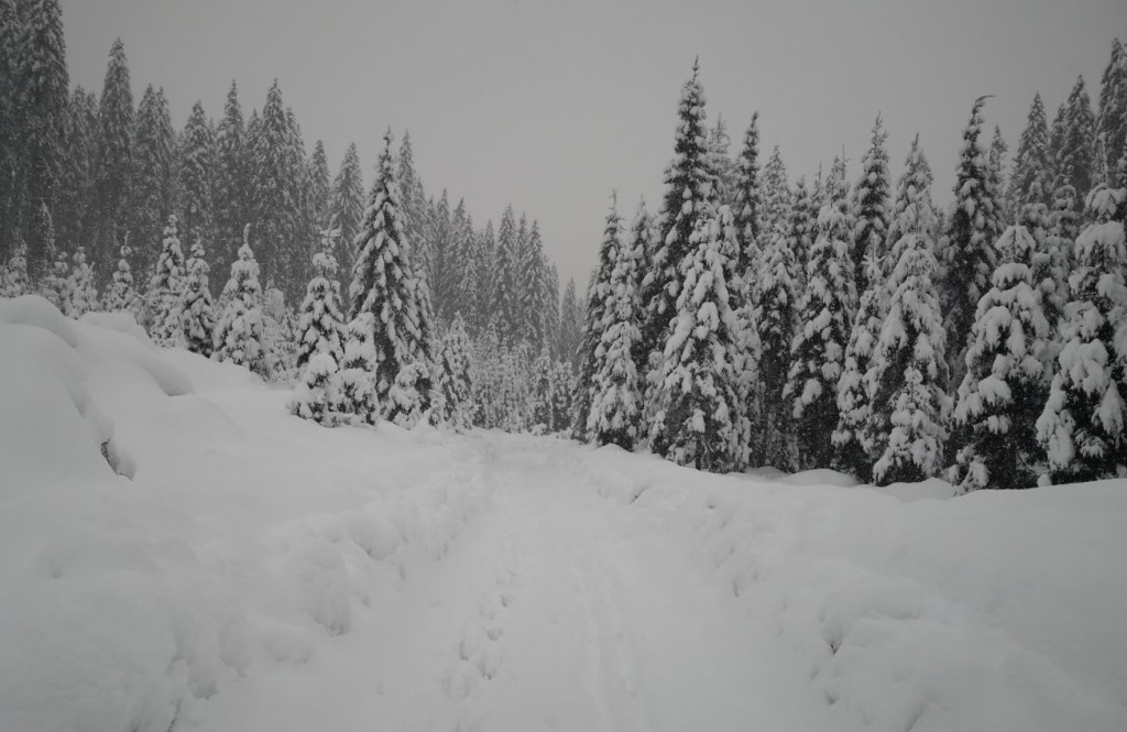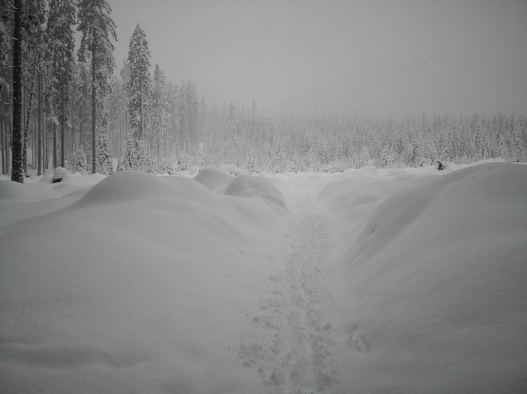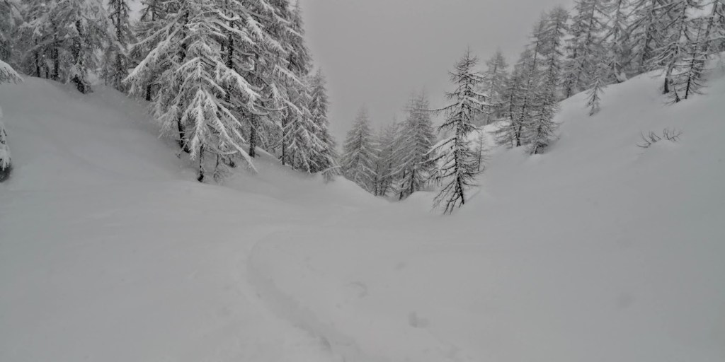Prvi podvig dneva se je bilo po popolnoma nespluženi cesti pripeljati na Pokljuko. Parkiral sem pri odcepu za Šport hotel in zaril gaz proti planini Javornik. Ker je bil sneg zelo suh, sploh ni bilo težko gazit. Do planine Lipance ni bilo posebnosti. Le višina snega je z nadmorsko višino hitro naraščala. Ves čas pa je močno snežilo. Nad Lipanco sem se usmeril proti Mrežcam. Kmalu se je pojavil orkanski veter, zaradi česar je postalo mrzlo. Hkrati pa se je zaradi zaves snega vidljivost zelo poslabšala. In najslabše: zaradi obilice snega je že med hojo navkreber sneg plazil. Zato sem samo 150 višincev nad kočo obrnil (beri hitro pobegnil z gore). Nad kočo je bilo preveč snega za kaj drugega kot smučanje naravnost. Pod kočo pa kaj dosti smučanja tako ali tako ni. Na avtu pa sem nazaj grede imel toliko novega snega, da sta me mimoidoča vprašala, če imam avto tu od včeraj.