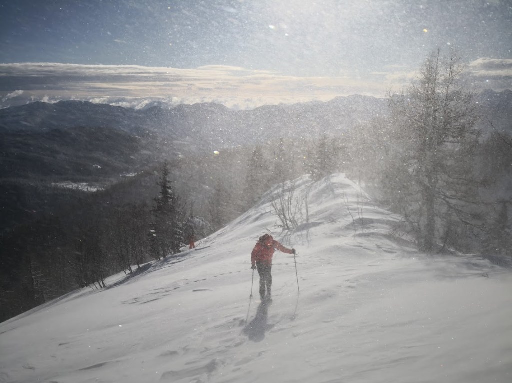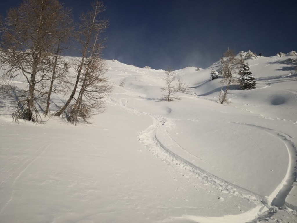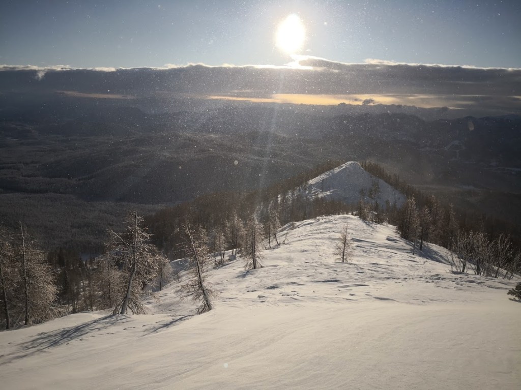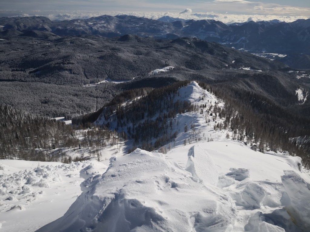 Začel sem na Rudnem polju ob tako zgodni uri, kot je bilo zaradi korona pravil to mogoče. Kljub temu se je že ob tej uri kar trlo turnih smučarjev. Med prvimi sem zagrizel proti Viševniku. Gaz so potegnili že včeraj. Tako, da mi gre hitro. Nekoliko me le zaustavljata mraz in veter. Na srečo je najbolj pihalo na Plesišču. Višje pa potem niti ne. Obrnil sem na vznožju plazovin na višini 1900 m. Odsmučal sem po pobočju in neki grapi na planino Konjščico (glejte GPS sled). Sneg je bil idealen – pršič je neslo čez ušesa. S Konjščice sem sledil špuri na Mesnovo glavo. Potem sem pod grebenom prečil desno proti vrhu Slemena (1823 m). Smučal sem naravnost navzdol po zelo strmem gozdu. Zgornjih 100 višincev je bila že rahla skorjica, potem do Konjščice pa spet uživaški pršič. S Konjščice sem se vnovič povzpel na Plesišče. V tem času so bila vso pobočja od Konjščice že čisto razrita. S Plesišča sem nadaljeval proti Viševniku do višine 1950 m in nato odsmučal po gozdu na Rudno polje. Nabralo se je 1700 uživaških višincev smučanja pršiča. Na Rudnem polju pa me je pričakalo še eno presenečenje: prometni kaos. In sicer ker je na Rudnem polju že zdavnaj zmanjkalo parkirišč, so avtomobile puščali ob glavni cesti v obliki nepretrgane kolone, ki je segala od vojašnice pa vse do Šport hotela, kar znese 4 km!