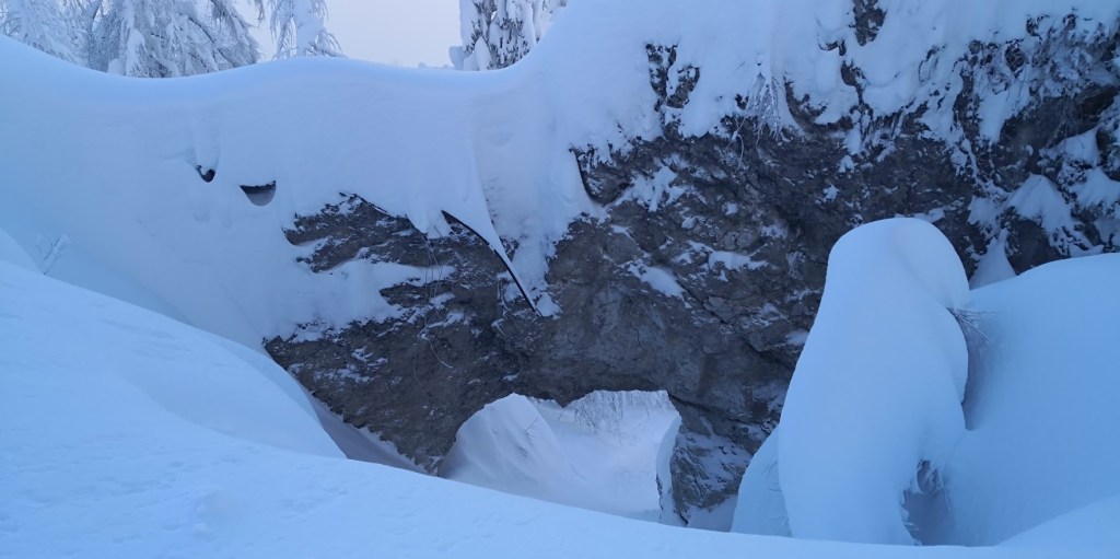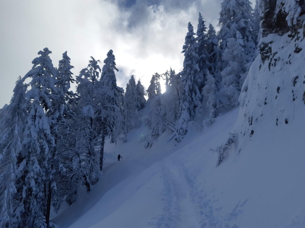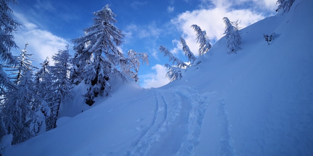 V Kranjski Gori je ponoči zapadlo tako zelo veliko novega snega, da ji lahko po novem rečemo kar “Slovenska Japonska – Hokkaido“. Odlične razmere za uživanje v pršiču so privabile zares neverjetno veliko število turnih smučarjev. S turo sem začel na parkirišču v Kranjski Gori, ker tisto v Podkorenu še ni bilo spluženo. Po zratrakirani progi in dobro utrujeni smučini, ki je izgledala kot da že 14 dni ni bilo novega snega (in ne 2 uri), sem se podal proti vrhu Vitranca. Obrnil sem pred prečko zarad nevarnosti plazovi in odsmučal v Podkoren. Smuka je bila ves čas vrhunska – sploh ni kaj za dodati. Le zadnjih 100 višincev je bil pršič že južen. S Podkorena sem se povzpel nazaj gor – tokrat do Mojčine koče na vrhu Vitranca, saj so me vmes kolegi obvestili, da so lavinske razmere dovolj varne. Na vrhu sem imeli srečo, da se je pokazalo sonce in sem lahko uživali v razgledih na Julijce. Z lavinsko sondo sem izmeril 190 cm snega. Smučarske proge so bile v tem času večinoma že zvožene. Zato sem raje nadaljeval desno skozi gozd, kjer se pred mano ni peljal še nihče. Pršiča je bilo toliko, da sem celo pot navzdol vriskal od zadovoljstva. Skupaj se je nabralo kar 1400 višincev smučanja pršiča. Za konec lahko samo rečem: “Arigato Nippon!”