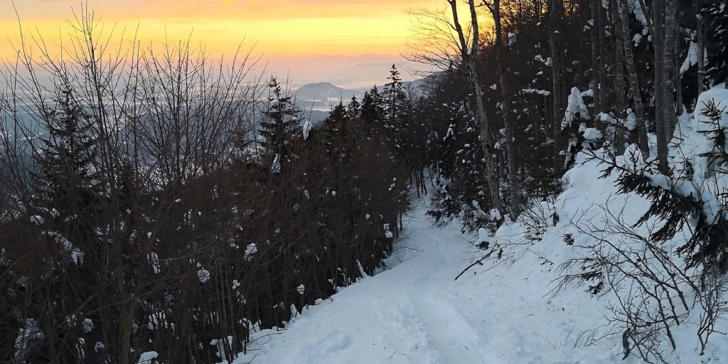 Naslednji dan zvečer sem se na Dobrčo odpravil od sv. Neže (iz smeri Brezij pri Tržiču). Prvi del ture sem hodil po cesti proti Bistriški planini, ki je trenutno pravzaprav sankaška proga. Nato pa sem se prek Breške in Lešanske planine povzpel na vrh Dobrče. Smuka z vrha do Lešanske planine je bil odlična (uležan pršič). Nižje pa je bil sneg preveč skorjast za vožnjo po gozdu. Zato sem se samo še peljal (po precej ledeni cesti) do izhodišča.