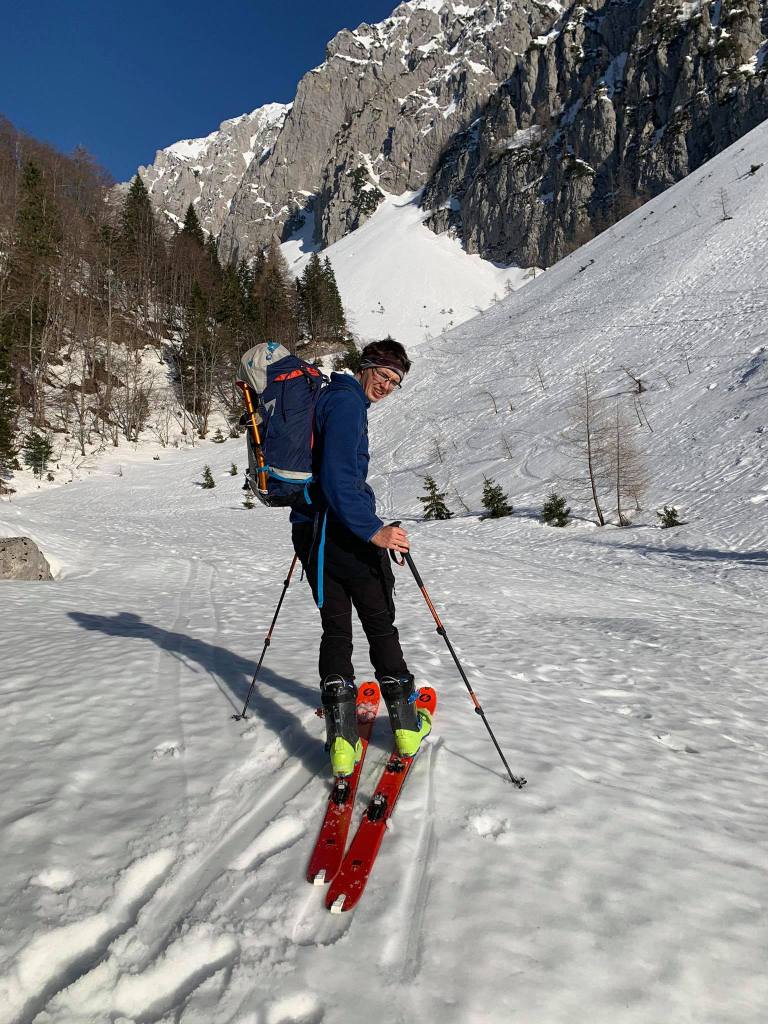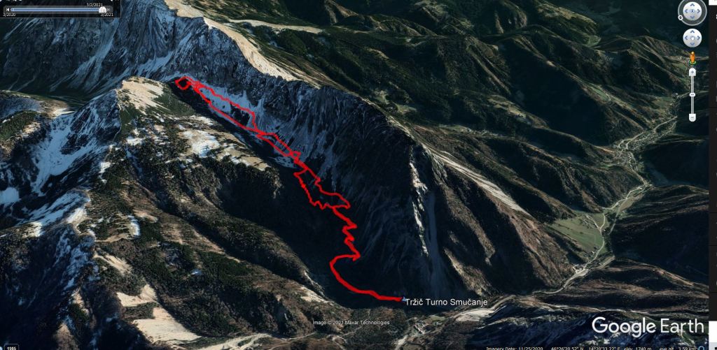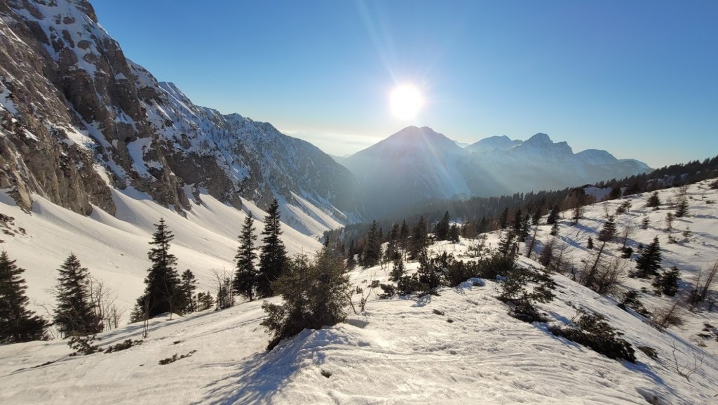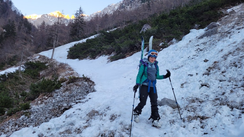 Po službi običajno hodim na turno smuko na Zelenico. Vendar je le ta popoldne v mrzli senci, kar ni preveč prijetno. Zato sem se tokrat raje odpravil v nasproti ležečo dolino – na Hanjževo sedlo, ki pa ga ravno popoldne obsije sonce. In to res ni bila napaka. Sneg za smučanje je bil odličen – spomladanski putrček. Spodaj v senci pa je sneg bil že zamrznjen in trd, kar priča o tem kako pomembno je zadeti pravo časovno okno. Zadnjih 200 višinskih metrov do avta je kopnih.