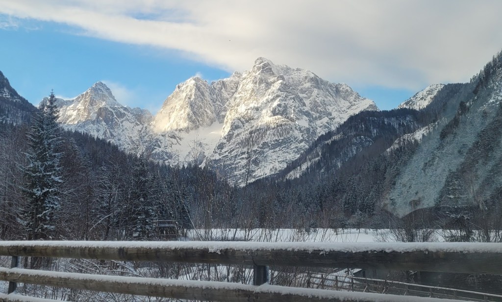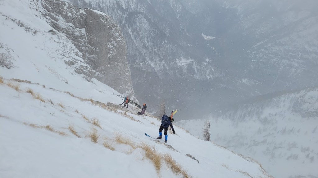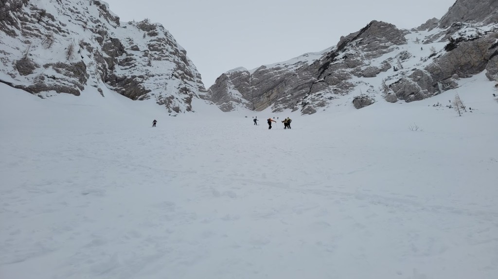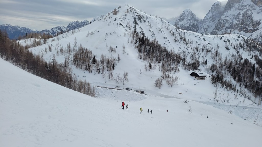 Cesta na Vršič je splužena in prevozna brez zimske opreme. Pohvale cestarjem, da so splužili zelo veliko število parkirnih mest, tudi na predelih ceste, kjer niso ravno glavna izhodišča za ture v hribe. Parkirala sva pri Erjavčevi koči. Nad meterskimi bandami sva nadaljevala na vrh prelaza. Potem pa čez Vrtaca proti Mojstrovki. Vedar se je vmes vreme močno pokvarilo: začelo je snežiti in pihati močan veter. Vendar to dvoje niti ni bil tak problem kot difuza. Sam že tako ali tako slabo vidim. Zato sva se odločil, da dokler se še vidi kaj je gor in kaj je dol, odsmučava v Drevesnico. In res je bila vidljivost zaradi zaves snega, ki jih je prenašal veter na čase nična. Sneg pa se se je spreminjal iz metra v meter: napihanček, skorja, plazovine in trda podlaga. Tu in tam pa sva ujela tudi kak zavoj pršiča. Nazadnje sva spet vpregla pse in se vzpela 300 višincev nazaj gor na Vršič.