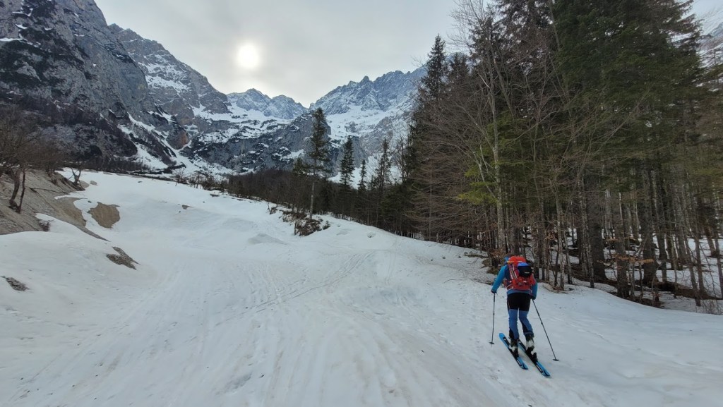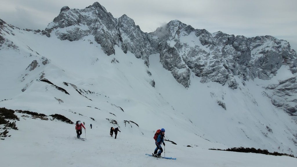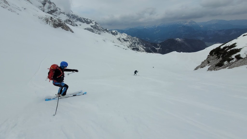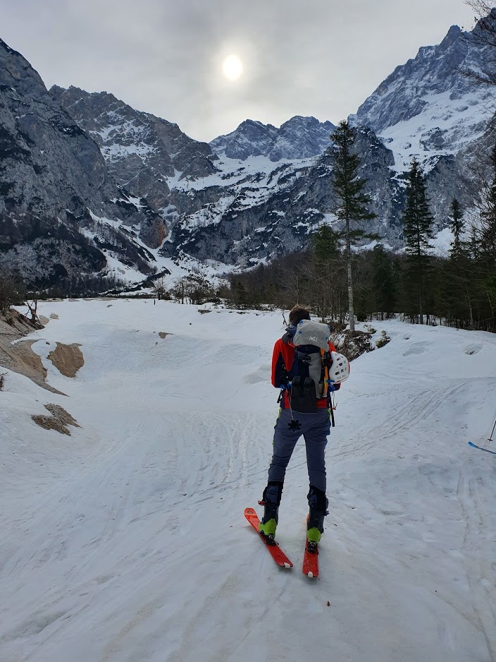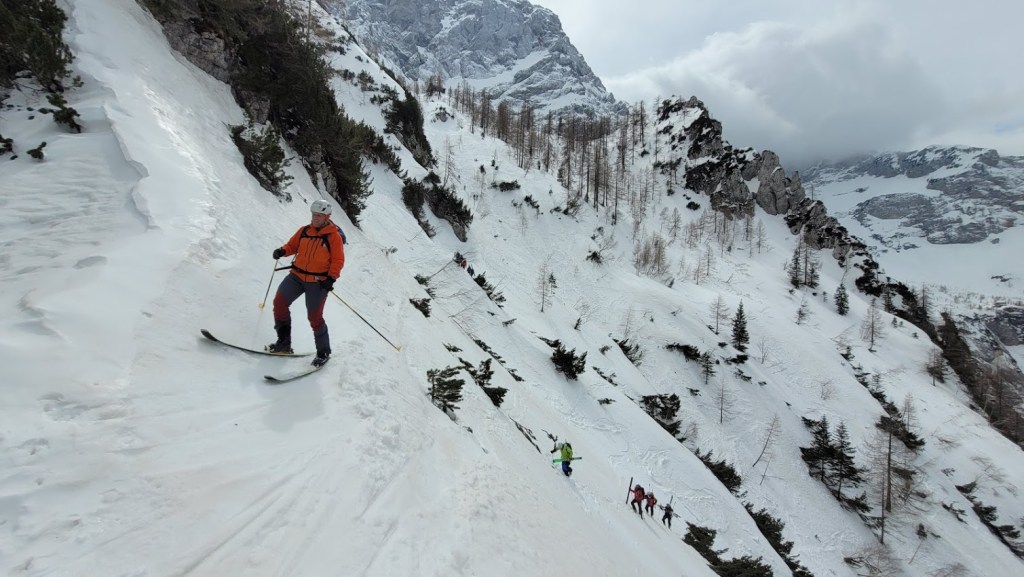 S turo smo začeli na glavnem parkirišču v Ravenski Kočni na Jezerskem. Takoj za parkiriščem se že začne sneg. Na Ledine smo se povzpeli po grapi – kotlom pod Ledinskim slapom. Grapa je lepo prehodna. Vmes je sicer 2 m visok skalni skok, ki smo ga uspeli preplezati s samo z enim cepinom (bi bilo pa lažje z dvema). Nato smo se prek Jezerskega sedla (2001 m) vzpeli na Ledinski vrh (2106 m). Na vrhu gore je zelo malo prostora. Mimo Ledenika pod Skuto smo odsmučali do Kranjske koče na Ledinah. Smuka je bila ves čas dobra po svežem in mestoma odjenanem snegu. Pod kočo teren postane strm in orientacijsko zelo zahteven. V prvem poskusu smo zgrešili prehod desno nazaj v grapo pod Ledinskim slapom (smučali smo preveč naravnost navzdol v območju lovske poti). Zato smo si za nagrado prislužili nabiranje dodatnih višincev. Prehod nazaj v grapo je strm, a ni pretirano izpostavljen. V grapi pa je bilo treba paziti na kamenje. Brez težav smo prismučali do avta, kar je super za sredino aprila.