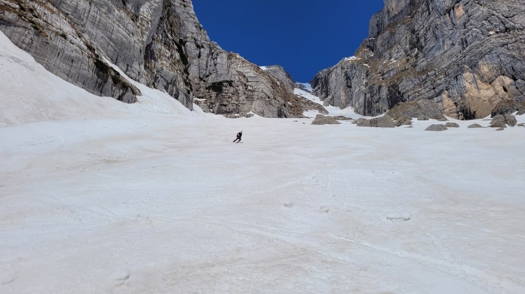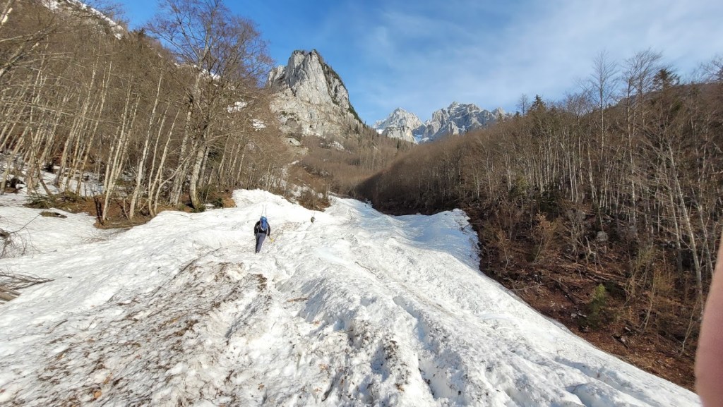 Cesta v Vrata je splužena in normalno prevozna do parkirišča pred Aljaževim domom v Vratih. Sneg je samo spodnjih 100 višincev. Nato je (z izjemo plazovin) do višine 1600 m pot kopna. Po grabnu smo se vzpeli na Stenarska vratca. Nato pa na nadaljevali na drugo stran in po normalni poti na vrh Stenarja. Zaradi toplega vremena je bil sneg zelo zmehčan. Meni je to kar ustrezalo, saj je smuka s Stenarja na nekaterih delih strma. Izpostavljena prečka v desno je bila pa na žalost trda – zato je bila potrebna pazljivost. S smuko smo nadaljevali prek Dovških vratc in čez Sovatno. Sneg je bil na tem delu ves čas zelo južen. Na dnu Sovatne smo prečili desno mimo Bivaka pod Luknjo in nato pod Severno Triglavsko steno. Zaradi ogromnih plazovin je struga Triglavske Bistrice še povsem zapolnjena s snegom. Z nekaj poganjanja mimo klina smo prismučali vse do Aljaževega doma.