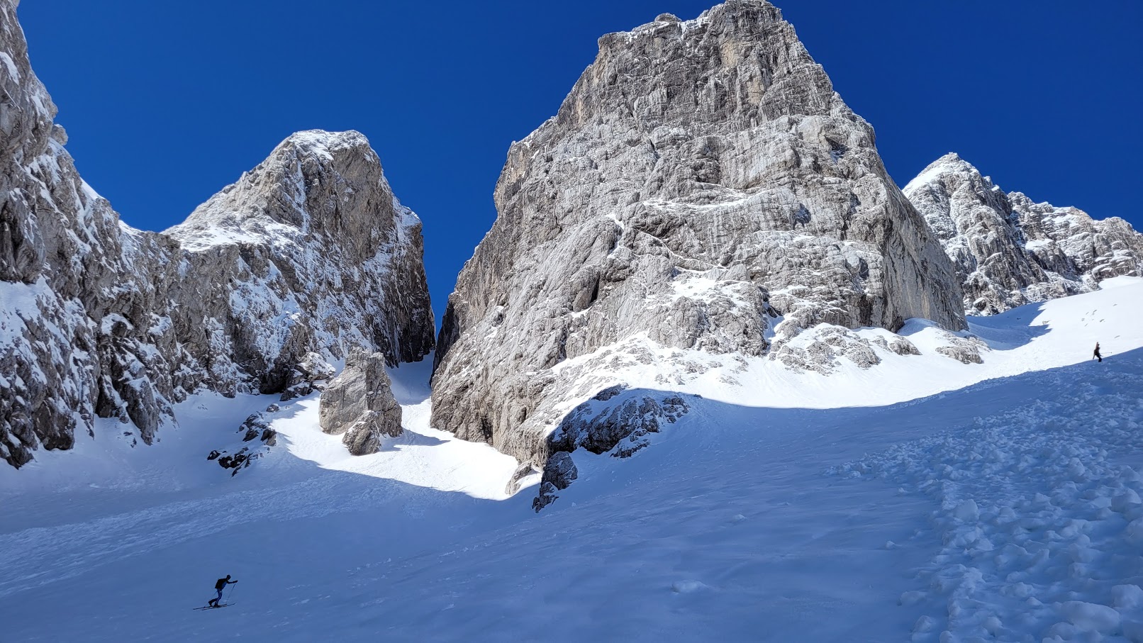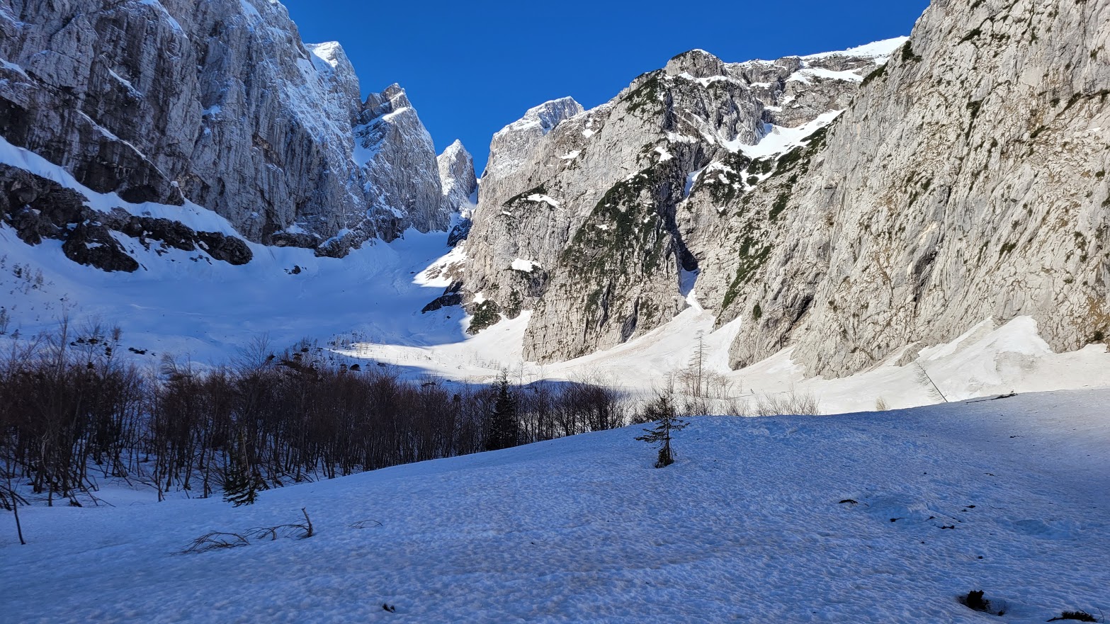 Zvezna snežna odeja se začne na cesti 1 km pred Domom v Tamarju. V Tamarju je trenutno 40 cm snega. Takoj za gozdom so ogromne snežne plazovine. Nato pa je bilo do Jalovčevega ozebnika ves čas zelo trd sneg (obvezni srenači oz. še bolje dereze). Na Kotovem sedlu pa je bil sneg gnil. Ves čas so se s sten usipavali plazovi snega in skal. Zato prehod skozi Jalovčev ozebnik ni bil mogoč. Smuka je bila vseh vrst: zgoraj gnilec, nato trd sneg in skorja, še najbolje je bilo v spodnjem delu, kjer je prevladoval srenjec. Zanimivo mi je bilo videti kako enormno več snega je letos v primerjavi z lani ob enakem času: https://bojanambrozic.com/2020/05/02/jalovcev-ozebnik-3/ (glejte primerjave slik spodaj).