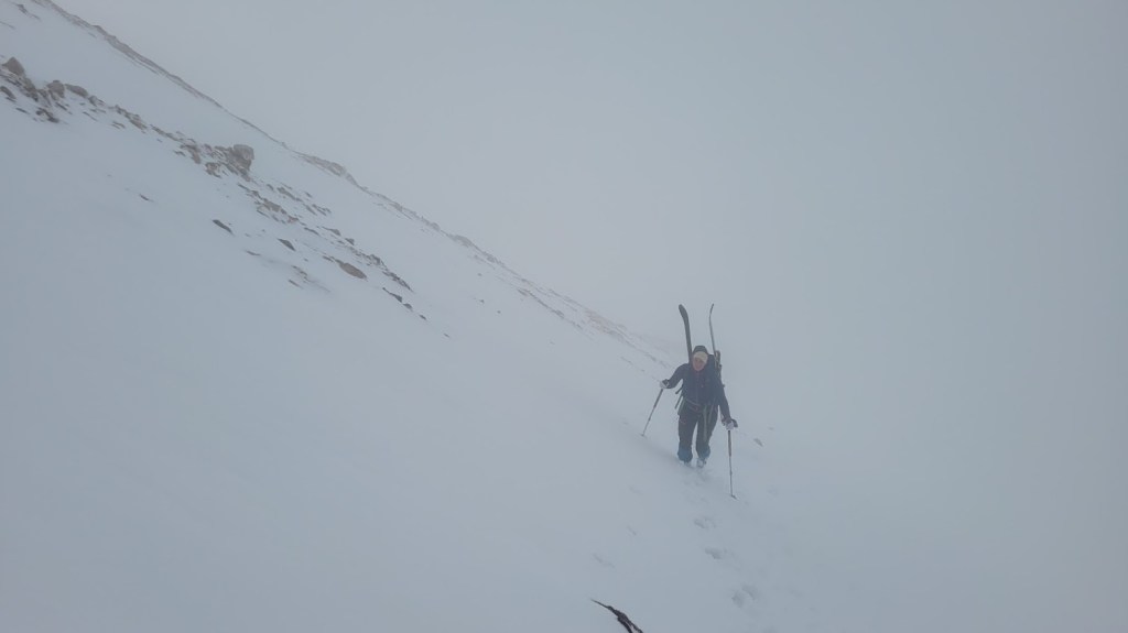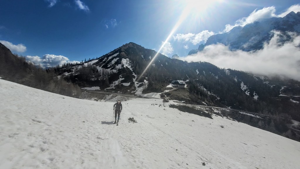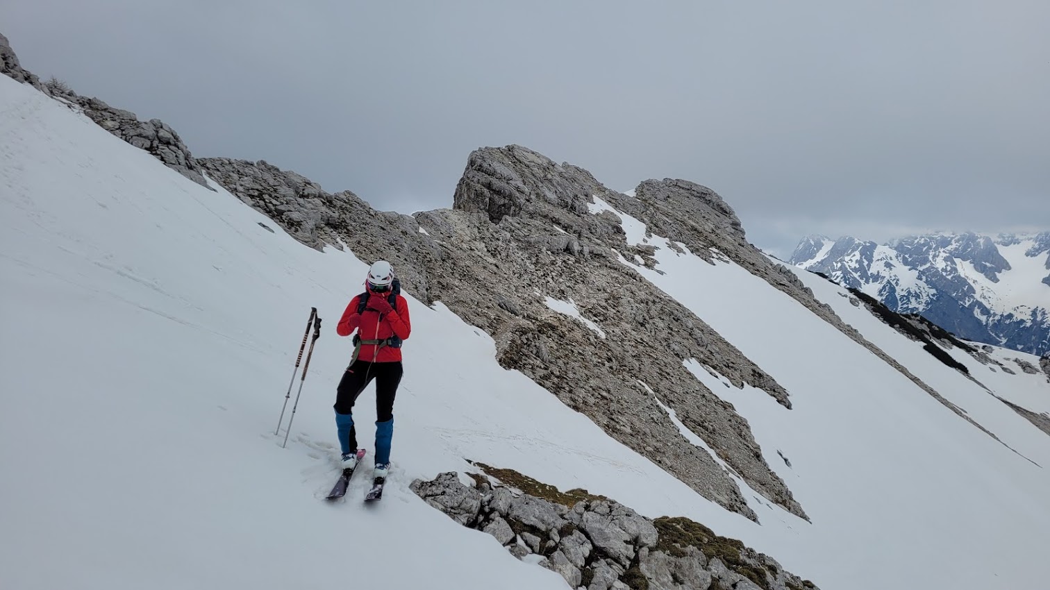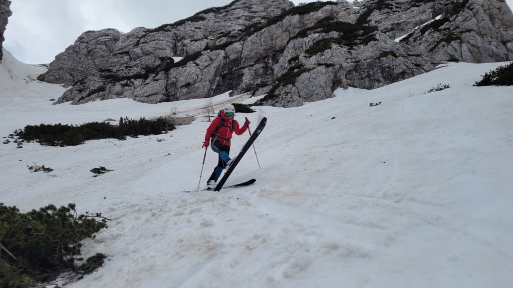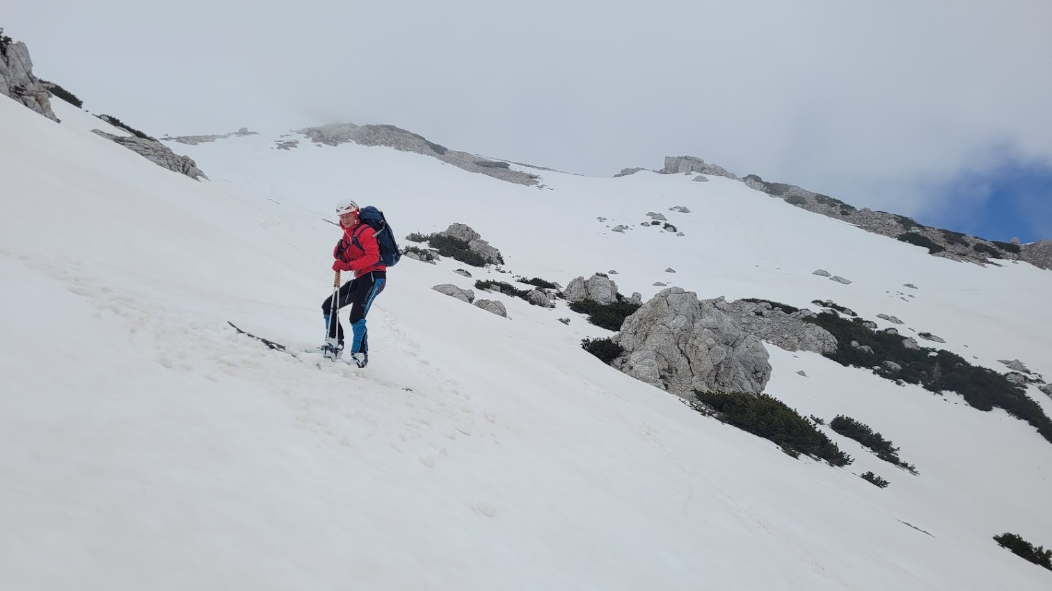 Današnje razmere: Na Grebencu je bila zelo gosta megla in nekaj centimetrov novega snega. Zato sva z vrha Mojstrovke smučala samo po GPS-u. Na srečo se je malo nad Vratci megla ravno toliko razkadila, da sva lahko videla prehod v Drevesnico. Smuka je bila tu odlična in še vedno se z enim prestopom prismuča do planinske poti. Nato sva se vzplela nazaj na Vršič in nato potegnila še na Nad Šitom glavo. Vendar je bil tu sneg za smuko že kar preveč gnil. Prehod iz dolinice pod NŠG, pa bo tudi zelo v kratkem skopnel.