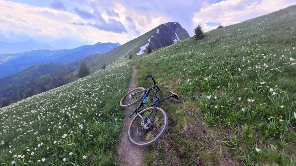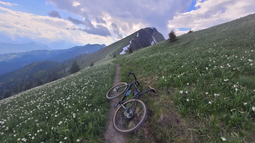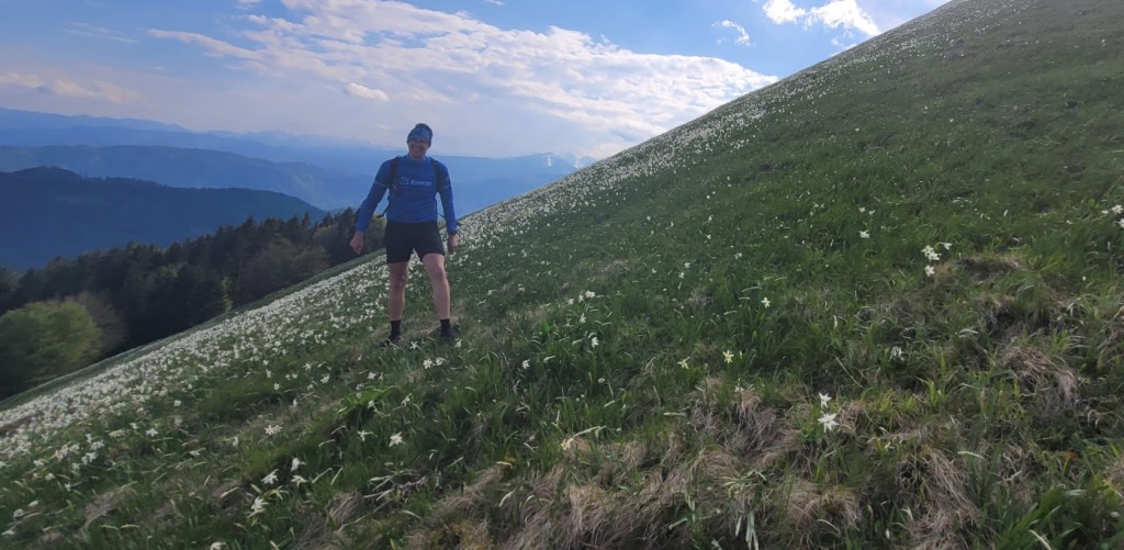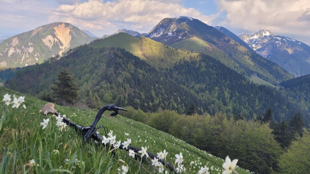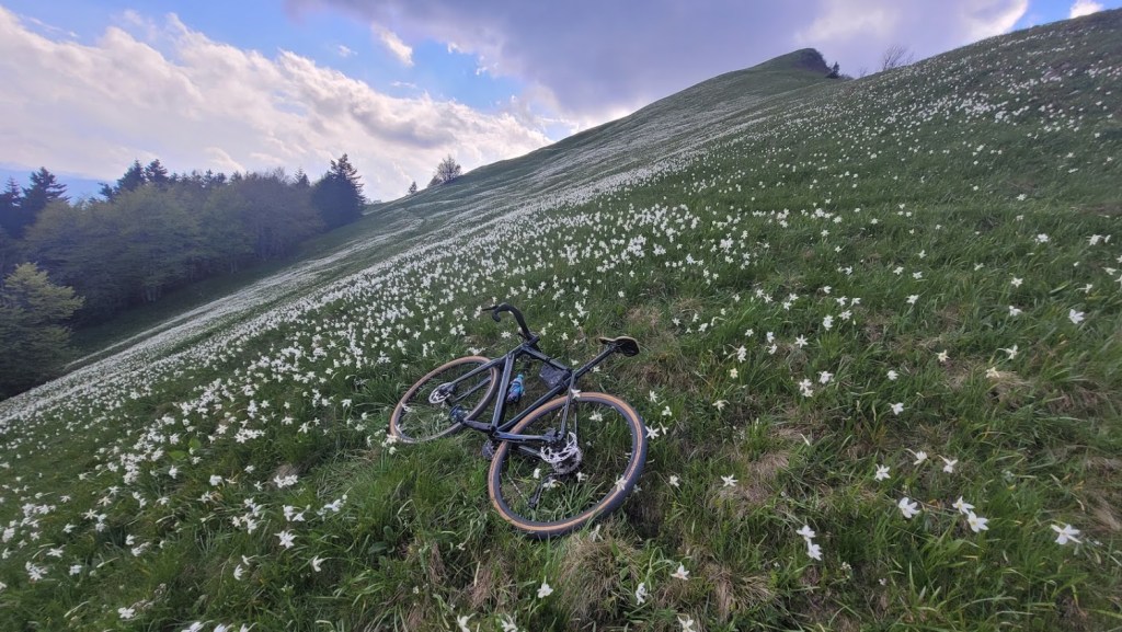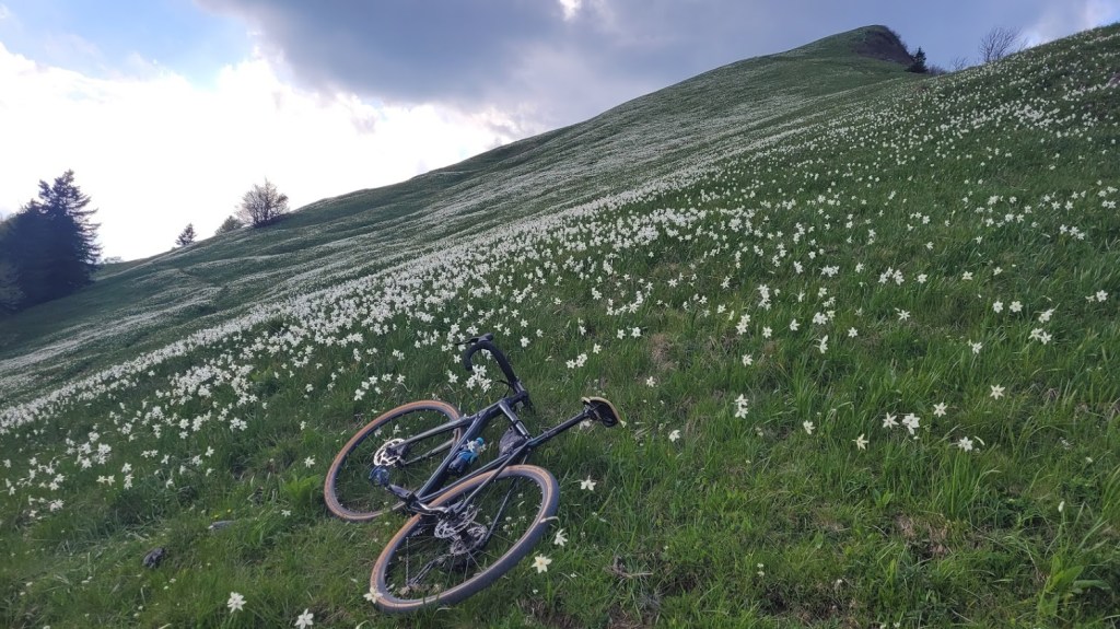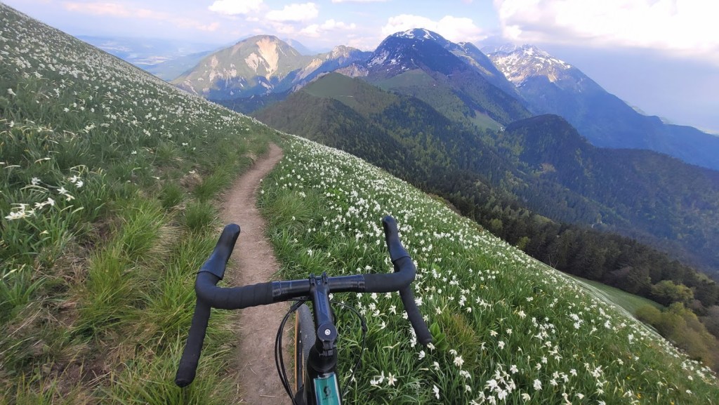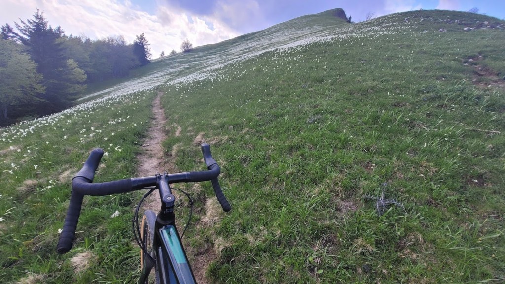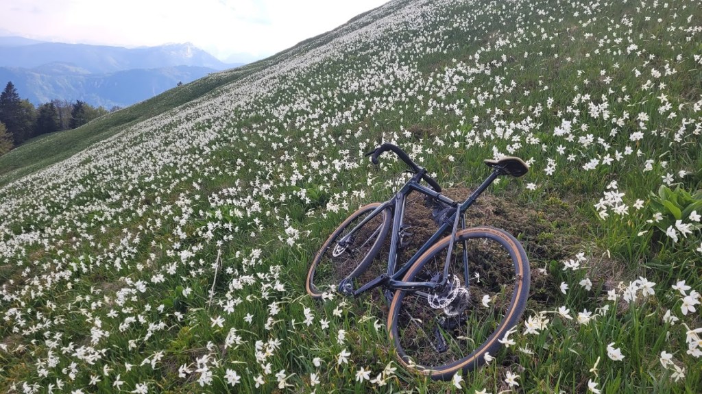 Letos zaradi izjemno hladne zime narcise na Golici cvetijo kar tri tedne pozneje kot običajno. Zaradi velikega navala obiskovalcev v času narcis pa so letos zaprli cesti do Planine pod Golico in Javorniških Rovtov. Zato se je med vikendi še najbolj prikladno do narcis zapeljati s kolesom. In točno to sem danes storil. Parkiral sem na Slovenskem Javorniku. Potem pa sem se po cesti skozi Javorniški Rovt povzpel do Doma Pristava. Do sem je cesta asfaltna. Naprej pa je dober makadam; prevozen tudi za osebna vozila. Meni je bila vožnja po tem makadamu lažja, kot prej po asfaltu do Javorniških Rovtov, saj je klanec precej manj strm. To cesto sem sicer pozimi dodobra spoznal, saj sem jo kar petkrat smučal. Prek Križovcev in Pustega rovta sem se povzpel na sedlo Suha (1439 m), kjer se cesta konča. Od tu sem nadaljeval v smeri Male Golice (1646 m). Do prvih narcis je 5 min hoje. Pot pa ni prevozna za kolo. Narcis na Golici tako ali tako nikoli ni, kot sem že pisal podrobneje v blogu: “Kje so narcise na Golici?”. Trenutno so narcise skorajda v polnem razcvetu, razen bolj proti vrhu, kjer so nekatere še v popkih. Torej bo višek cvetenja v prihodnjem tednu. Sestopil sem po isti poti do Suhe in Križovcev. Nato pa sem se spustil po cesti čez Savske jame v Planino pod Golico in naprej na Jesenice. Na ta način sem naredil lep popoldanski gravel krog.
