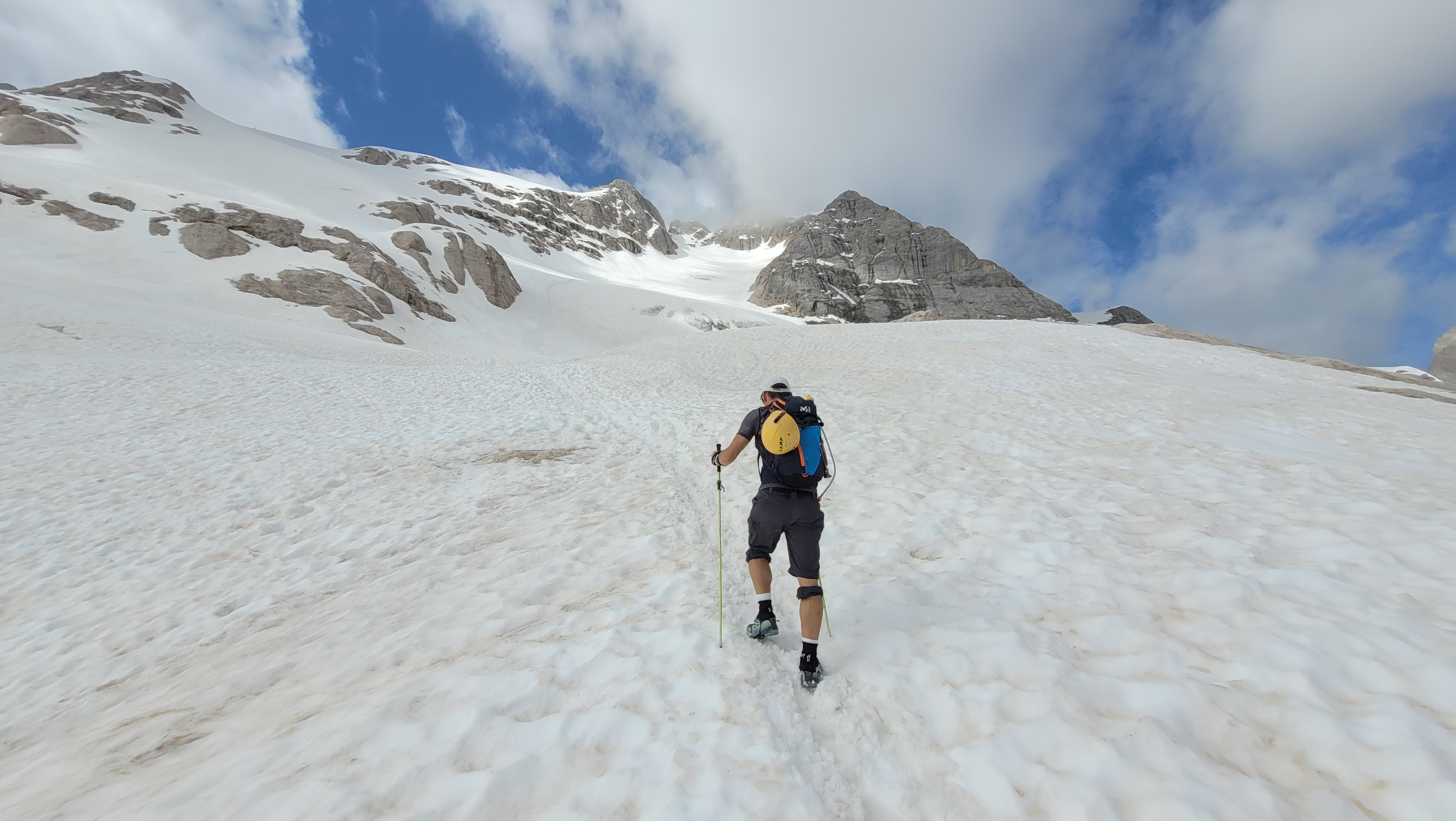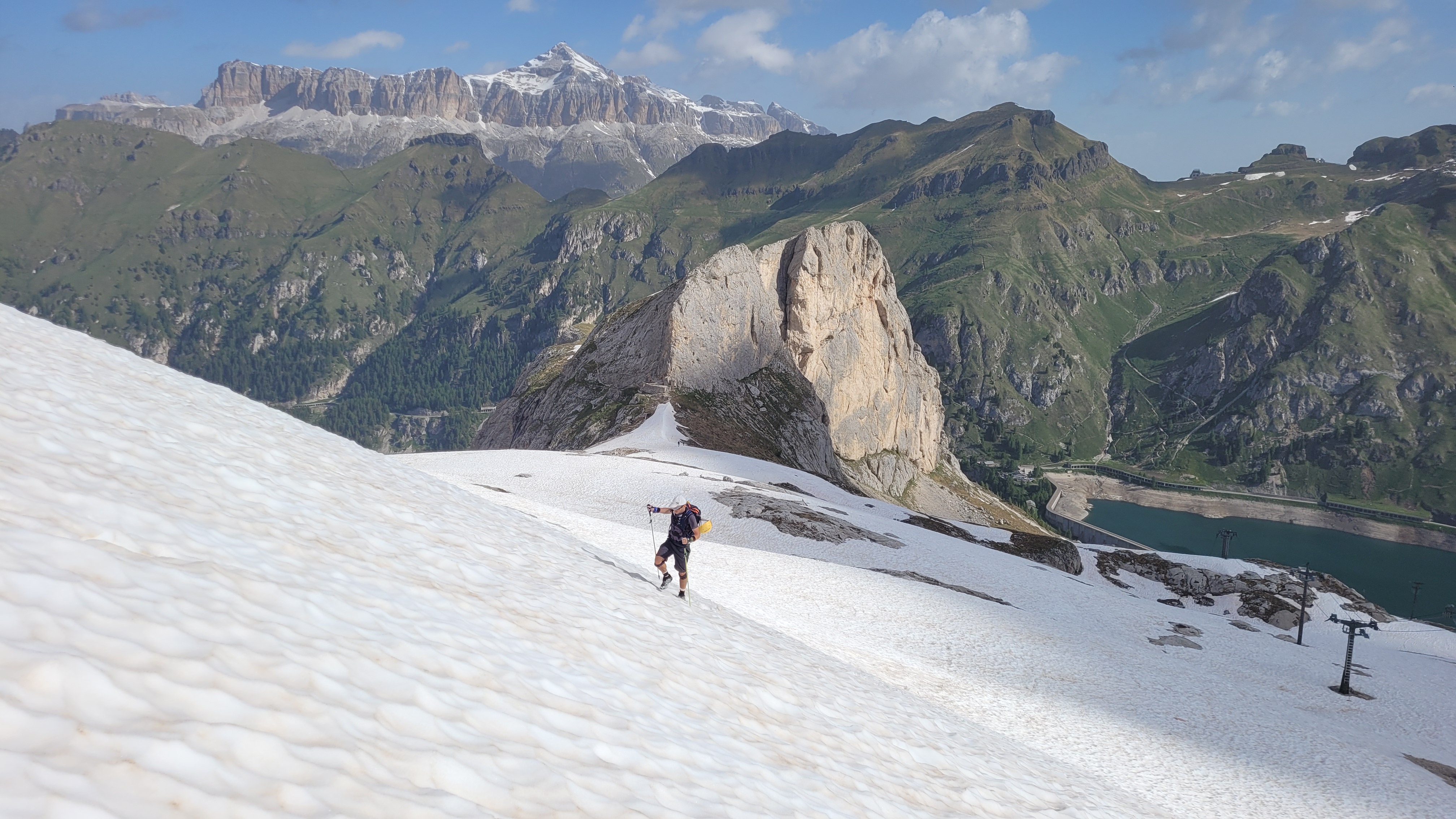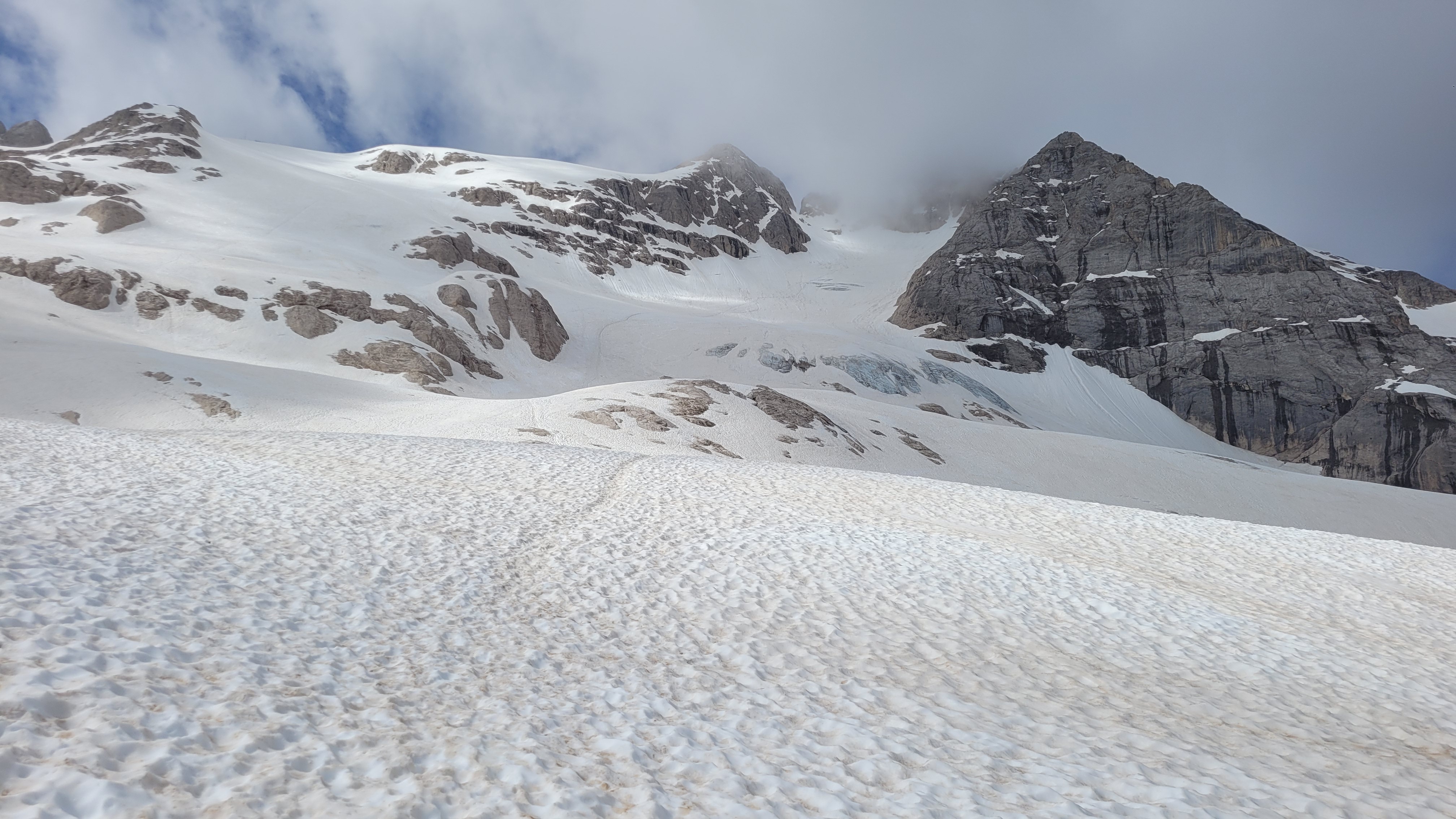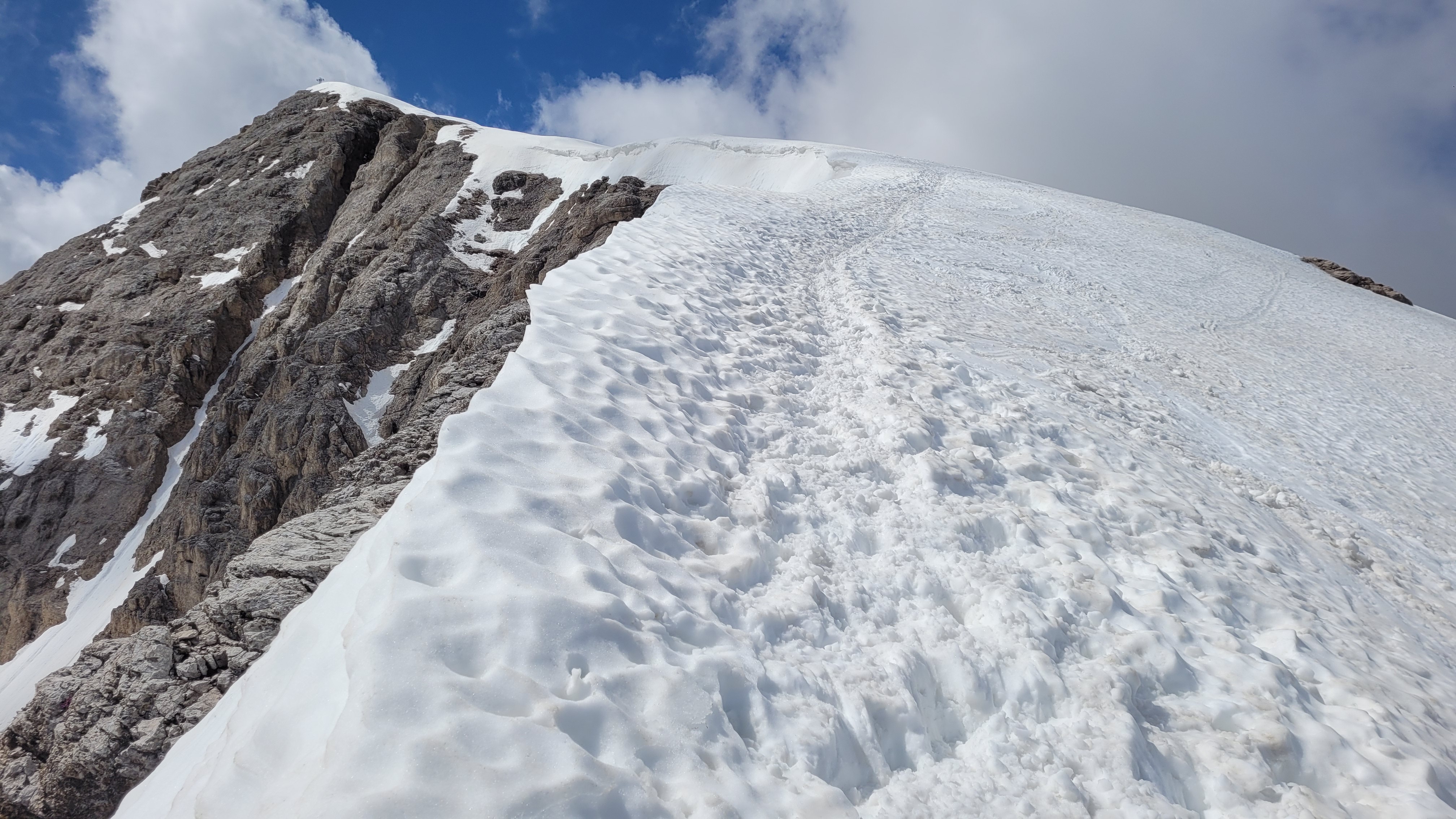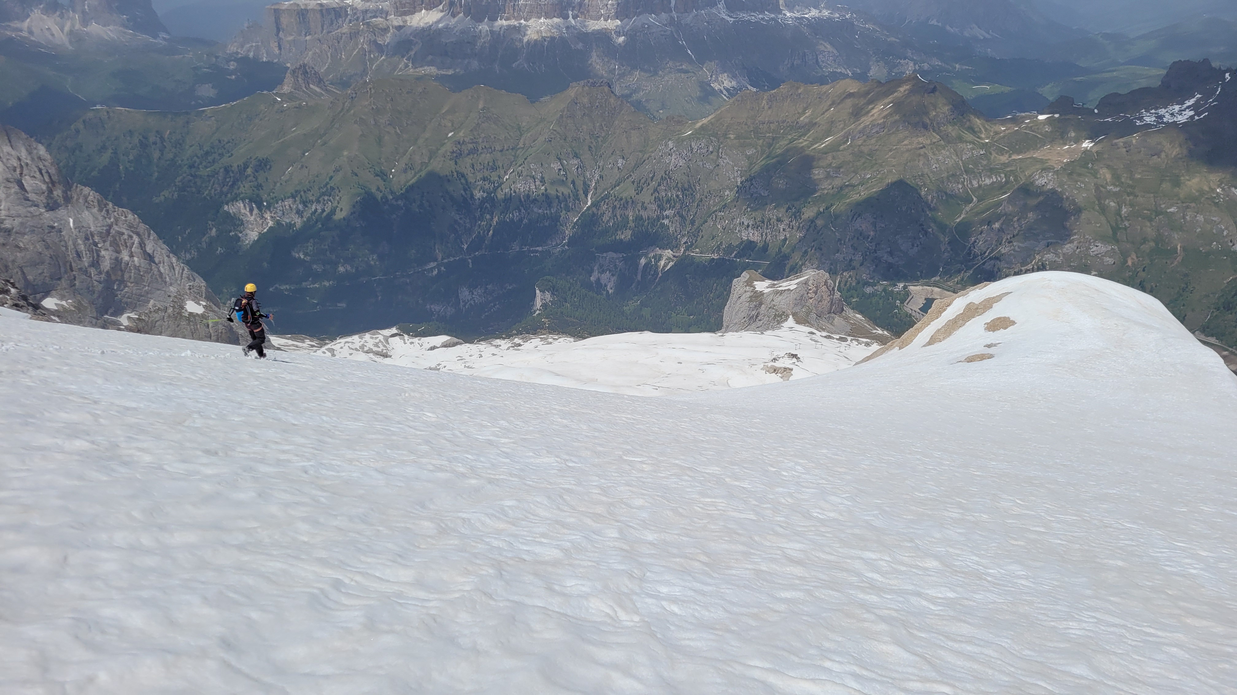 S turo sva začela na parkirišču nad jezerom Fedaia (2100 m). Do snega sva hodila 20 min. Nato sem jaz stopil na smuči, Žiga pa se je peš pobijal navkreber. Sledila sva trasi žičnice do koče Pian di Fiacconi (2626 m), ki jo je podrl snežni plaz. Nato sva hitro dosegla spodnji rob ledenika. Večino ledenika je še pod snegom. V osrednjem delu pa že grozijo razpoke. Zato sva se zaradi varnosti strogo držala špure. Sneg je bil dovolj mehak, da derez nisva potrebovala. Na SZ robu ledenika (3170 m), pred vstopom v ferato, sva pustila smuči in se opremila s samovarovalnimi kompleti. Sama ferata je lahka (težavnost B) in odlično zavarovana. Poteka po žlebu čez steno v katerem je bil mestoma led. Zato so dereze in cepin bili zelo na mestu. Od vrha ferate je nato do glavnega vrha Marmolade – Punta Penia (3343 m) – še 250 višincev hoje po položnem zasneženem slemenu. Na vrhu gore se nisva zadržala prav dolgo, saj so nenadoma nastali črni nevihtni oblaki. Po isti poti sva sestopila do smuči. Jaz sem nato odsmučal 200 višincev navzdol po ledeniku. Žiga pa je isto pot odsmučal na čevljih. Sneg je bil gnil. Nato sva prek ledenika prečila proti vzhodu in se vzpela 350 višincev na Punta Rocco – z višino 3309 m drug najvišji vrh v masivu Marmolade. Nanj trenutno vozi gondola trume turistov. Ko so me videli s smučmi, sem bil za njih kar neke vrste atrakcija. Končno je sledil smučarski spust v dolino. Sneg je mehak, vendar ni zaviral. Uživancija se konča 100 višinskih metrov nad parkirišče, kar je pomenilo slabih 10 min peš do avta. Skupno sem danes smučal 1400 višincev. #107. Vrhunski skok (smučanje) v poletje je to bil.