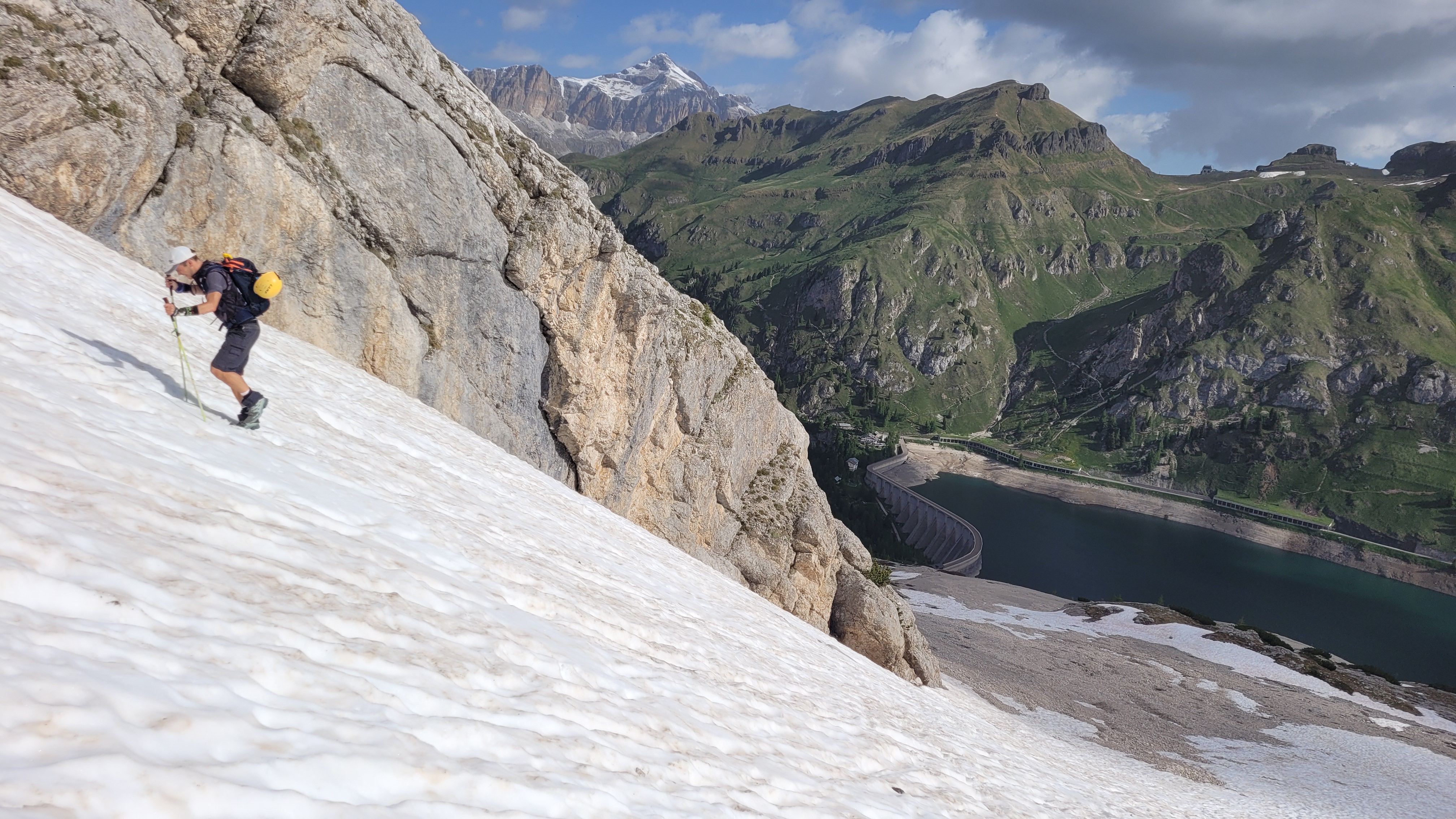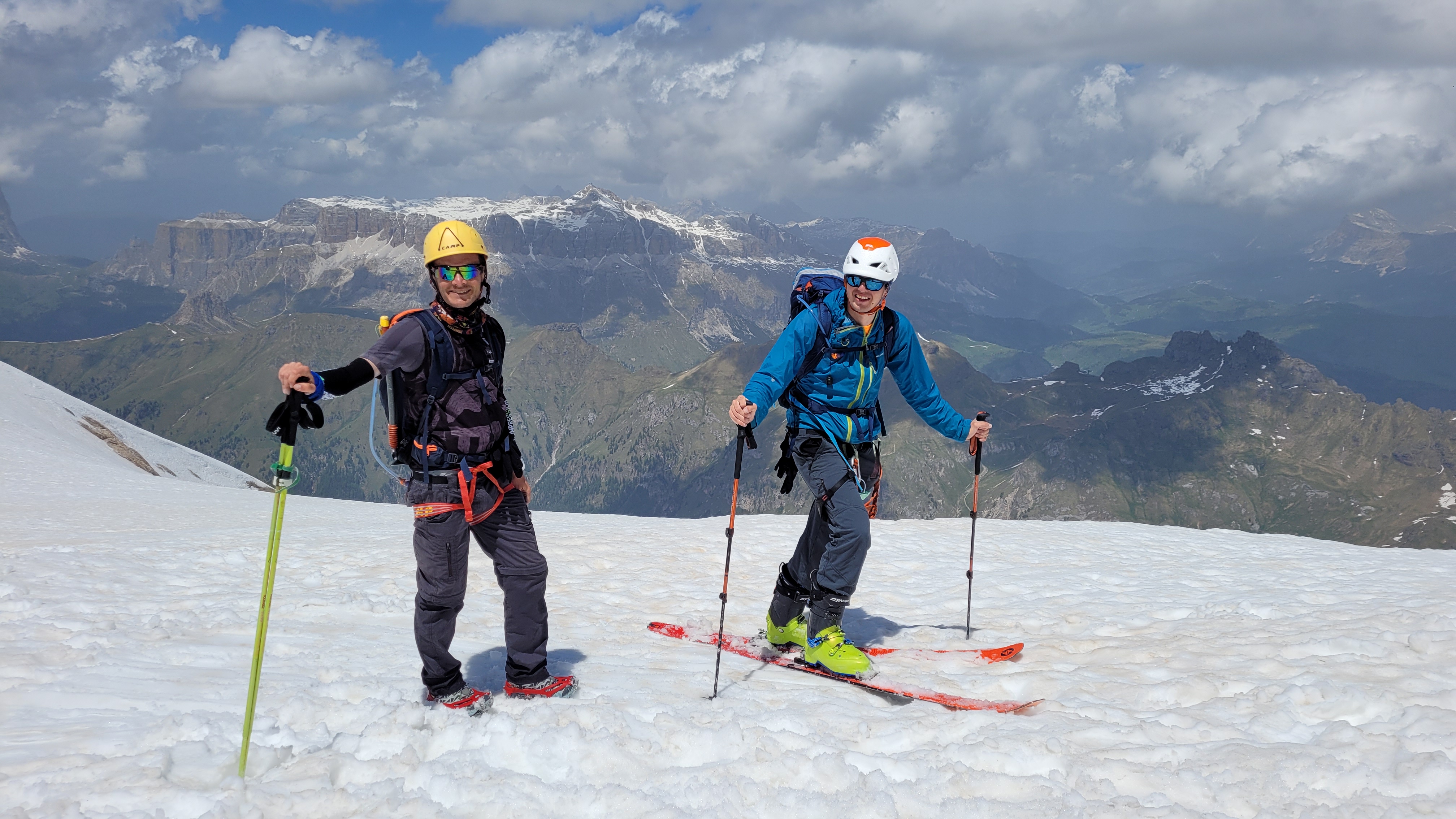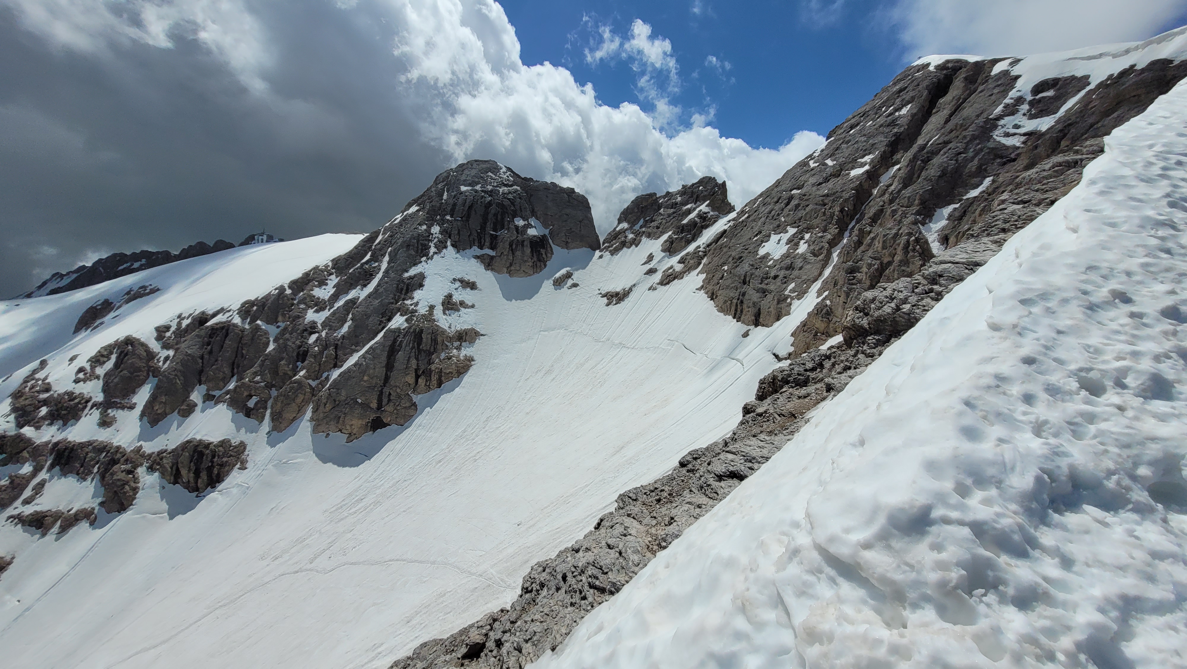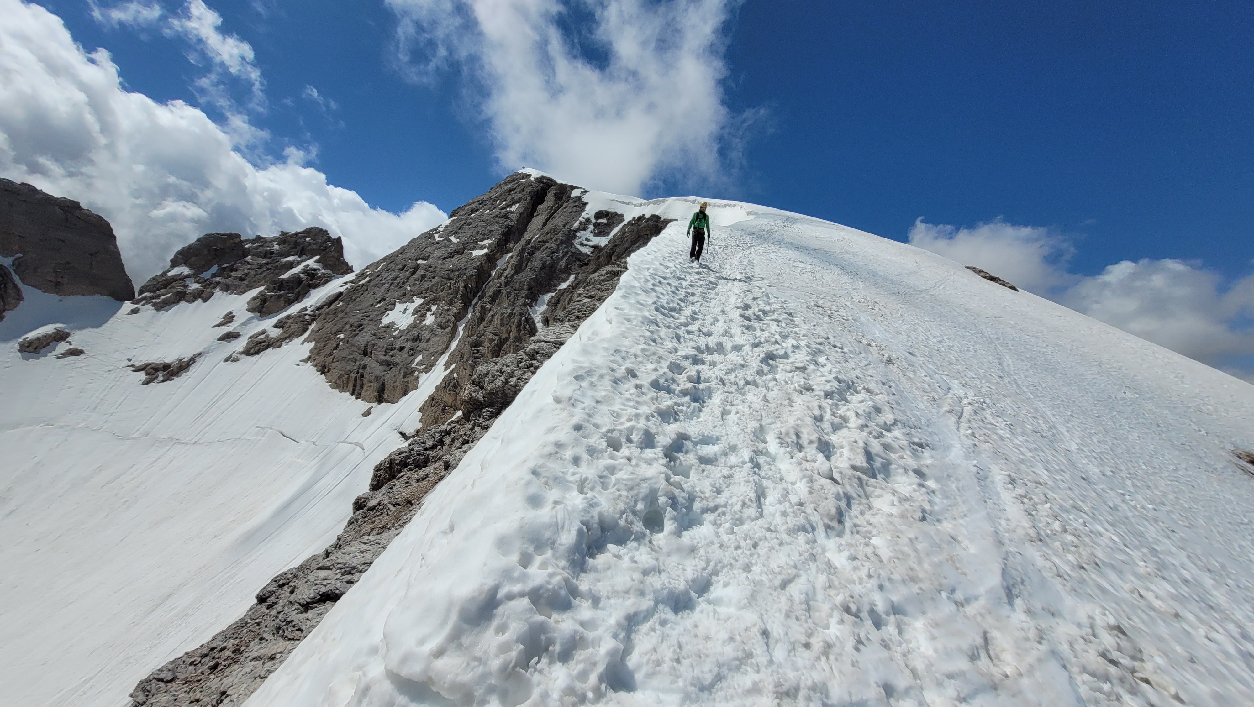 S turo sva začela na parkirišču nad jezerom Fedaia (2100 m). Do snega sva hodila 20 min. Nato sem jaz stopil na smuči, Žiga pa se je peš pobijal navkreber. Sledila sva trasi žičnice do koče Pian di Fiacconi (2626 m), ki jo je podrl snežni plaz. Nato sva hitro dosegla spodnji rob ledenika. Večino ledenika je še pod snegom. V osrednjem delu pa že grozijo razpoke. Zato sva se zaradi varnosti strogo držala špure. Sneg je bil dovolj mehak, da derez nisva potrebovala. Na SZ robu ledenika (3170 m), pred vstopom v ferato, sva pustila smuči in se opremila s samovarovalnimi kompleti. Sama ferata je lahka (težavnost B) in odlično zavarovana. Poteka po žlebu čez steno v katerem je bil mestoma led. Zato so dereze in cepin bili zelo na mestu. Od vrha ferate je nato do glavnega vrha Marmolade – Punta Penia (3343 m) – še 250 višincev hoje po položnem zasneženem slemenu. Na vrhu gore se nisva zadržala prav dolgo, saj so nenadoma nastali črni nevihtni oblaki. Po isti poti sva sestopila do smuči. Jaz sem nato odsmučal 200 višincev navzdol po ledeniku. Žiga pa je isto pot odsmučal na čevljih. Sneg je bil gnil. Nato sva prek ledenika prečila proti vzhodu in se vzpela 350 višincev na Punta Rocco – z višino 3309 m drug najvišji vrh v masivu Marmolade. Nanj trenutno vozi gondola trume turistov. Ko so me videli s smučmi, sem bil za njih kar neke vrste atrakcija. Končno je sledil smučarski spust v dolino. Sneg je mehak, vendar ni zaviral. Uživancija se konča 100 višinskih metrov nad parkirišče, kar je pomenilo slabih 10 min peš do avta. Skupno sem danes smučal 1400 višincev. #107. Vrhunski skok (smučanje) v poletje je to bil.