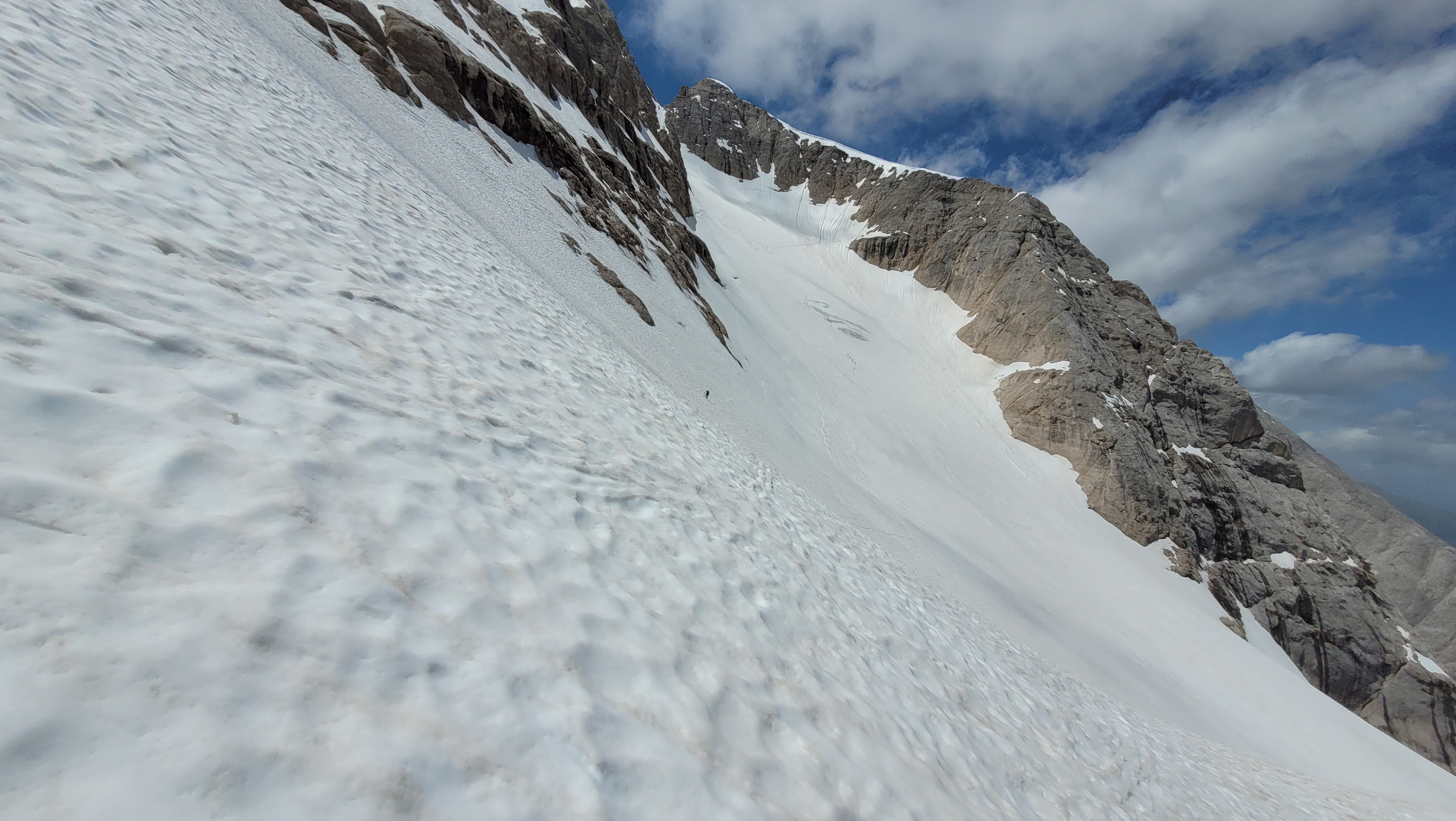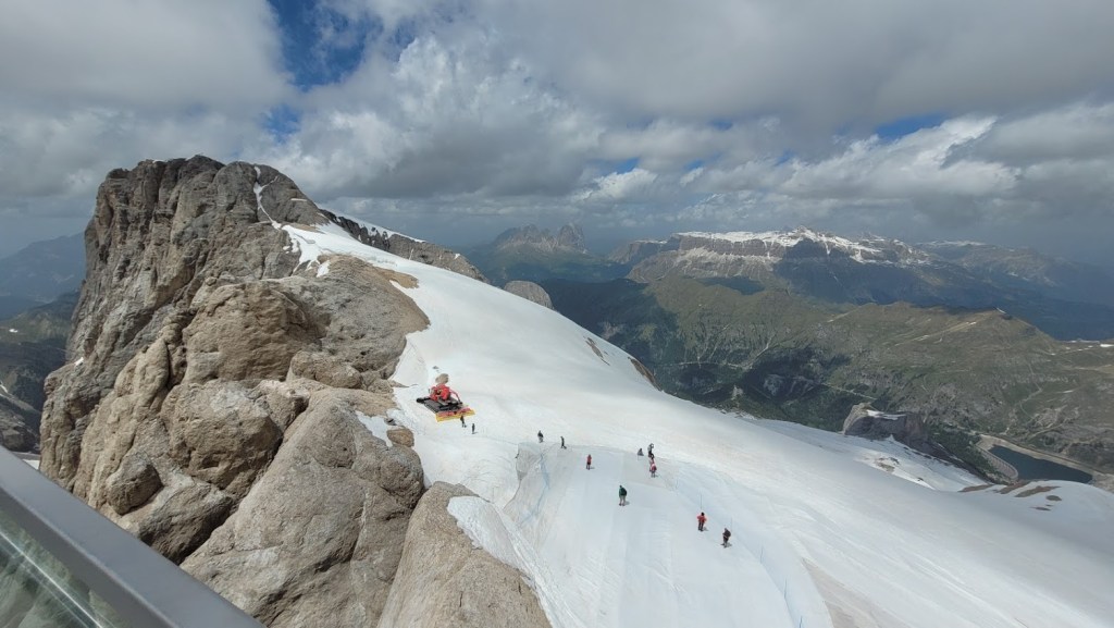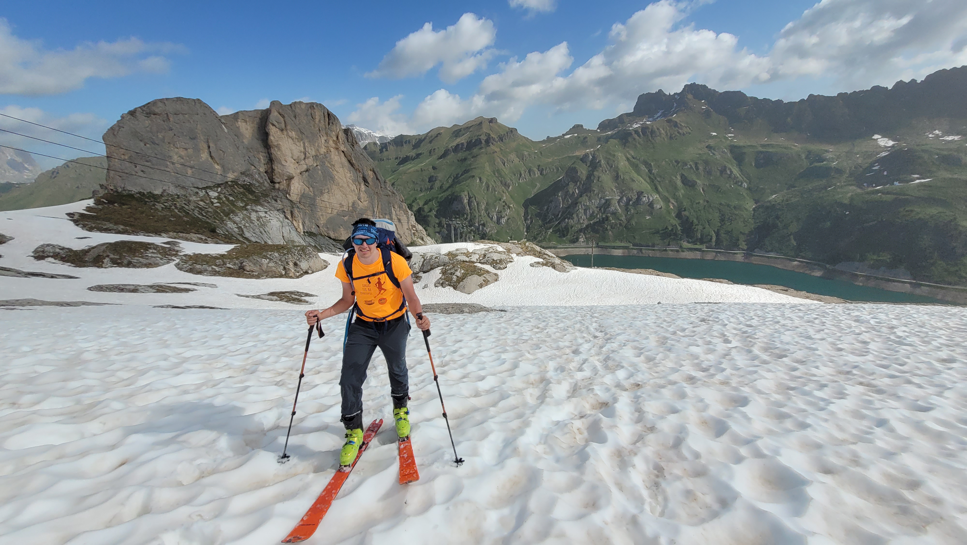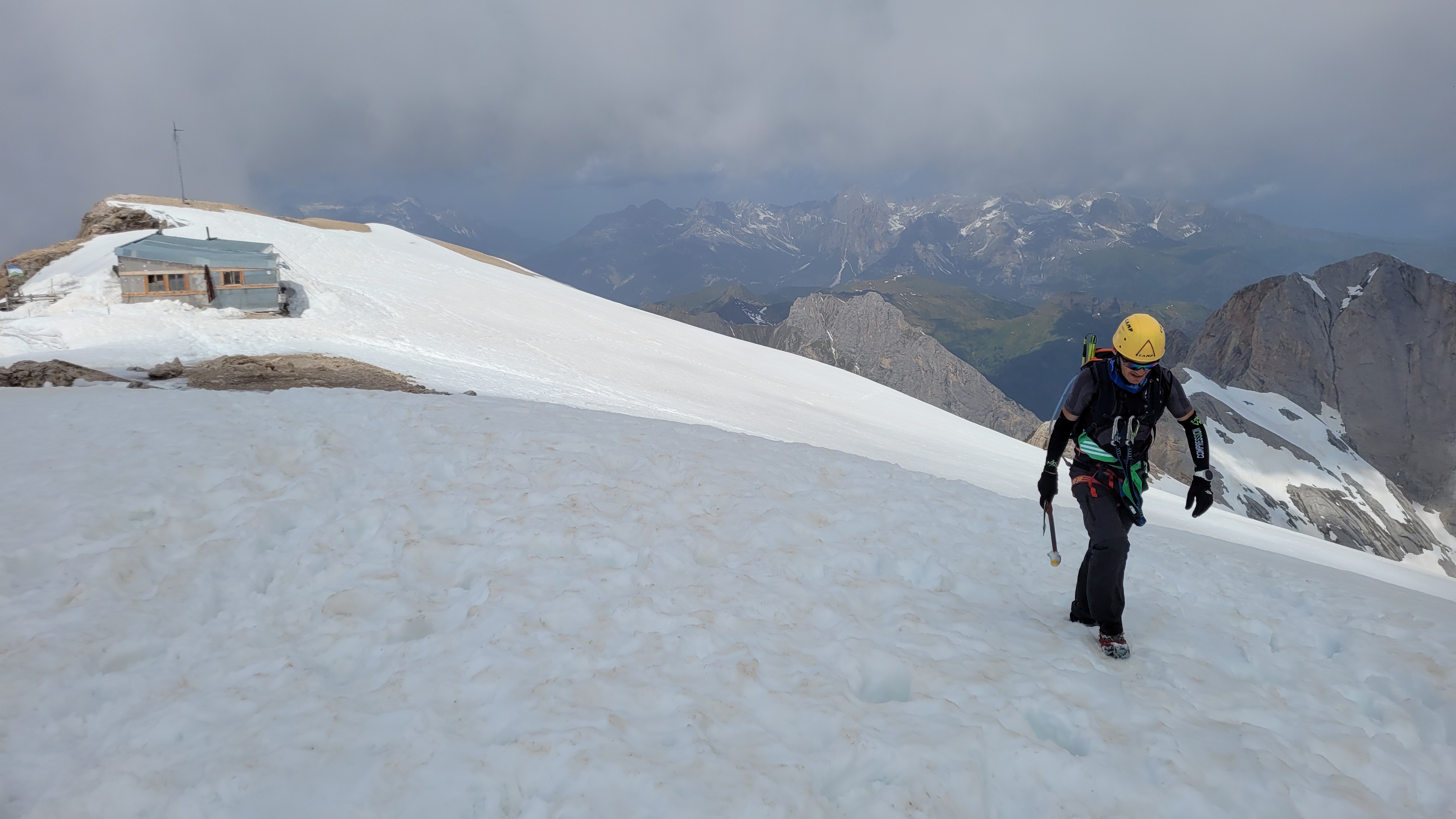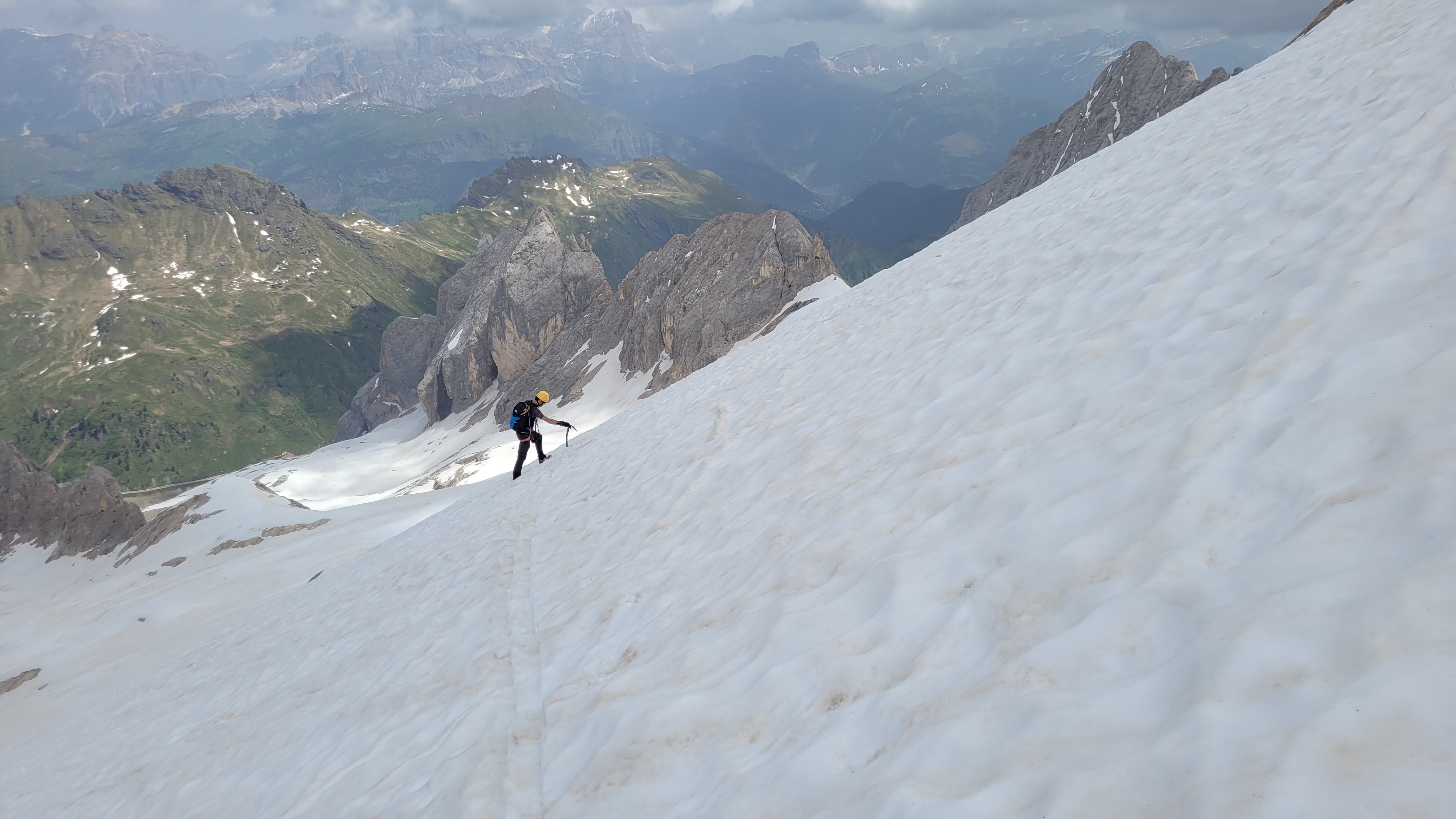 S turo sva začela na parkirišču nad jezerom Fedaia (2100 m). Do snega sva hodila 20 min. Nato sem jaz stopil na smuči, Žiga pa se je peš pobijal navkreber. Sledila sva trasi žičnice do koče Pian di Fiacconi (2626 m), ki jo je podrl snežni plaz. Nato sva hitro dosegla spodnji rob ledenika. Večino ledenika je še pod snegom. V osrednjem delu pa že grozijo razpoke. Zato sva se zaradi varnosti strogo držala špure. Sneg je bil dovolj mehak, da derez nisva potrebovala. Na SZ robu ledenika (3170 m), pred vstopom v ferato, sva pustila smuči in se opremila s samovarovalnimi kompleti. Sama ferata je lahka (težavnost B) in odlično zavarovana. Poteka po žlebu čez steno v katerem je bil mestoma led. Zato so dereze in cepin bili zelo na mestu. Od vrha ferate je nato do glavnega vrha Marmolade – Punta Penia (3343 m) – še 250 višincev hoje po položnem zasneženem slemenu. Na vrhu gore se nisva zadržala prav dolgo, saj so nenadoma nastali črni nevihtni oblaki. Po isti poti sva sestopila do smuči. Jaz sem nato odsmučal 200 višincev navzdol po ledeniku. Žiga pa je isto pot odsmučal na čevljih. Sneg je bil gnil. Nato sva prek ledenika prečila proti vzhodu in se vzpela 350 višincev na Punta Rocco – z višino 3309 m drug najvišji vrh v masivu Marmolade. Nanj trenutno vozi gondola trume turistov. Ko so me videli s smučmi, sem bil za njih kar neke vrste atrakcija. Končno je sledil smučarski spust v dolino. Sneg je mehak, vendar ni zaviral. Uživancija se konča 100 višinskih metrov nad parkirišče, kar je pomenilo slabih 10 min peš do avta. Skupno sem danes smučal 1400 višincev. #107. Vrhunski skok (smučanje) v poletje je to bil.
