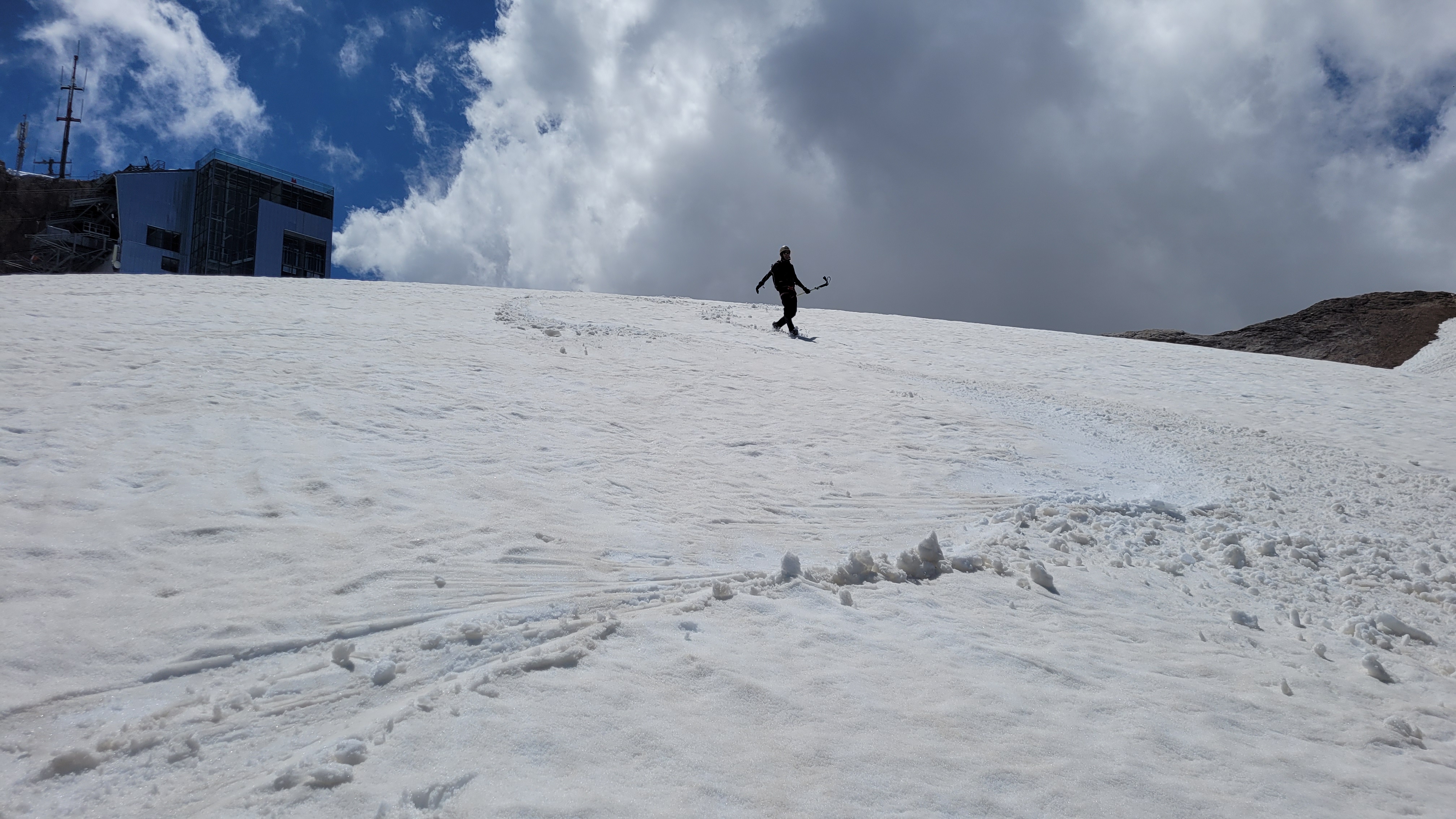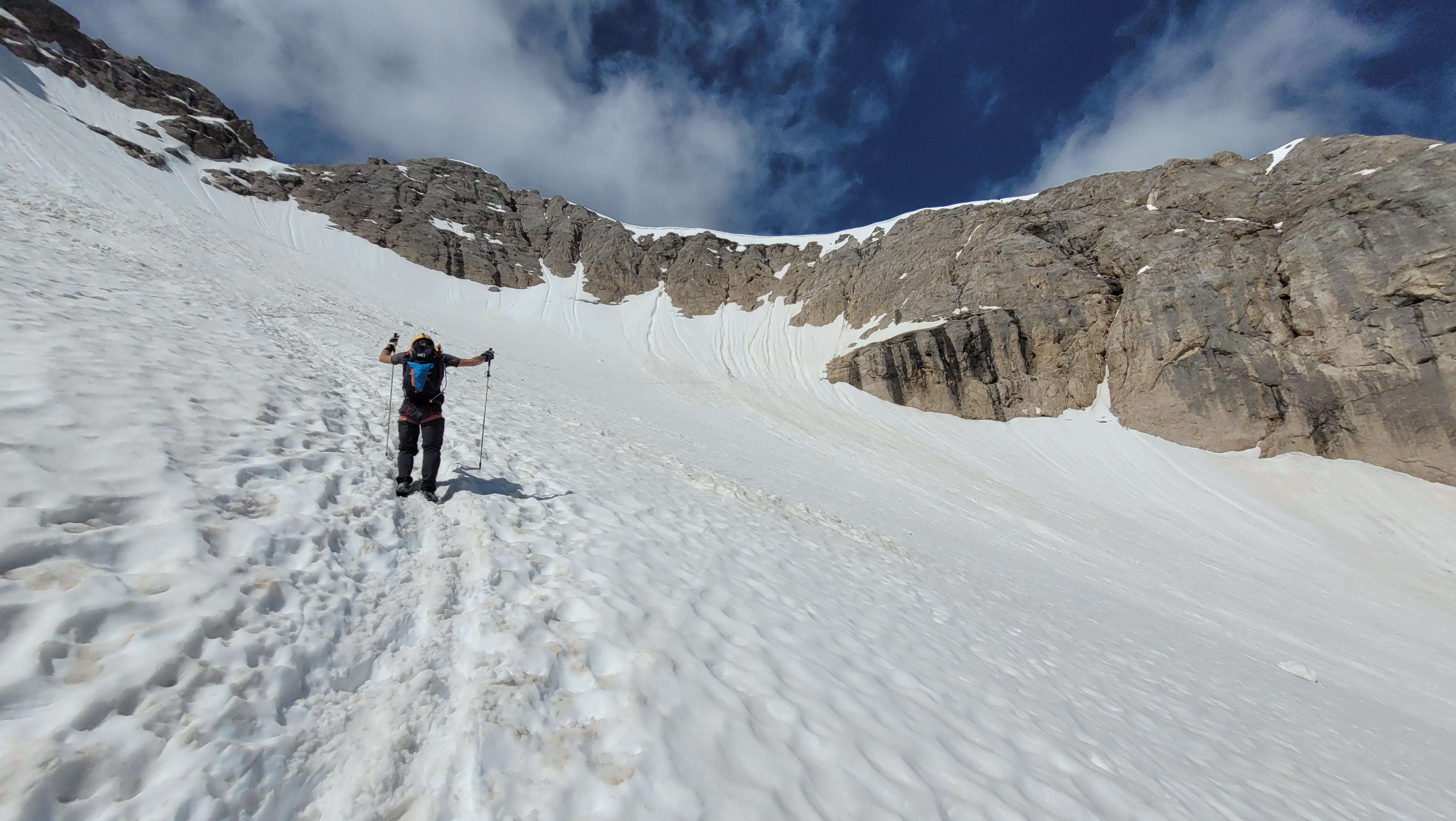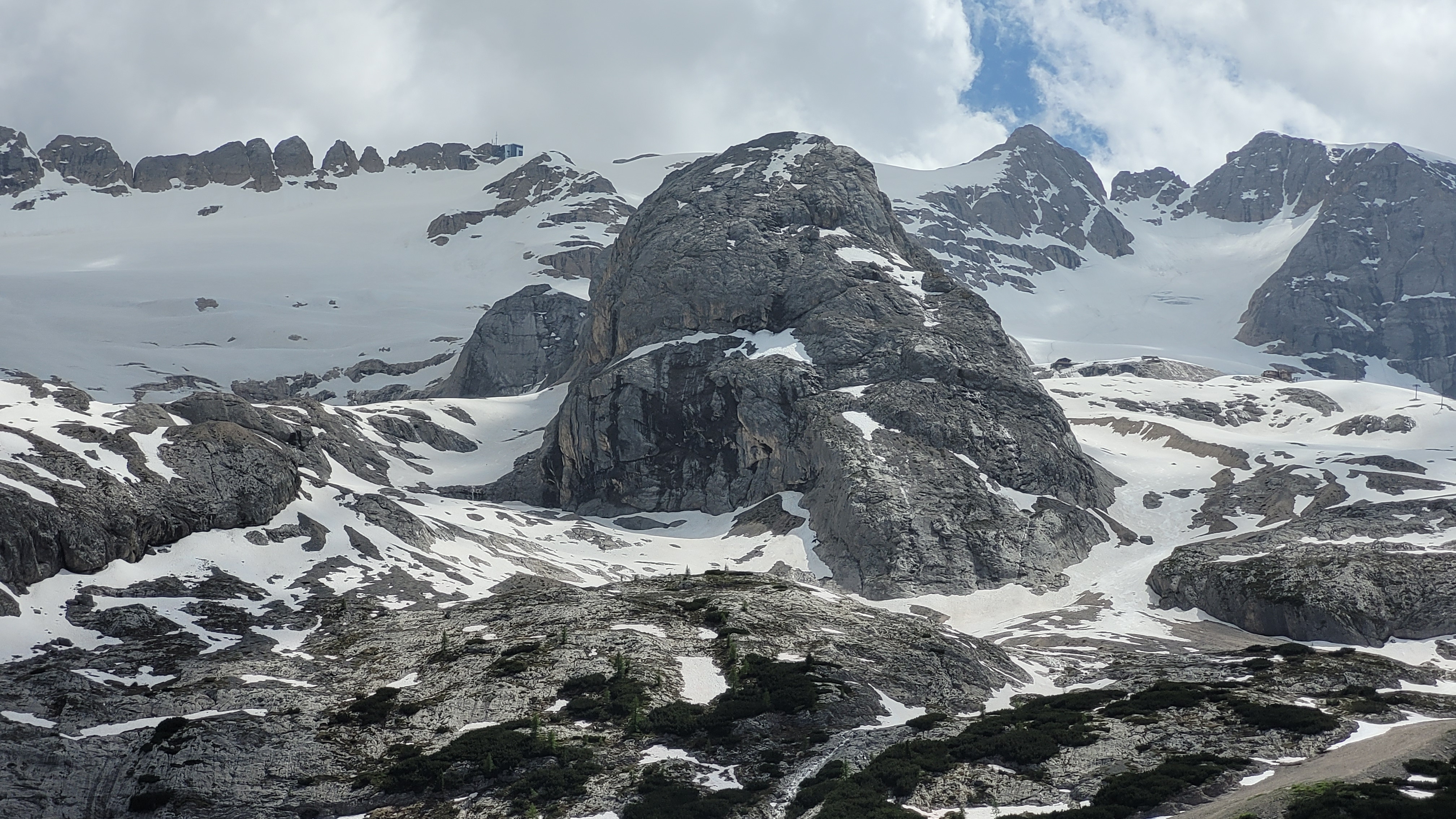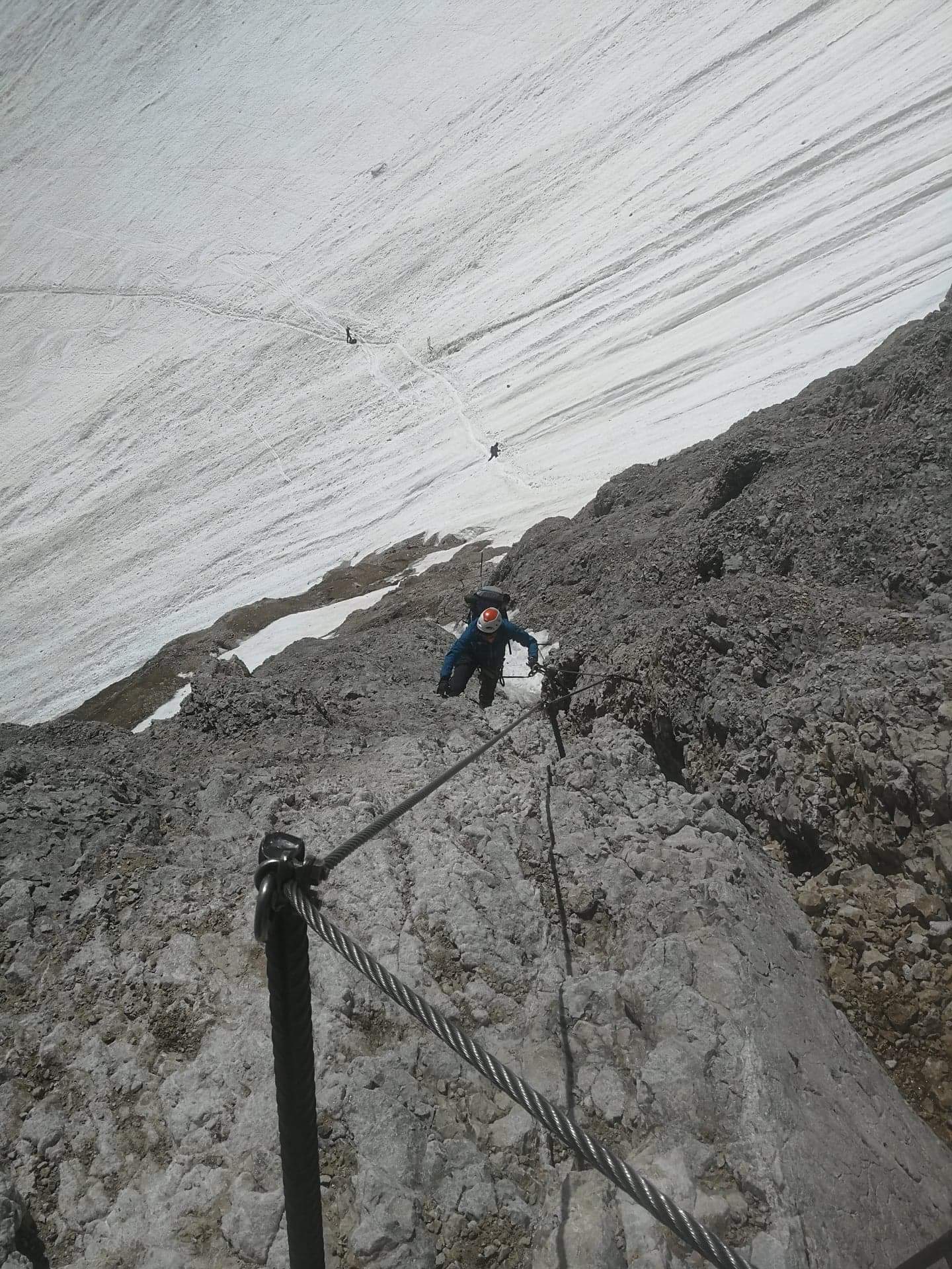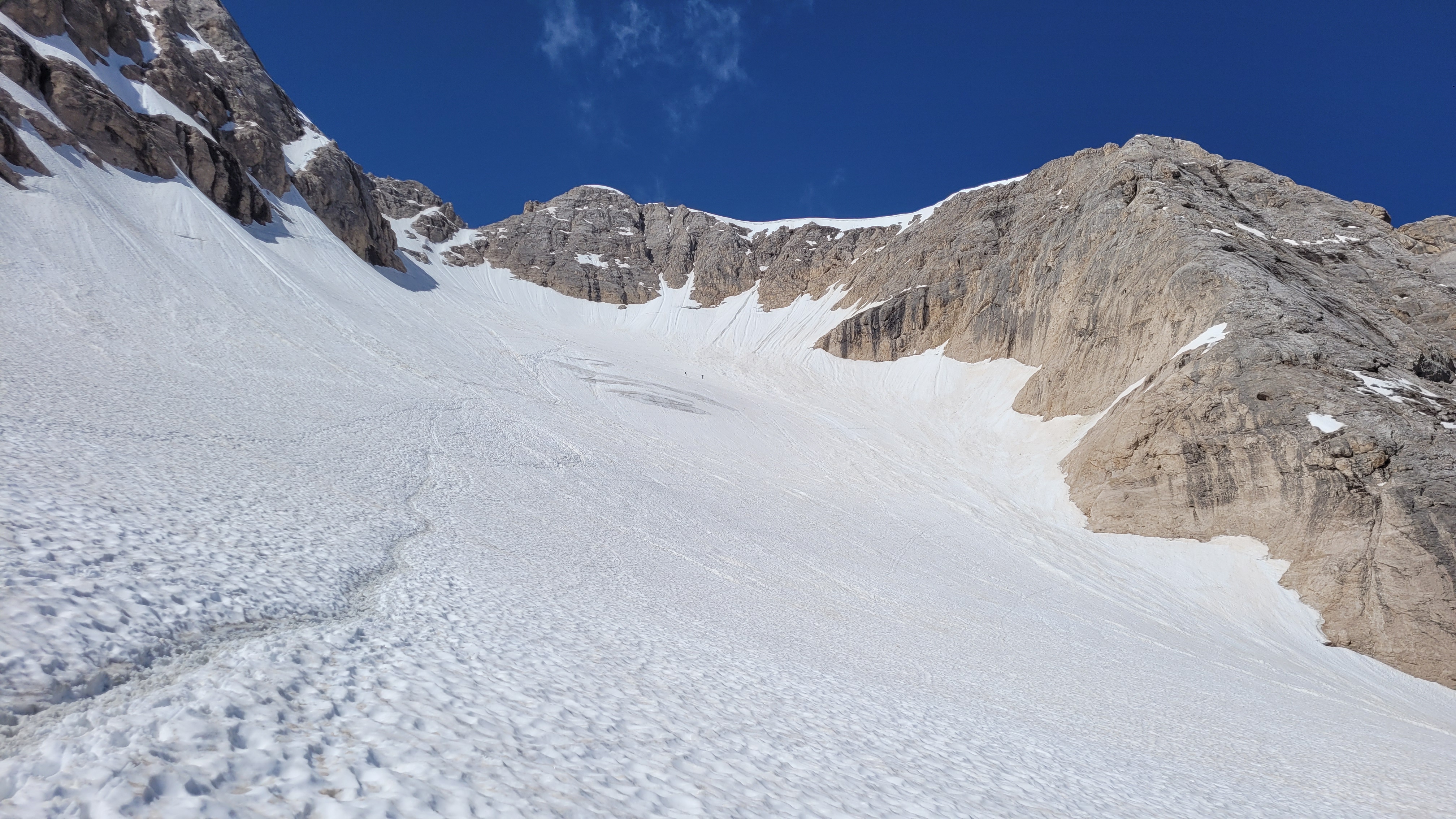 S turo sva začela na parkirišču nad jezerom Fedaia (2100 m). Do snega sva hodila 20 min. Nato sem jaz stopil na smuči, Žiga pa se je peš pobijal navkreber. Sledila sva trasi žičnice do koče Pian di Fiacconi (2626 m), ki jo je podrl snežni plaz. Nato sva hitro dosegla spodnji rob ledenika. Večino ledenika je še pod snegom. V osrednjem delu pa že grozijo razpoke. Zato sva se zaradi varnosti strogo držala špure. Sneg je bil dovolj mehak, da derez nisva potrebovala. Na SZ robu ledenika (3170 m), pred vstopom v ferato, sva pustila smuči in se opremila s samovarovalnimi kompleti. Sama ferata je lahka (težavnost B) in odlično zavarovana. Poteka po žlebu čez steno v katerem je bil mestoma led. Zato so dereze in cepin bili zelo na mestu. Od vrha ferate je nato do glavnega vrha Marmolade – Punta Penia (3343 m) – še 250 višincev hoje po položnem zasneženem slemenu. Na vrhu gore se nisva zadržala prav dolgo, saj so nenadoma nastali črni nevihtni oblaki. Po isti poti sva sestopila do smuči. Jaz sem nato odsmučal 200 višincev navzdol po ledeniku. Žiga pa je isto pot odsmučal na čevljih. Sneg je bil gnil. Nato sva prek ledenika prečila proti vzhodu in se vzpela 350 višincev na Punta Rocco – z višino 3309 m drug najvišji vrh v masivu Marmolade. Nanj trenutno vozi gondola trume turistov. Ko so me videli s smučmi, sem bil za njih kar neke vrste atrakcija. Končno je sledil smučarski spust v dolino. Sneg je mehak, vendar ni zaviral. Uživancija se konča 100 višinskih metrov nad parkirišče, kar je pomenilo slabih 10 min peš do avta. Skupno sem danes smučal 1400 višincev. #107. Vrhunski skok (smučanje) v poletje je to bil.