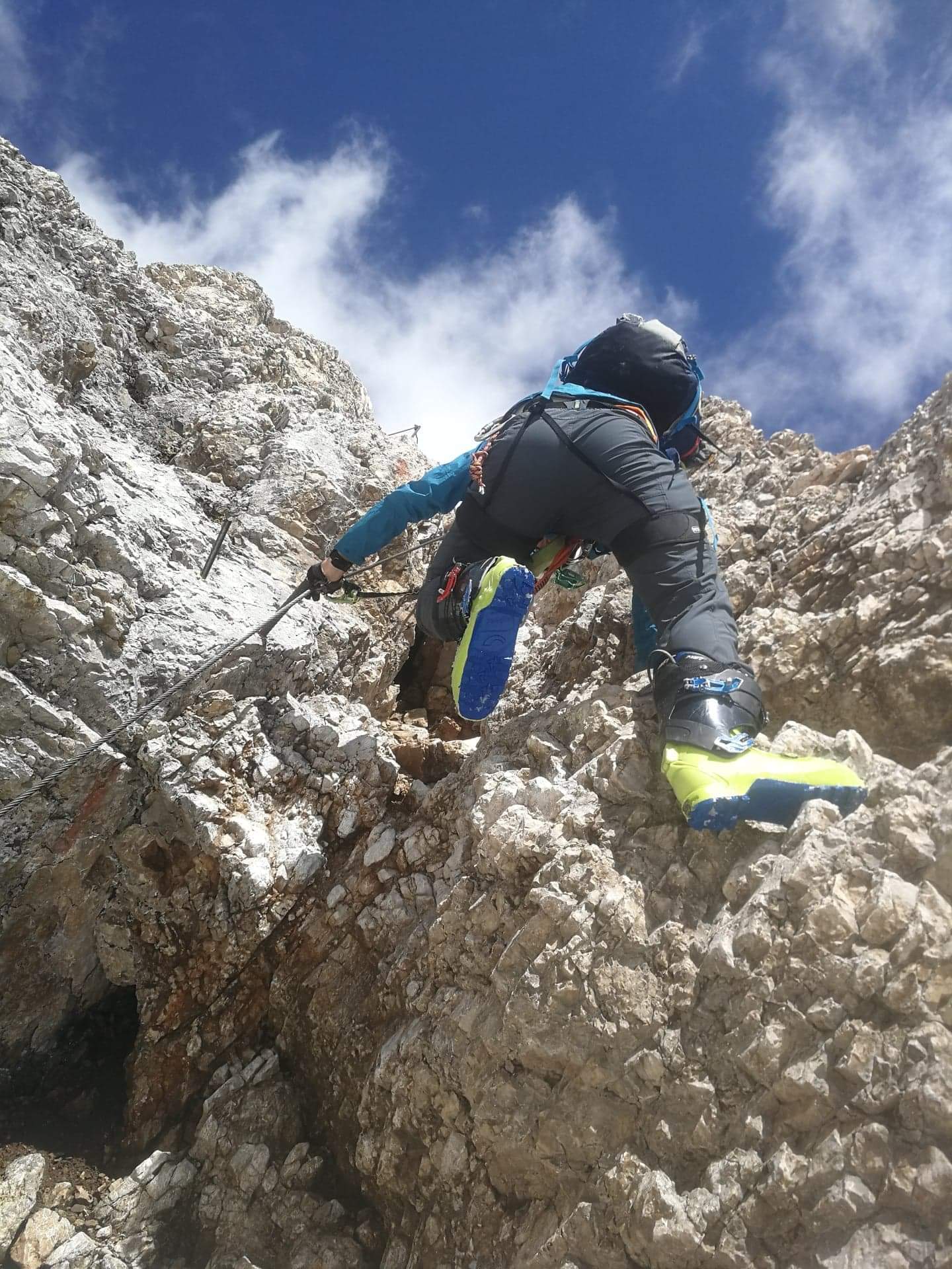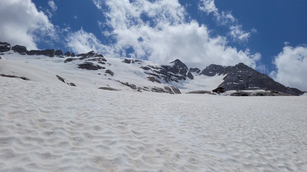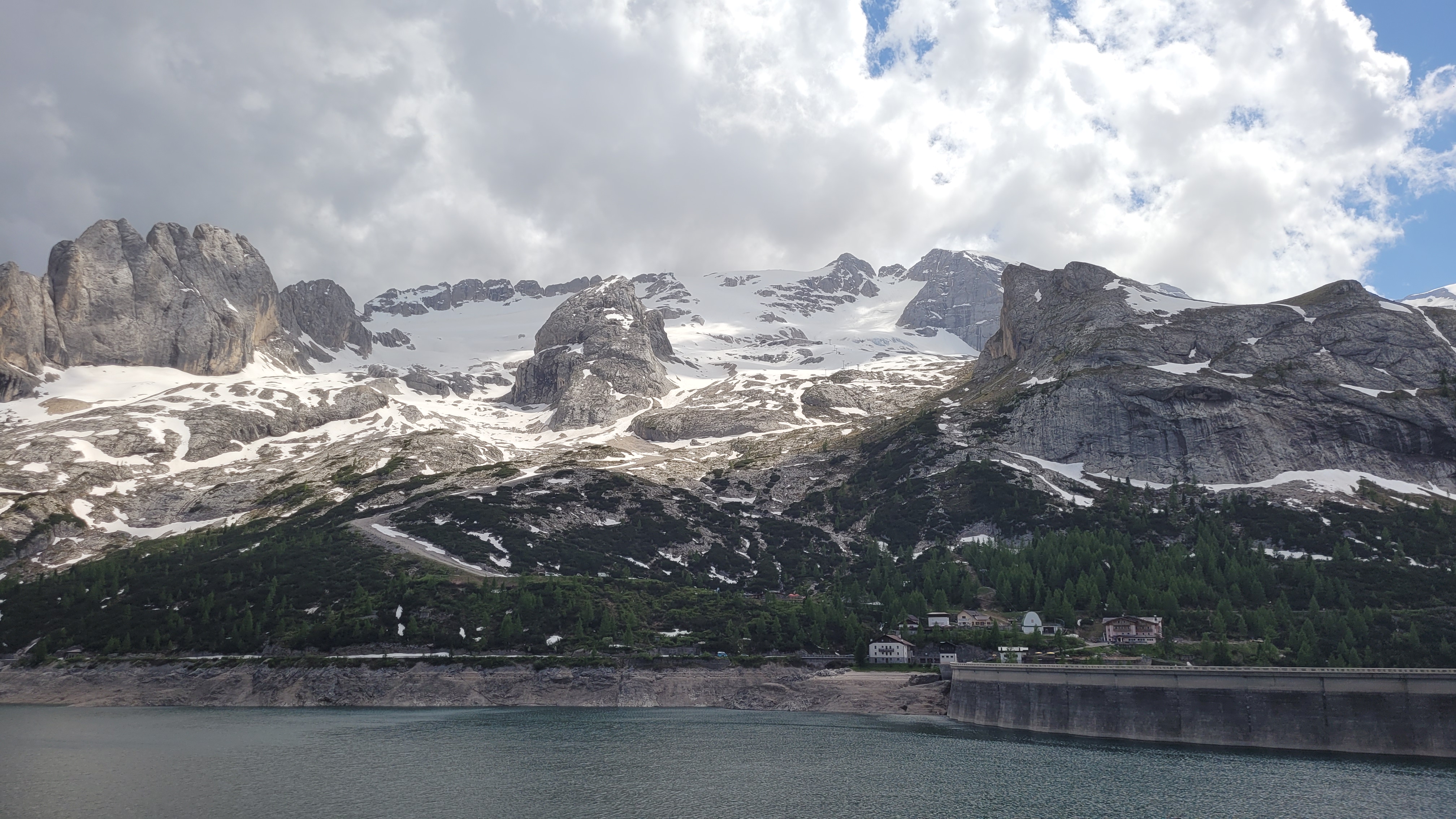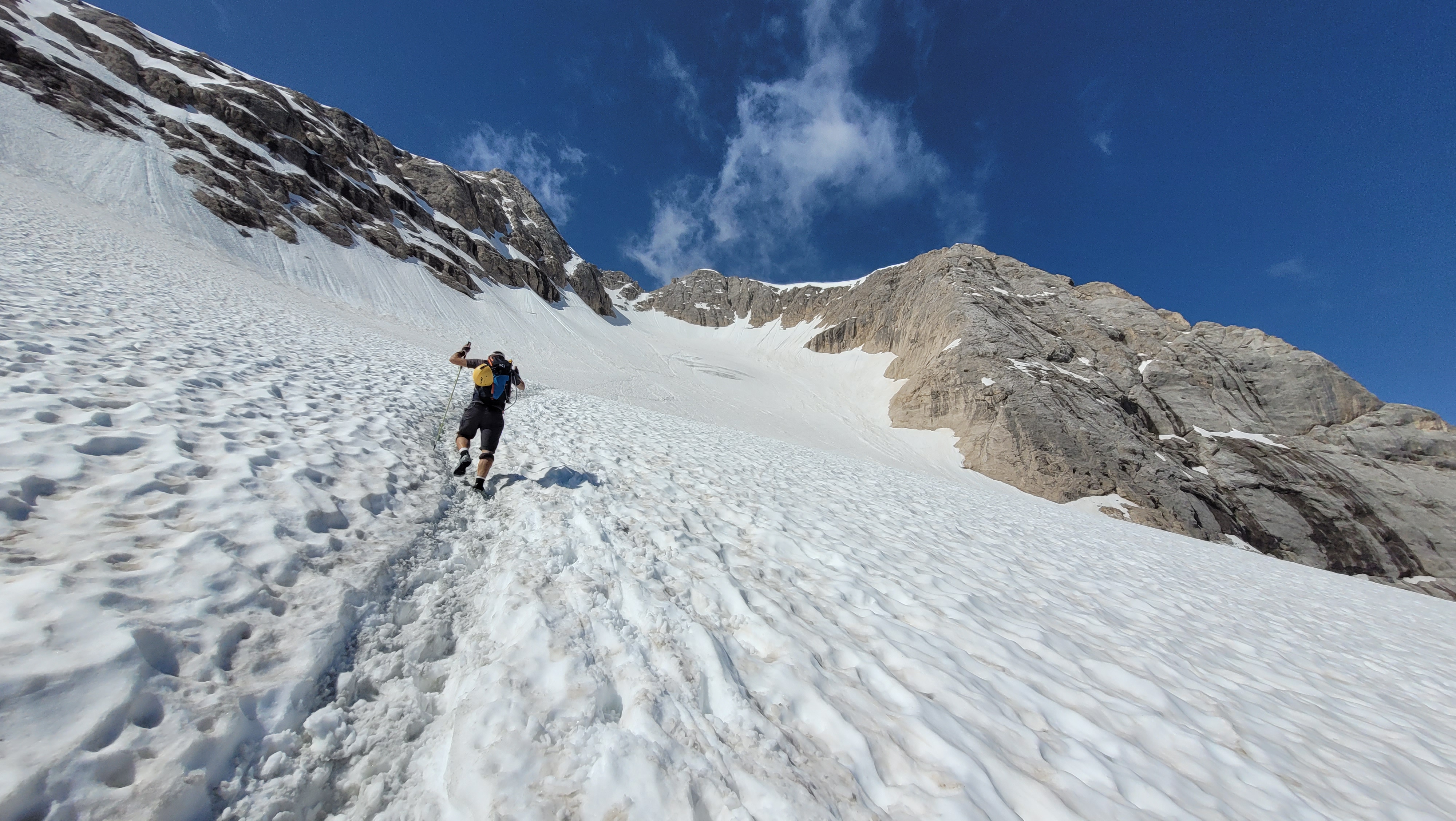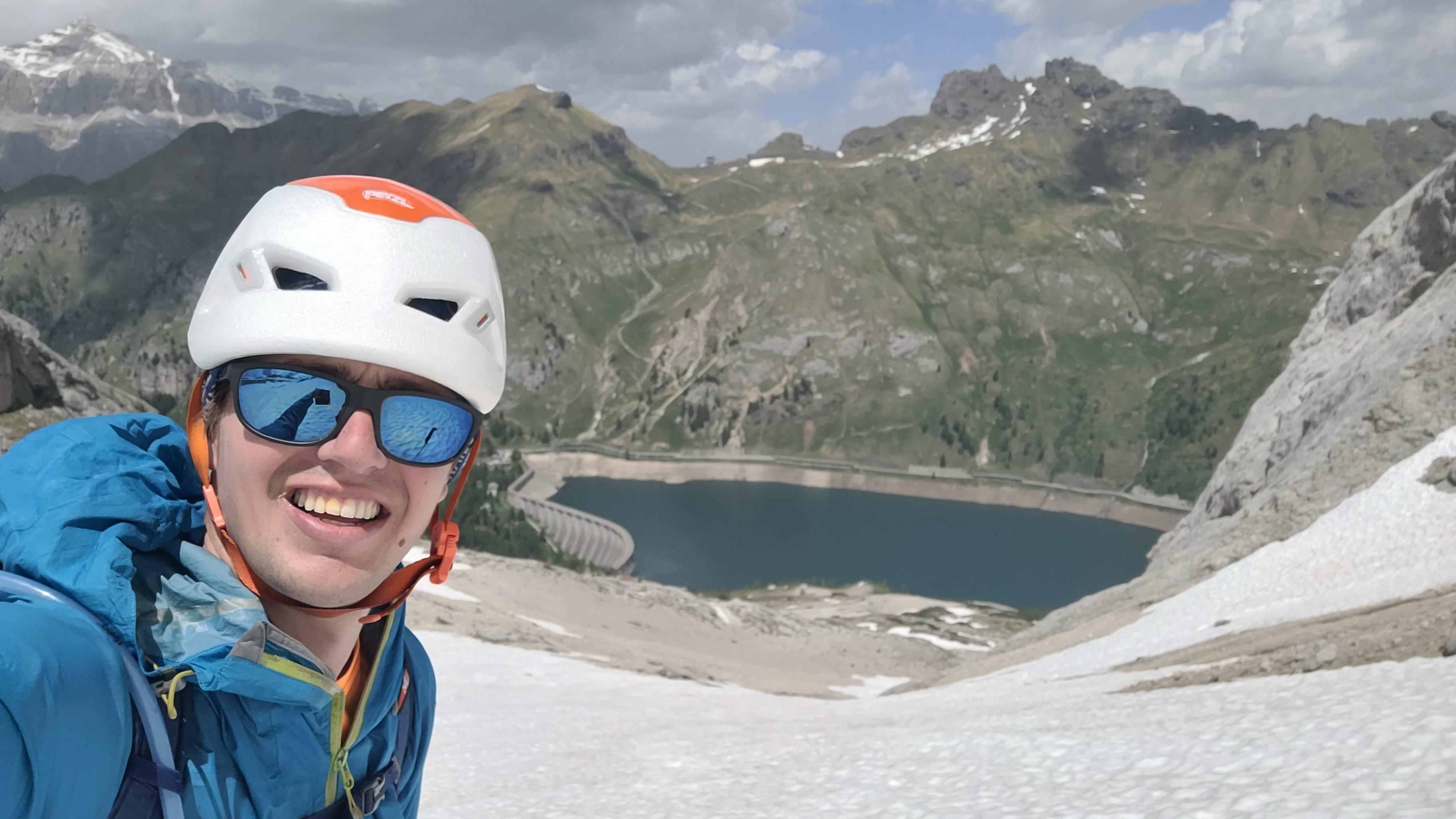 S turo sva začela na parkirišču nad jezerom Fedaia (2100 m). Do snega sva hodila 20 min. Nato sem jaz stopil na smuči, Žiga pa se je peš pobijal navkreber. Sledila sva trasi žičnice do koče Pian di Fiacconi (2626 m), ki jo je podrl snežni plaz. Nato sva hitro dosegla spodnji rob ledenika. Večino ledenika je še pod snegom. V osrednjem delu pa že grozijo razpoke. Zato sva se zaradi varnosti strogo držala špure. Sneg je bil dovolj mehak, da derez nisva potrebovala. Na SZ robu ledenika (3170 m), pred vstopom v ferato, sva pustila smuči in se opremila s samovarovalnimi kompleti. Sama ferata je lahka (težavnost B) in odlično zavarovana. Poteka po žlebu čez steno v katerem je bil mestoma led. Zato so dereze in cepin bili zelo na mestu. Od vrha ferate je nato do glavnega vrha Marmolade – Punta Penia (3343 m) – še 250 višincev hoje po položnem zasneženem slemenu. Na vrhu gore se nisva zadržala prav dolgo, saj so nenadoma nastali črni nevihtni oblaki. Po isti poti sva sestopila do smuči. Jaz sem nato odsmučal 200 višincev navzdol po ledeniku. Žiga pa je isto pot odsmučal na čevljih. Sneg je bil gnil. Nato sva prek ledenika prečila proti vzhodu in se vzpela 350 višincev na Punta Rocco – z višino 3309 m drug najvišji vrh v masivu Marmolade. Nanj trenutno vozi gondola trume turistov. Ko so me videli s smučmi, sem bil za njih kar neke vrste atrakcija. Končno je sledil smučarski spust v dolino. Sneg je mehak, vendar ni zaviral. Uživancija se konča 100 višinskih metrov nad parkirišče, kar je pomenilo slabih 10 min peš do avta. Skupno sem danes smučal 1400 višincev. #107. Vrhunski skok (smučanje) v poletje je to bil.
