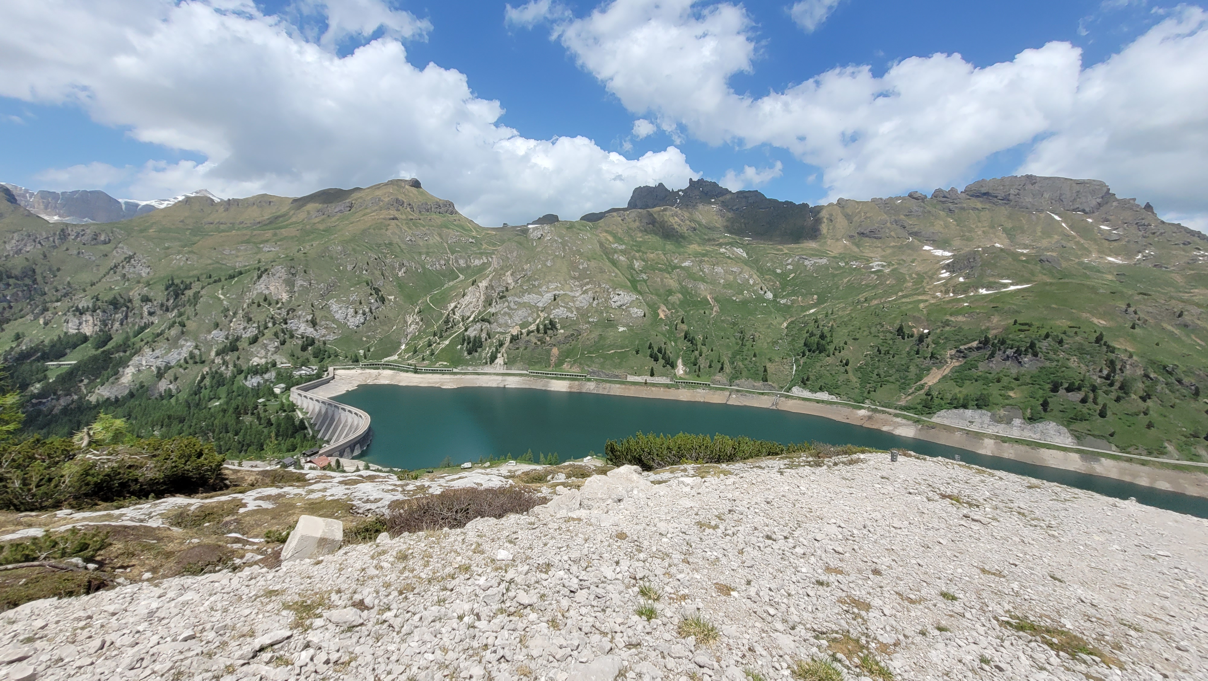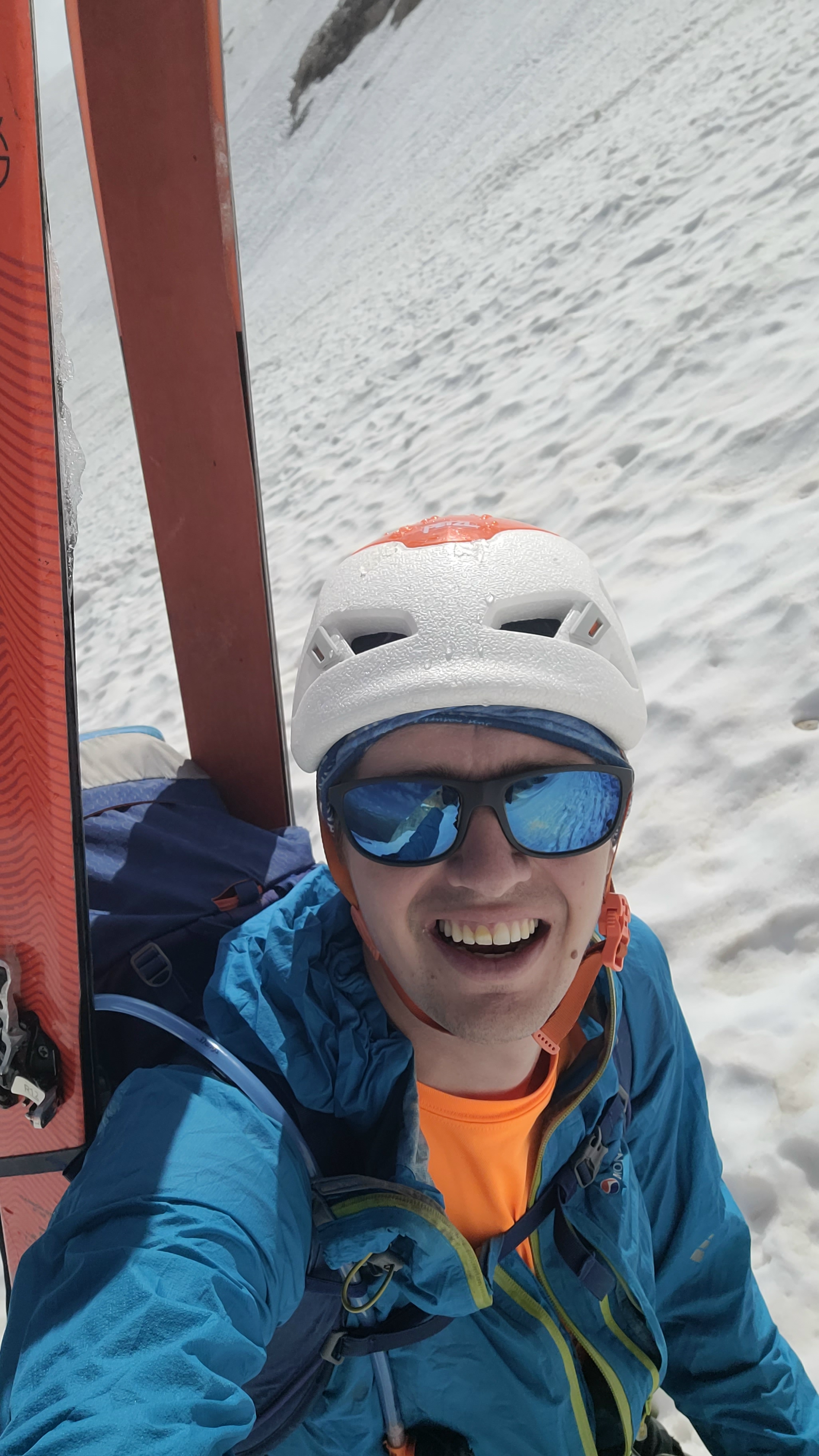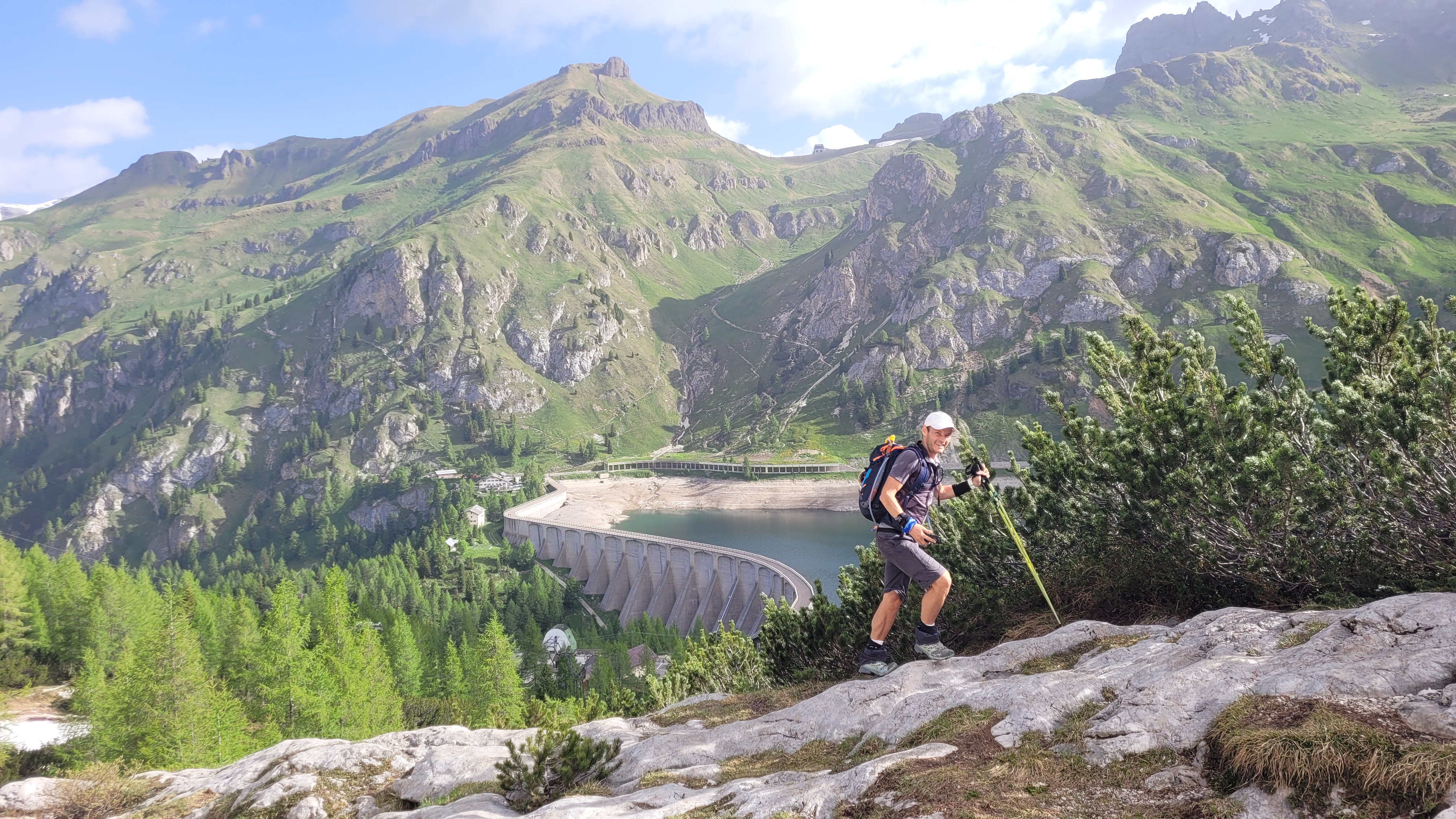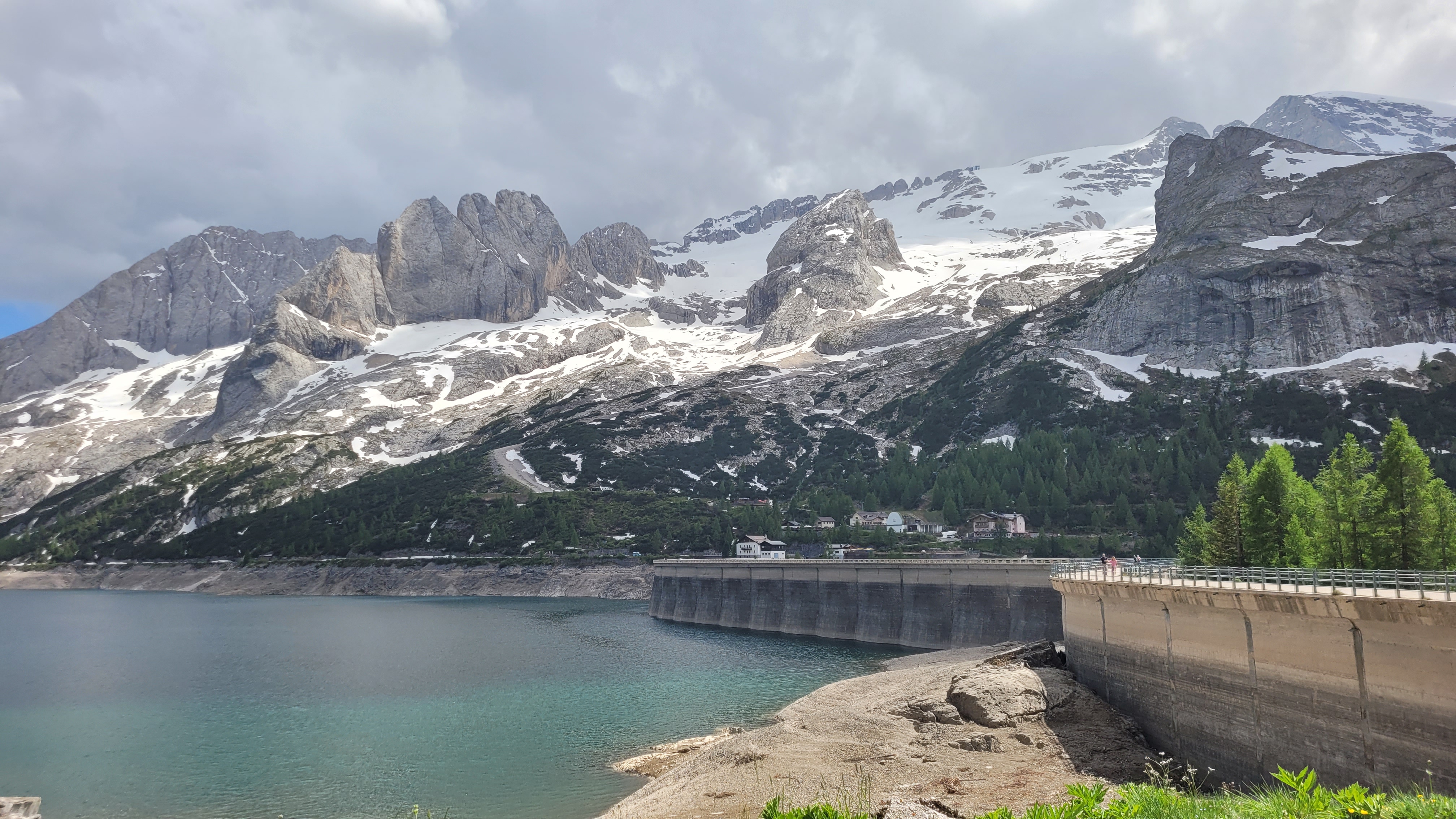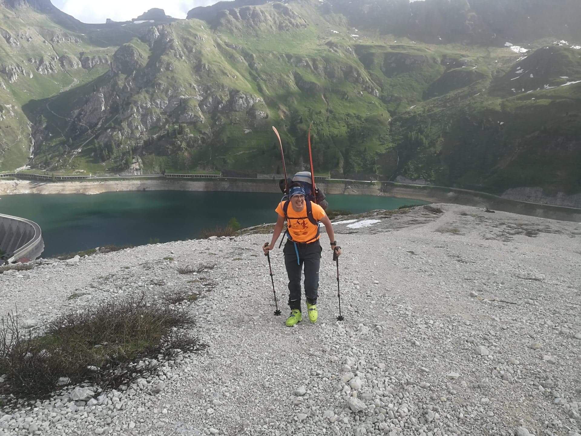 S turo sva začela na parkirišču nad jezerom Fedaia (2100 m). Do snega sva hodila 20 min. Nato sem jaz stopil na smuči, Žiga pa se je peš pobijal navkreber. Sledila sva trasi žičnice do koče Pian di Fiacconi (2626 m), ki jo je podrl snežni plaz. Nato sva hitro dosegla spodnji rob ledenika. Večino ledenika je še pod snegom. V osrednjem delu pa že grozijo razpoke. Zato sva se zaradi varnosti strogo držala špure. Sneg je bil dovolj mehak, da derez nisva potrebovala. Na SZ robu ledenika (3170 m), pred vstopom v ferato, sva pustila smuči in se opremila s samovarovalnimi kompleti. Sama ferata je lahka (težavnost B) in odlično zavarovana. Poteka po žlebu čez steno v katerem je bil mestoma led. Zato so dereze in cepin bili zelo na mestu. Od vrha ferate je nato do glavnega vrha Marmolade – Punta Penia (3343 m) – še 250 višincev hoje po položnem zasneženem slemenu. Na vrhu gore se nisva zadržala prav dolgo, saj so nenadoma nastali črni nevihtni oblaki. Po isti poti sva sestopila do smuči. Jaz sem nato odsmučal 200 višincev navzdol po ledeniku. Žiga pa je isto pot odsmučal na čevljih. Sneg je bil gnil. Nato sva prek ledenika prečila proti vzhodu in se vzpela 350 višincev na Punta Rocco – z višino 3309 m drug najvišji vrh v masivu Marmolade. Nanj trenutno vozi gondola trume turistov. Ko so me videli s smučmi, sem bil za njih kar neke vrste atrakcija. Končno je sledil smučarski spust v dolino. Sneg je mehak, vendar ni zaviral. Uživancija se konča 100 višinskih metrov nad parkirišče, kar je pomenilo slabih 10 min peš do avta. Skupno sem danes smučal 1400 višincev. #107. Vrhunski skok (smučanje) v poletje je to bil.