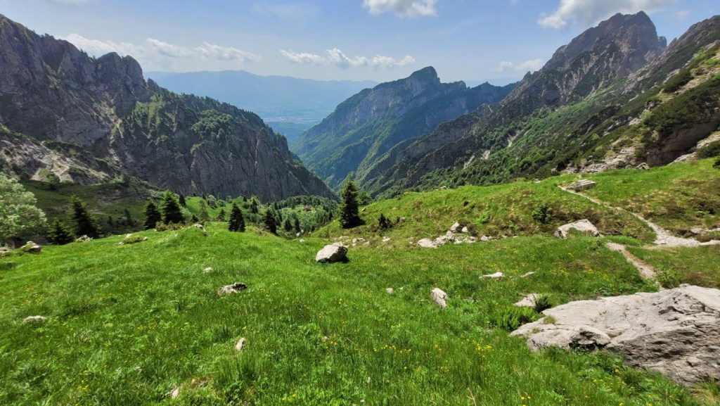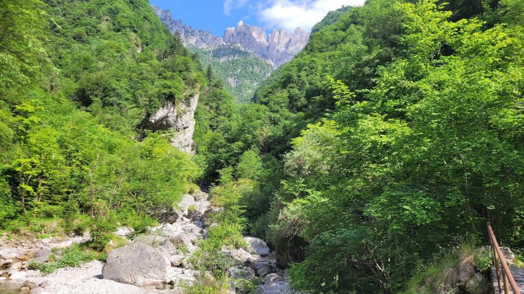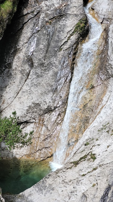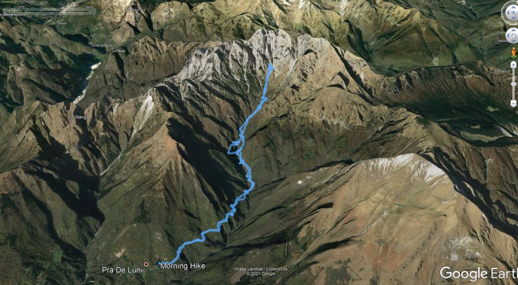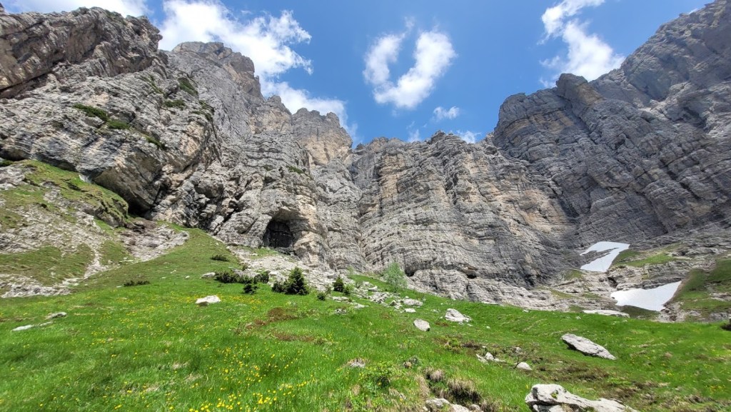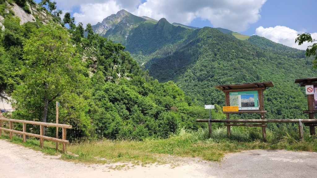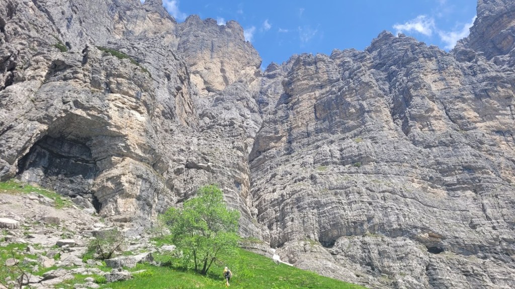 Cilj ture je bila ferata Zacchi na goro Schiara (2565 m) v Bellunskih Dolomitih. Izhodišče je v zaselku Case Bertot (707 m), nedaleč od mesta Belluno. Pot najprej poteka skozi zelo dolg kanjon do koče Rifugio 7° Alpini (1491 m). Naj vas nizka višina koče ne zavede. Do sem je zares daleč, saj se pot vmes nekajkrat tudi spusti. Midva sva kar hitro tekla, pa sva do koče potrebovala kar uro in pol. Pot poteka ves čas v senci in mimo slapov. Sicer pa sama pot ni nič kaj posebej zanimiva. Šele pri koči se prvič odpre razgled na mogočno stenje Schiare, kjer poteka omenjena ferata. Od koče je do vstopa v ferato še pol ure hoje. Žal sva že po prvih 100 m ferate morala obrniti, ker sva v grapi naletela na snežišče (zimske opreme pa nisva imela). Ker ni druge poti, sva sestopila (tekla) po isti poti.
