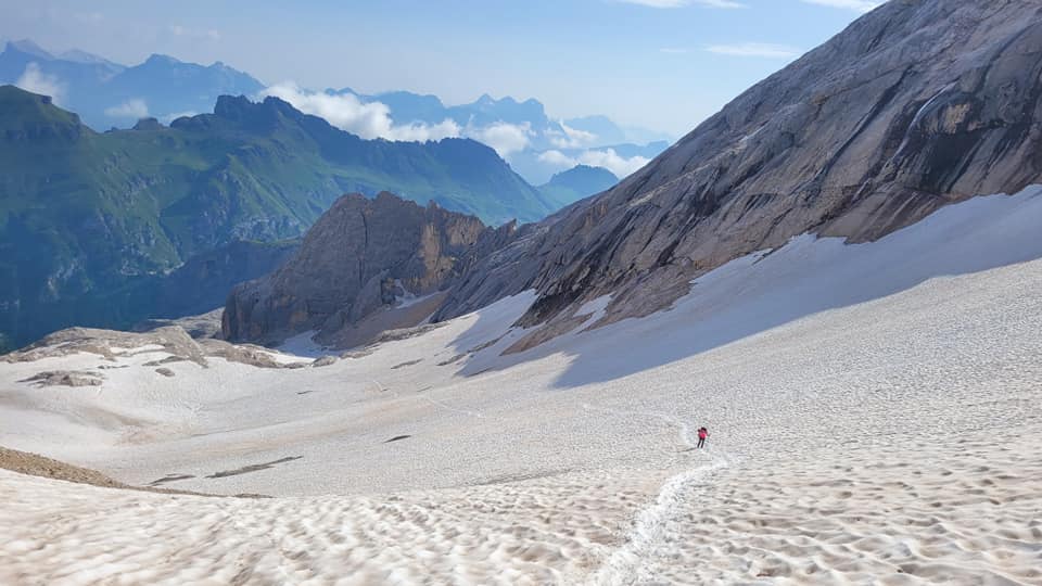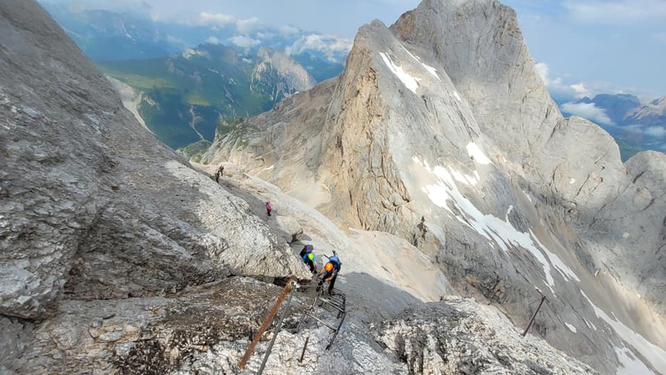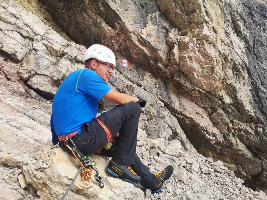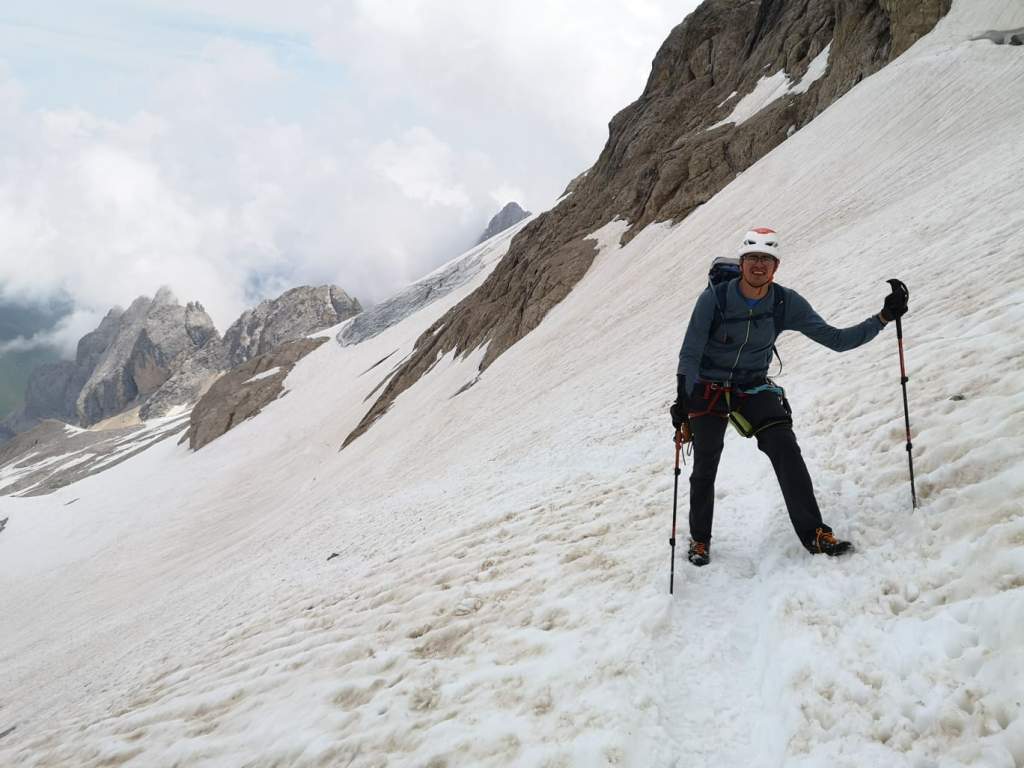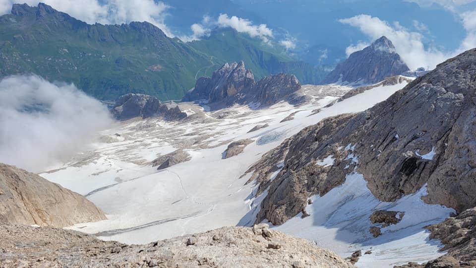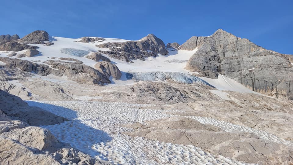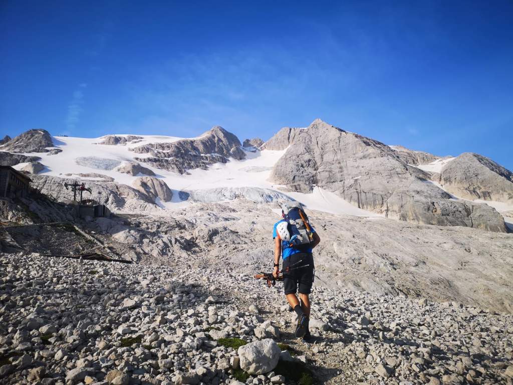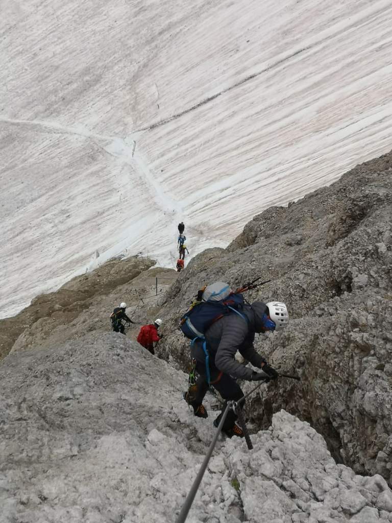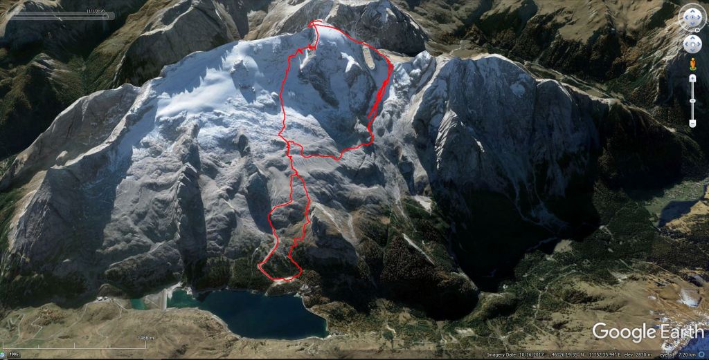 Z izhodišča nad jezerom Fedaia najprej do koče Pian del Fiacconi. Nato pa sva nadaljevala po poti 606 proti škrbina Forcella Marmolada. Pot pred začetkom ferate preči večje snežišče. Vendar zaradi južnega snega zimska oprema tokrat ni bila potrebna. Nato se začne ferata, ki je po težavnosti med lažjimi (B/C). Na poti je ogromno skob in lestev. Snega na ferati ni bilo. Ferata pripelje na glavni vrh Marmolade – Punta Penio (3343 m). Sestopila sva po lažji ferati (težavnost B) na ledenik. Na ledeniku je bilo potrebno nekaj dodatne previdnost, ker špuro sekajo ledeniške razpoke. Nazaj na izhodišče sva sestopila po smučarski progi, ki je za hojo navzdol bolj udobna od planinske poti.