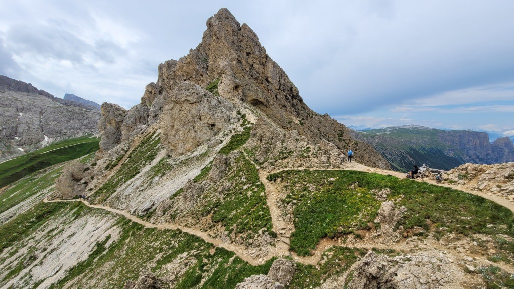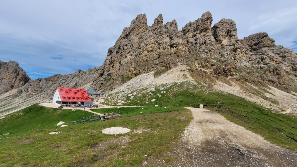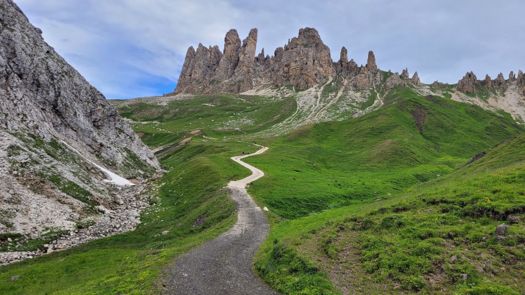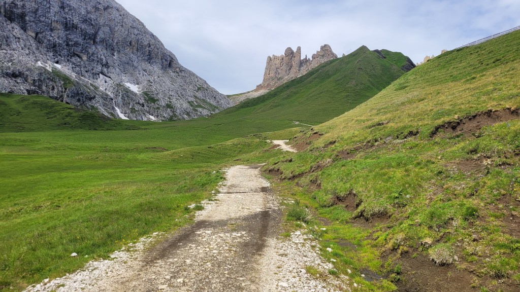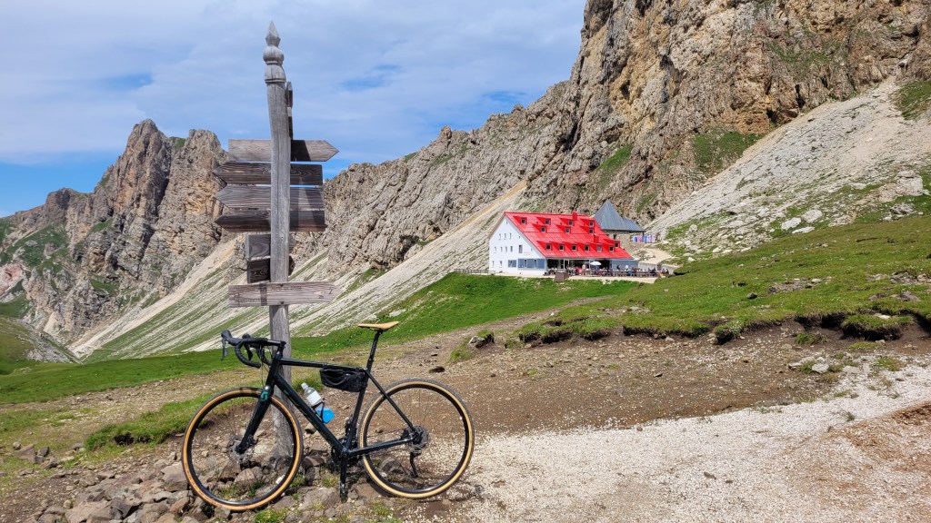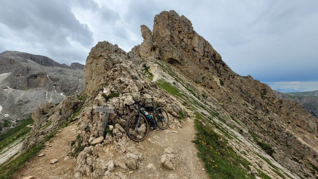 S kolesarjenjem sem začel v Canezeju. Po glavni cesti sem se spustil do vasi Campitello. Tu pa sem zavil desno v dolino Val Duron. Že od samega začetka je cesta makadamska. Prve 4 km do koče Michelluzzi je cesta zelo strma, saj sploh ni serpentin. Po dolini sem nadaljeval do njenega zatrepa. Tu cesta postane slabša in spet zelo strma. Zaradi grušča ni bilo vse vozno za gravel. So pa razgledi vse lepši. Kolo sem pririnil do koče Alpe di Tires (2440 m). Nato pa sem po atraktivni poti nadaljeval še na škrbino Rosszahnscharte (2490 m). Zaradi izpostavljenosti poti sem bil med vožnjo kar rahla atrakcija za mimoidoče planince. Ampak mene ni skrbela toliko pot, kot pa vreme, ki se je naglo začelo slabšati. Spustil sem se kolikor se je le hitro dalo in pri tem prehitel celo dva kolesarja z MTB kolesi. Za las mi je uspelo prehiteti nevihto. 1100 višincev, 30 km.