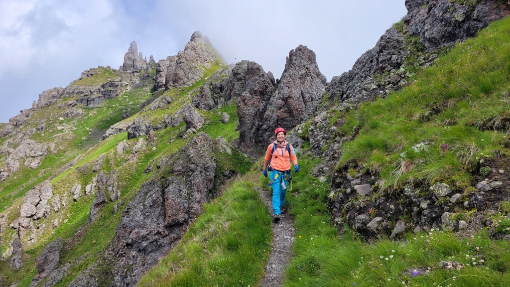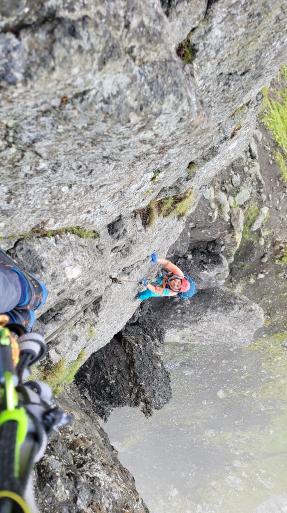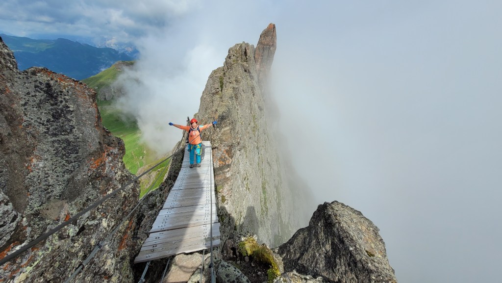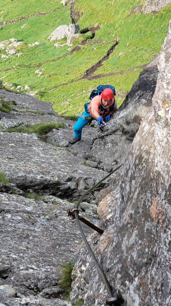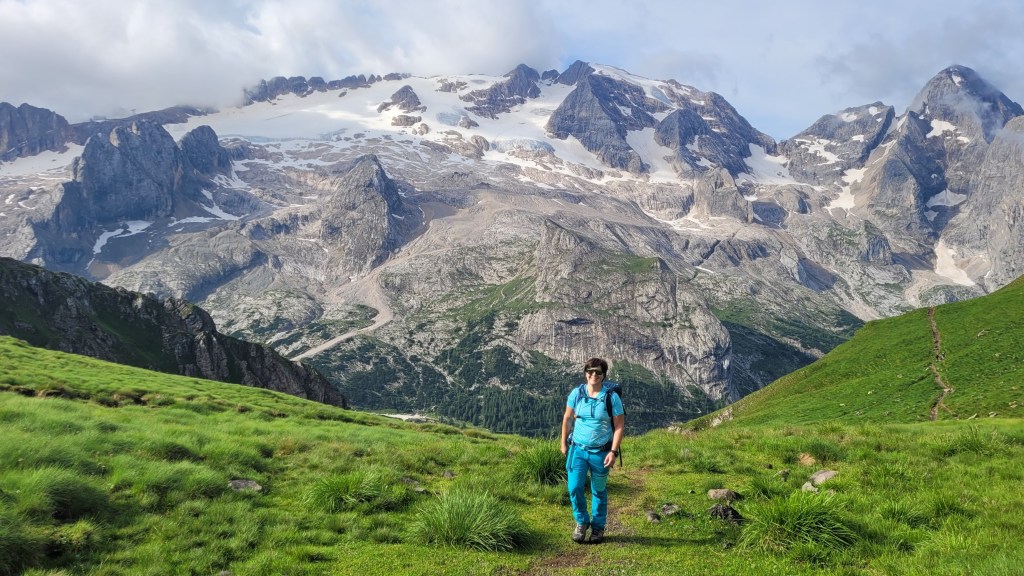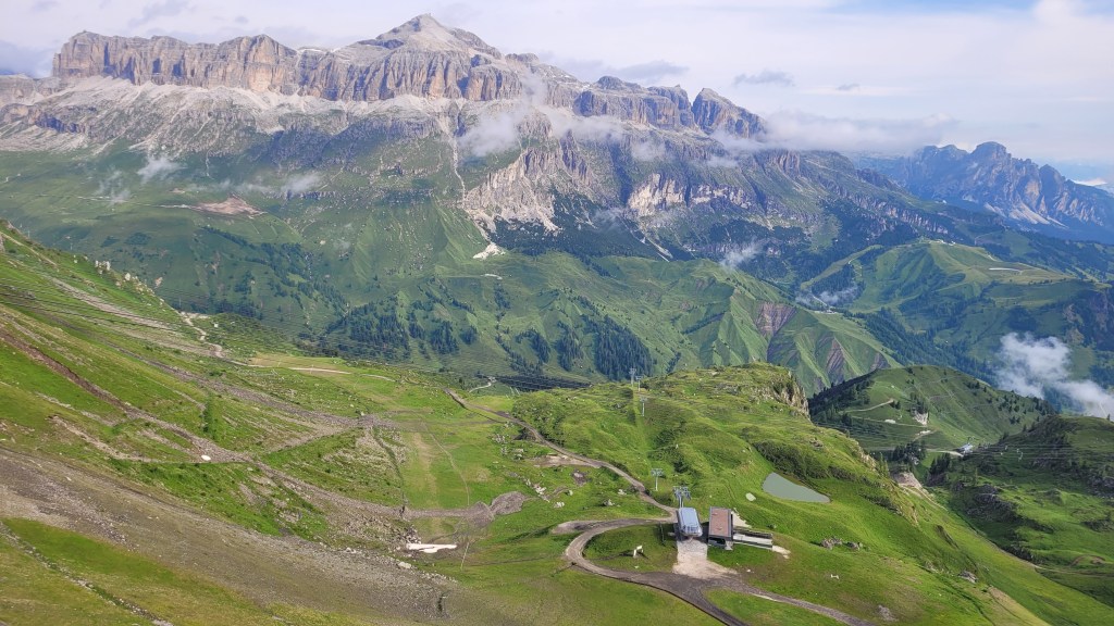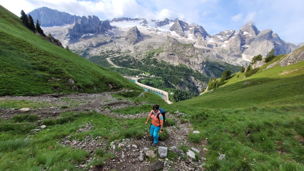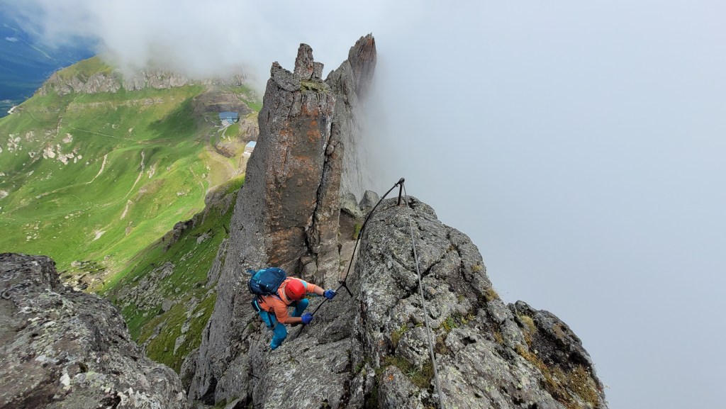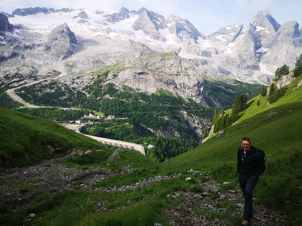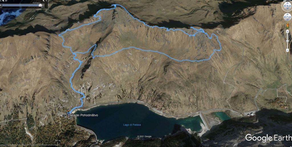 Za danes je bilo napovedano slabo vreme s plohami in nevihtami. Zato sva potrebovala cilj v Dolomitih, kjer je turo mogoče v primeru poslabšanja vremena hitro skrajšati. Kot nalašč za tako vreme se je izkazala ferata Trincee, ker poteka čez štiri razgledne skalne stolpe in z vsakega je mogoče v primeru sile sestopiti v dolino. Izhodišče za turo predstavlja zahodni rob jezera Fedaia (2057 m). S tod sva se povzpela do koče Luigi Gorzia (2478 m), od koder je še 15 min hoje do začetka ferate. Najtežji del ferate je že na samem začetku (C/D). Nato se težavnost giblje večinoma okrog B/C – s posameznima mesti C (tudi navzdol). Ferata poteka skorajda ves čas po grebenu. Zato so razgledi res lepi: na jug na Marmolado in na sever na Piz Boe in pogorje Sella. Ferata vodi čez 4 večje skalne stolpe, ostale pa iz meni nerazumljivega razloga obide. Najvišji vrh poti je stolp La Mesola (2727 m). Drugi stolp (Saso del Eremita) sva izpustila, saj poteka nekoliko izven poti. Ferata čez tretji in četrti stolp je lahka; večino časa se kar hodi po običajni peš poti. Čisto na koncu ferate je zelo dolg tunel, ki je v resnici ostanek kaverne iz časa 1. svetovne vojne. Tunela je za kakšnih 10 min hoje, zato nikar brez naglavne svetilke. Ko prilezemo iz tunela, se ferata konča pri bivaku Botanini (2552 m). Midva pa sva se od bivaka povzpela še na bližnji vrh Mesolina (2642 m). Vreme se je vmes začelo (kot po napovedi) naglo kvariti. Zato sva po geološki poti urno sestopila nazaj na izhodišče. Ta pot mi je zelo znana, saj sem po njej 3 leta nazaj tekel na DoloMyths ultra trailu. Takrat sem moral zaradi tekme zelo hiteti in nisem imel časa uživati v razgledih. Danes pa sem popravil “krivico”; vsaj dokler se ni vsula dežna ploh in so se razgledi skrili v megli.